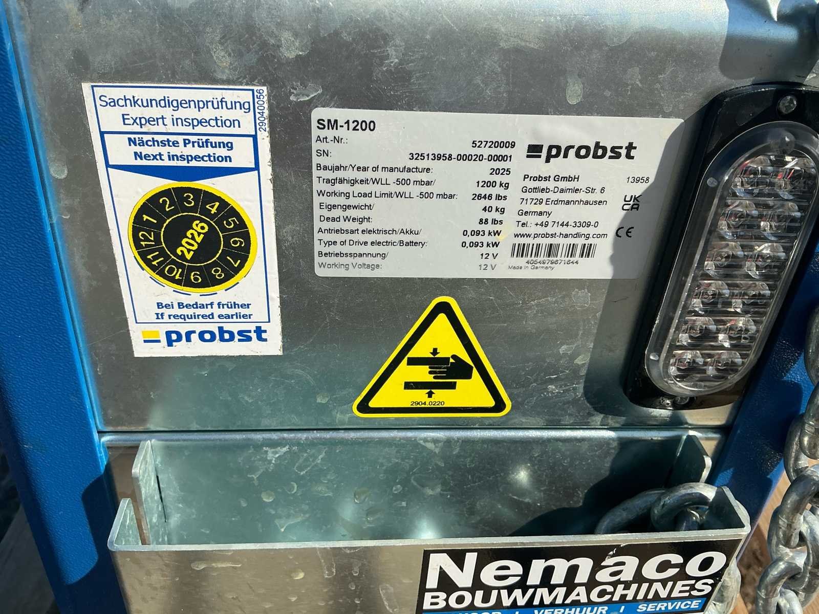 Deze hijsunit is nieuw en heft 1200 kg No Merk: Probst Type: SM 1200 Bouwjaar: 2025 Serienummer: 32513958-00020-00001 Bedrijfsgewicht: 40kg