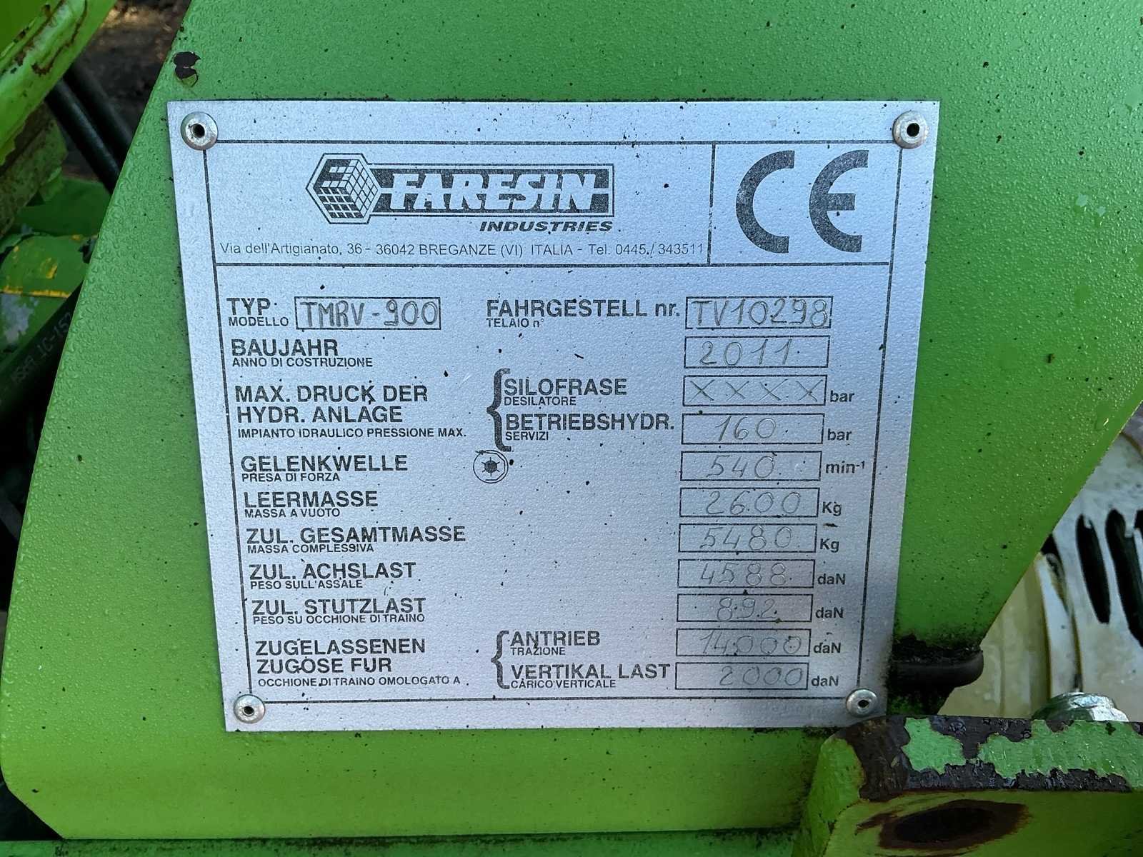 No Merk: Faresin Type: TMRV900 Bouwjaar: 2011 Serienummer: TV10298 Tankinhoud: 9m³ Aantal mengwalsen: 1 Weeginrichting: true Eigen gewicht: 2600kg