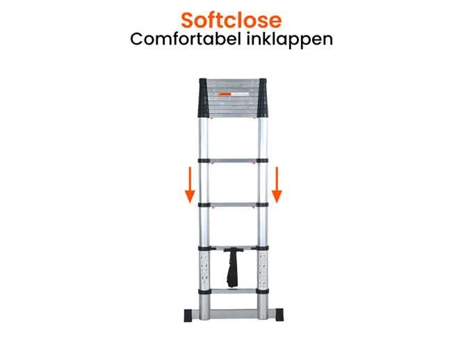 Gewicht 11.7 kg Afmetingen 50 × 380 cm Kleur Zwart/Zilver Werkhoogte 3,80 meter Hoogte ingeklapt 91 centimeter Aantal treden 13 Ruimte tussen treden 30 centimeter Softclose Ja Stabiliteitsbalk Ja Keurmerken CE, EN131-6 Merk Kibani No