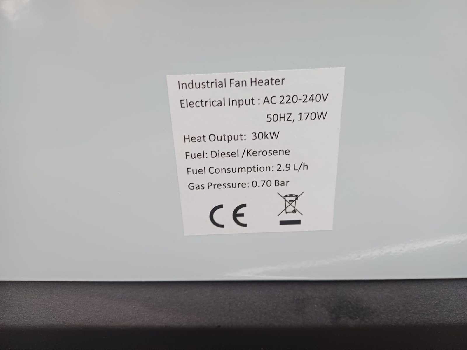 Model: LXC30 Voeding: 230V/50Hz wisselstroom Vermogen: 30 kW (105.000 BTU/h of 25.800 kcal/h) Luchtstroom: 750 m³/h Brandstoftank: 18 liter Brandstof: Diesel of lichte brandolie Brandstofverbruik: 2,9 liter per uur Motorvermogen: 170 Watt Brandstofpompdruk: 0,7 bar Bedrijfsduur: 6,2 uur Gewicht: 18,5 kg Afmetingen: 850 x 420 x 480 mm Nee