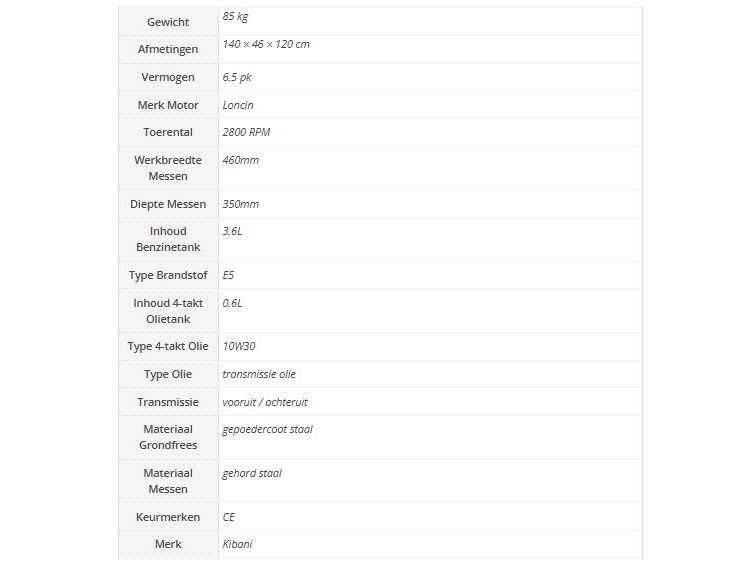 Deze dient nog gemonteerd te worden door de koper. Nee Merk: Kibani Bouwjaar: 2025 Eigen gewicht: 85kg Brandstofmotor aangedreven: true Brandstof: Benzine