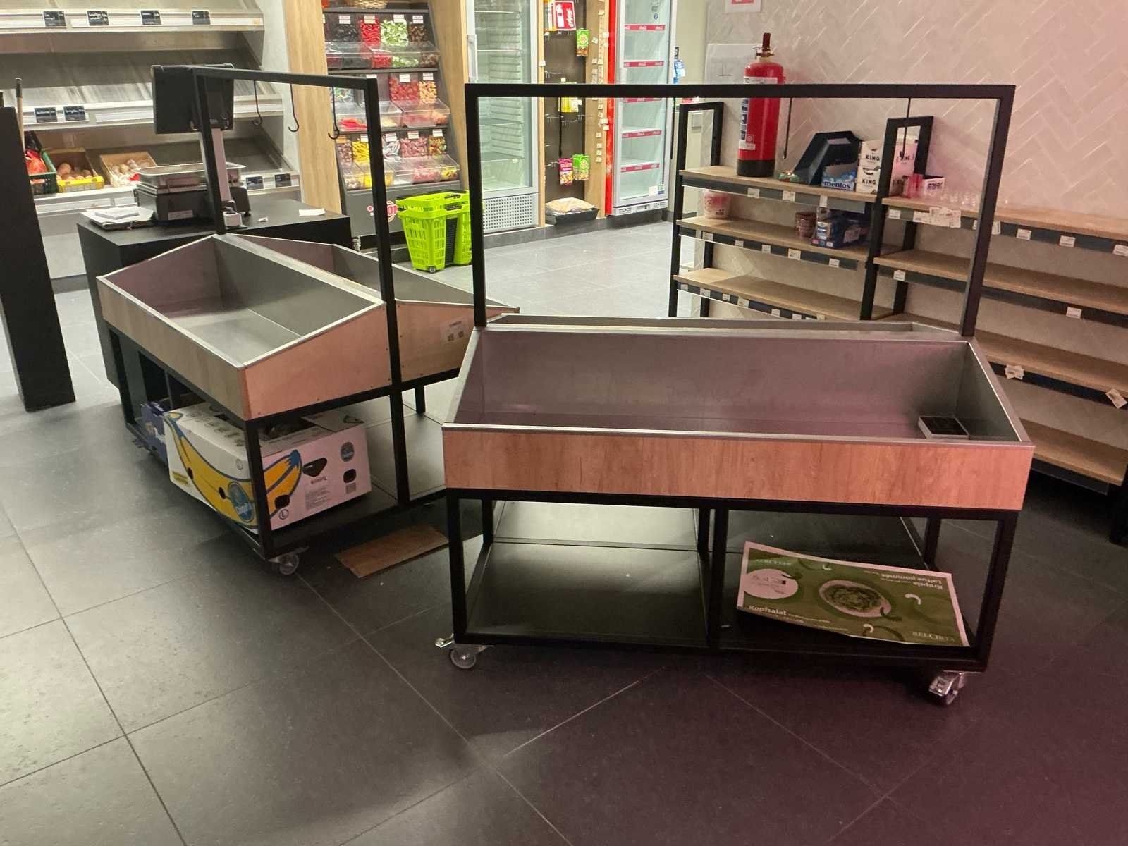 Nieuwe groenten rekken met bovenaan haken om trossen bananen op te hangen.door een schrijnwerker vervaardigd. Deze rekken kunnen ook voor een andere bestemming gebruikt worden. Afmetingen L. 1.27 m, B. 92 cm en H. 90cm. No Bestaande uit: 2 groenten rekken op willetjes met rem. 1e: Groenten rek 2e: Groenten rek