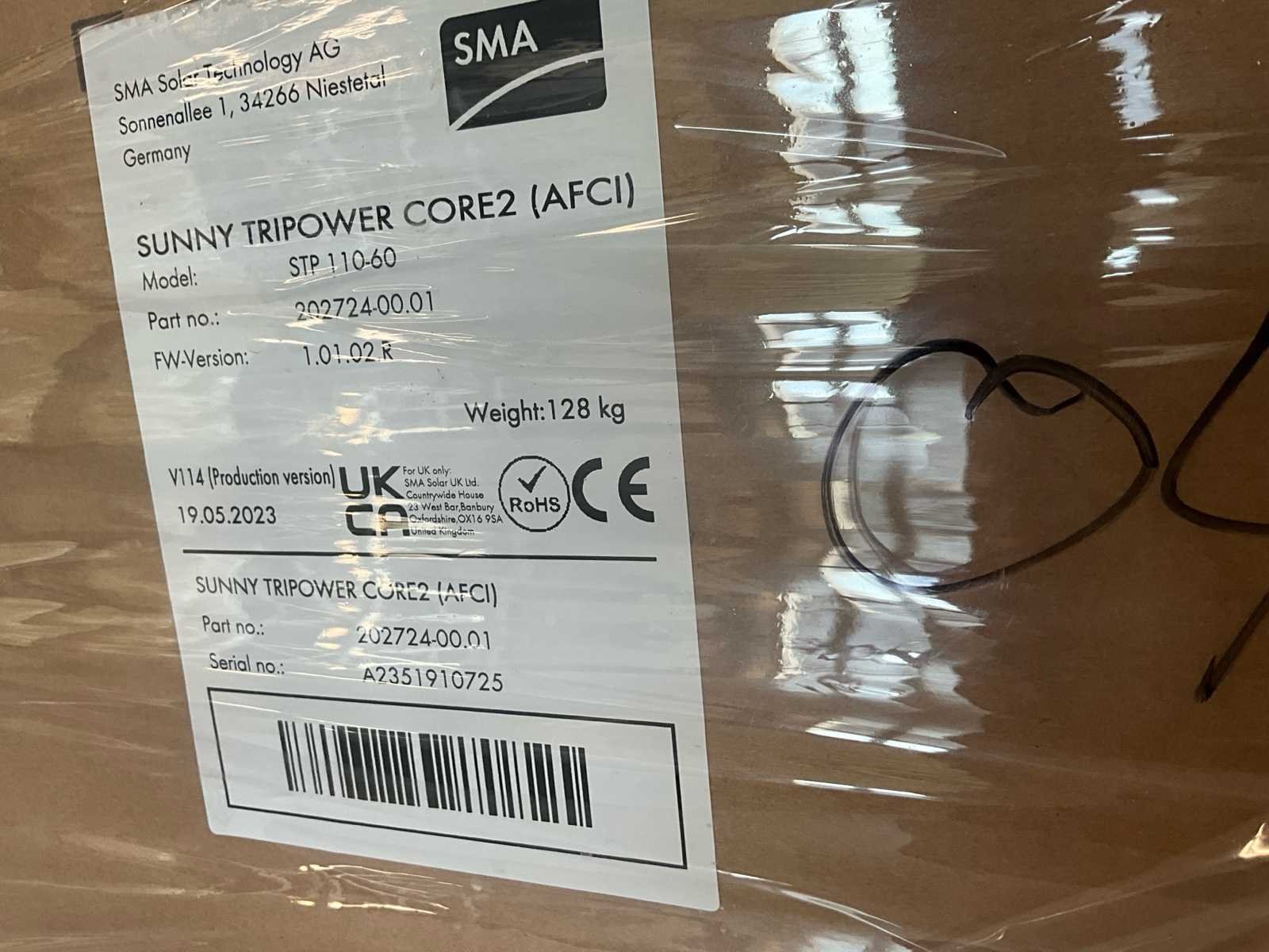 Professionele 3-fase omvormer voor grootschalige PV-installaties (utiliteit, industrie, agrarisch, zonneparken). Uitgevoerd met 12 MPP-trackers en geïntegreerde AFCI-boogdetectie. Nieuw in originele verpakking op pallet (heftruck aanwezig om te laden) - Productiedatum: 19-05-2023 Serienummer: A2351910725 Gewicht: 128 kg Certificeringen: CE, UKCA, RoHS - Elektrische specificaties (model STP 110-60 – fabrieksgegevens: Nominaal AC-vermogen: 110 kW Max. AC-vermogen: ca. 110 kVA Nettype: 3-fase Nominale netspanning: 400 V (3~) Frequentie: 50 / 60 Hz Max. uitgangsstroom: ± 160 A DC-zijde Max. DC-spanning: 1.100 V MPP-spanningsbereik: ca. 500 – 800 V Aantal MPP-trackers: 12 Strings per MPP: 2 (totaal 24 strings) Max. ingangsstroom per MPP: ± 26 A Max. kortsluitstroom per MPP: ± 40 A No Merk: SMA Sunny Tripower CORE2 Type: STP 110-60 Bouwjaar: 2023 3-fase: true Eigen gewicht: 128kg Totale afmeting L: 600mm Totale afmeting Breedte: 300mm Totale afmeting Hoogte: 800mm