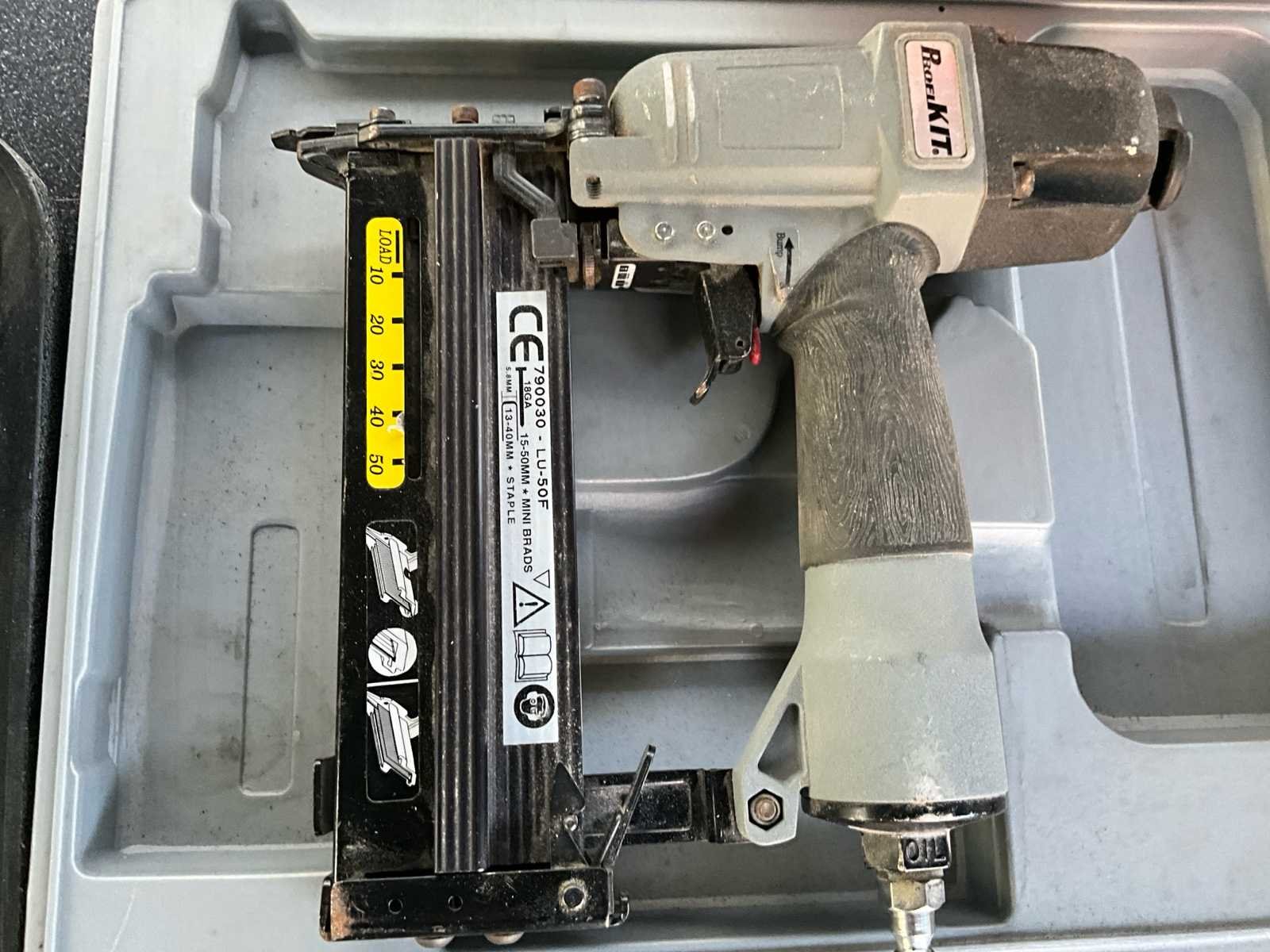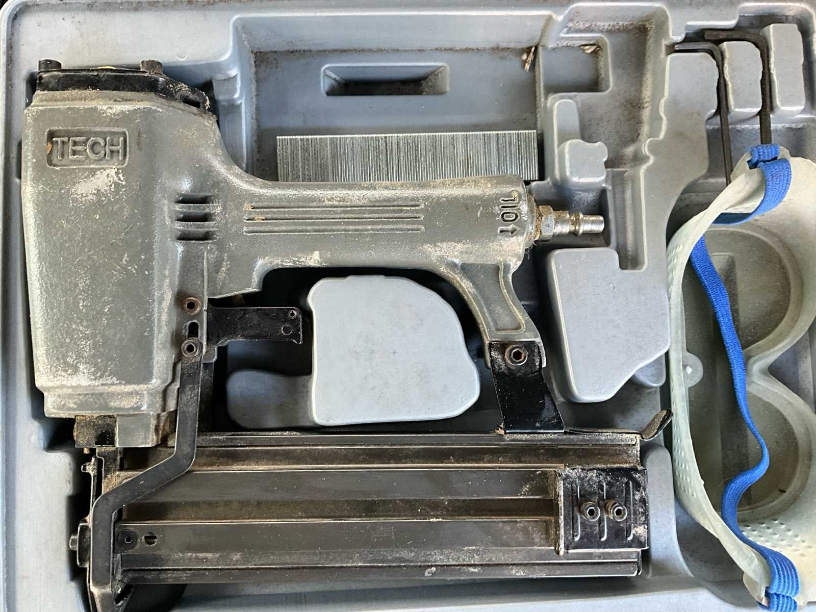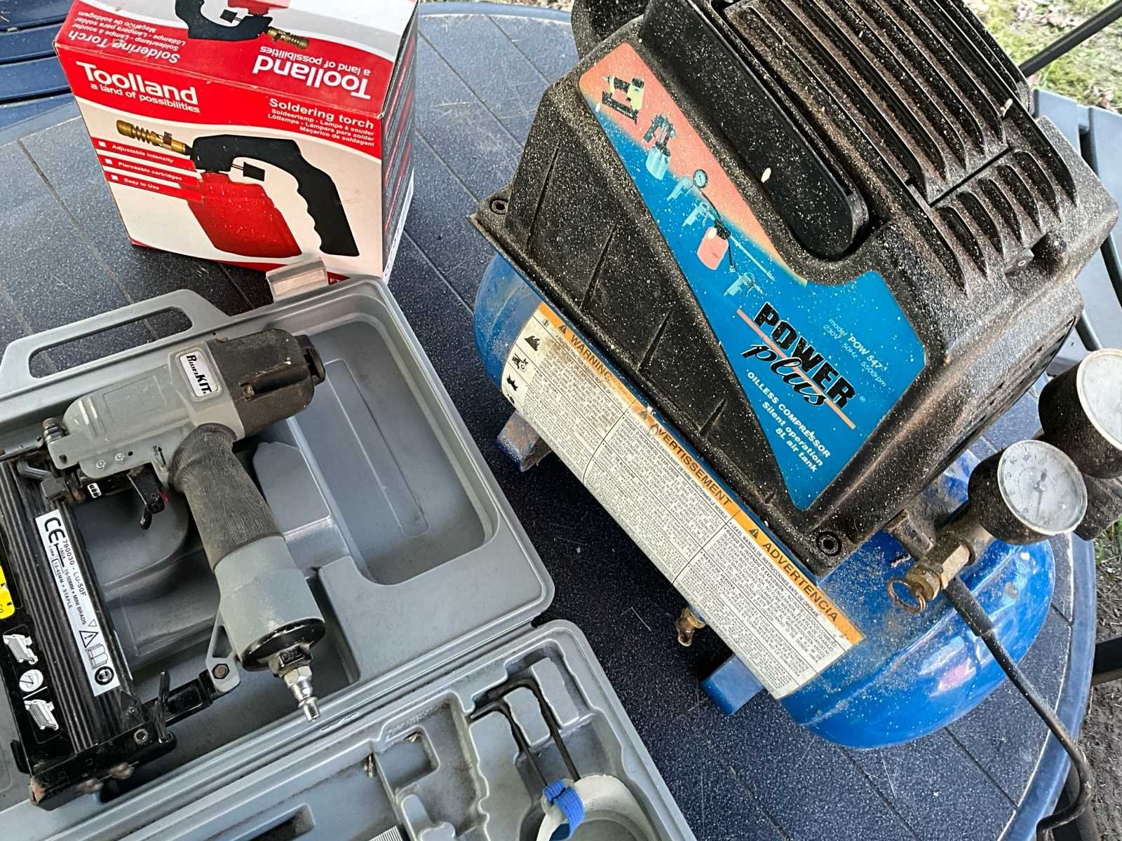 Lot bestaande uit 4 nagelpistolen (3x pneumatisch en 1 electrisch, inclusief batterij en lader) + 1 compressor + 1 soldeerlamp (ongebruikt in verpakking) - alle materialen zijn getest en werkend No