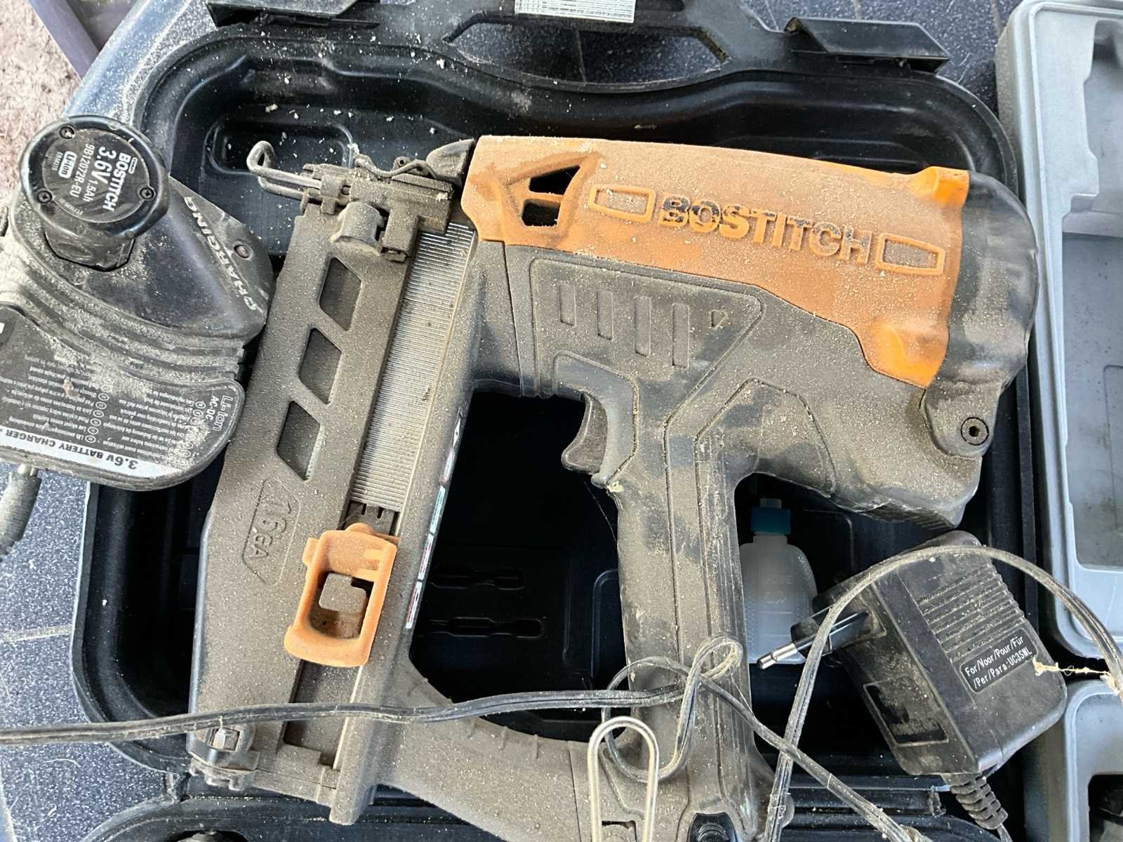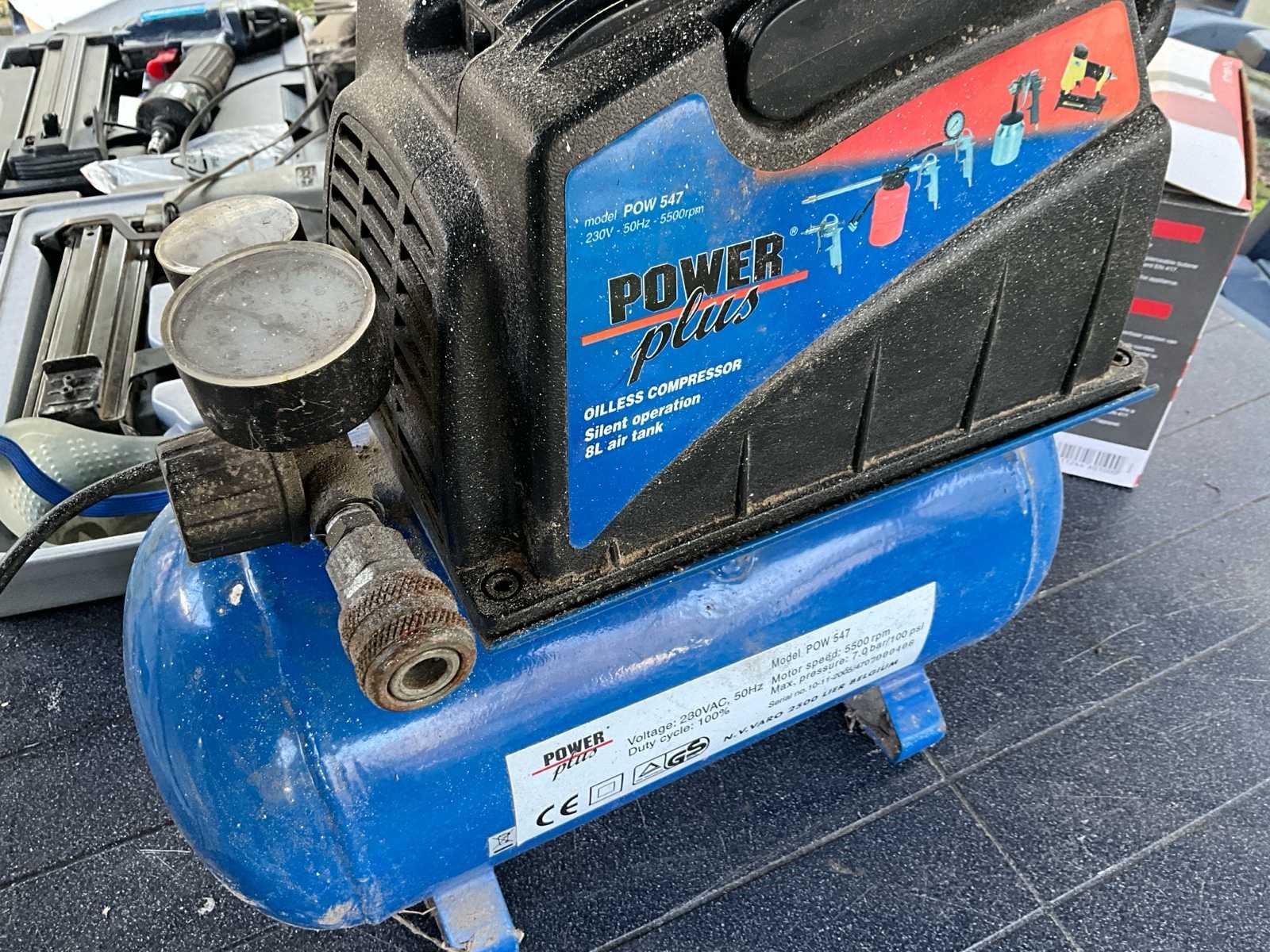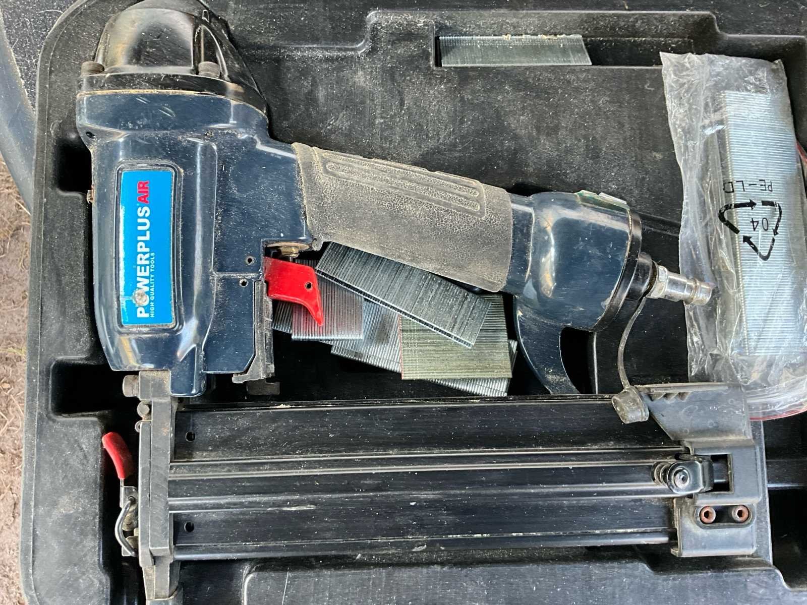 Lot bestaande uit 4 nagelpistolen (3x pneumatisch en 1 electrisch, inclusief batterij en lader) + 1 compressor + 1 soldeerlamp (ongebruikt in verpakking) - alle materialen zijn getest en werkend No