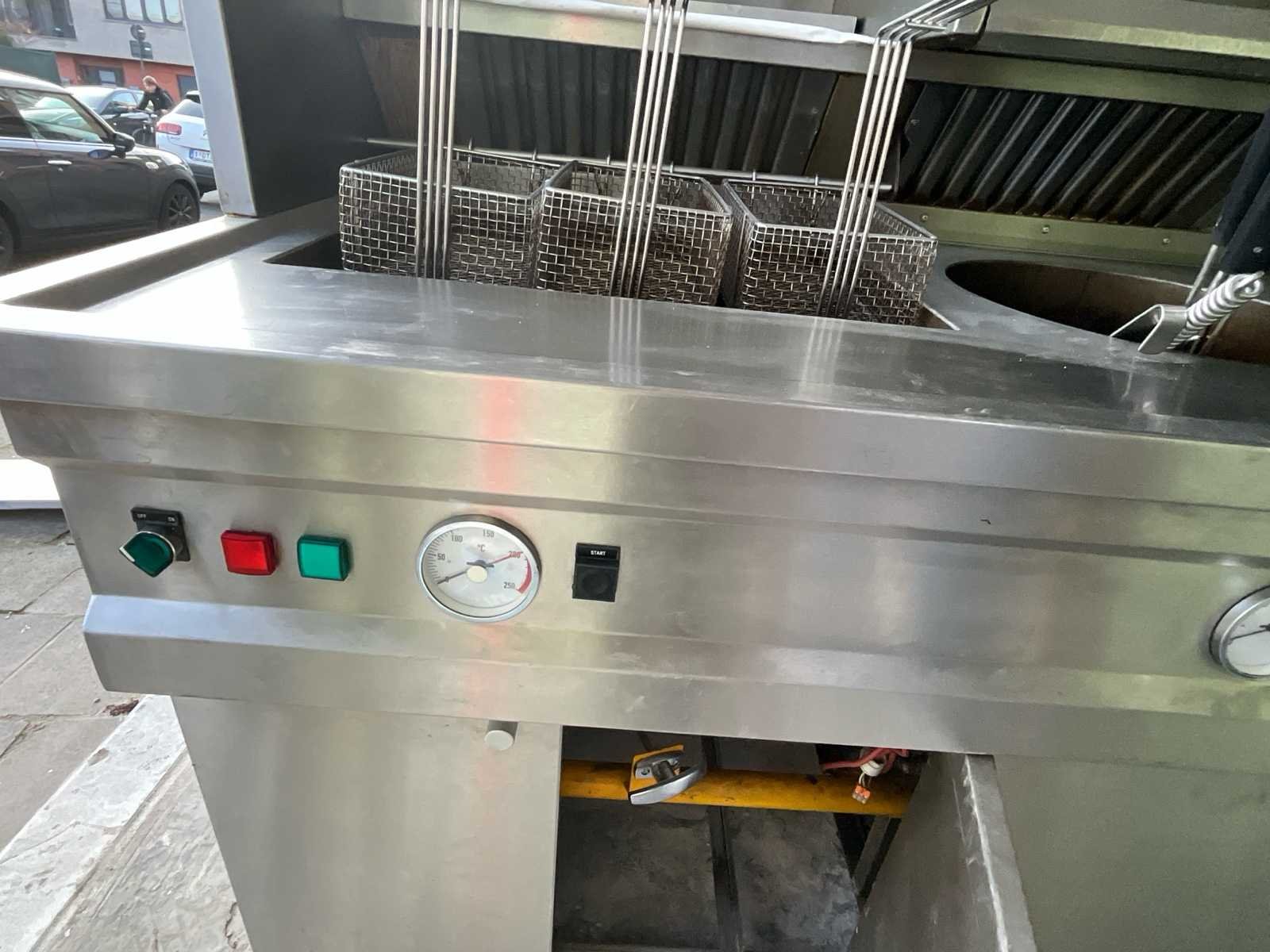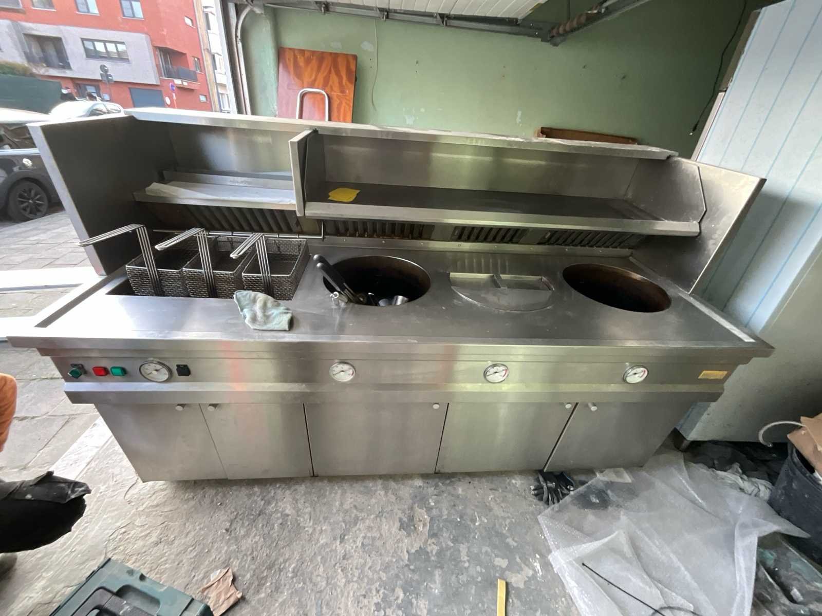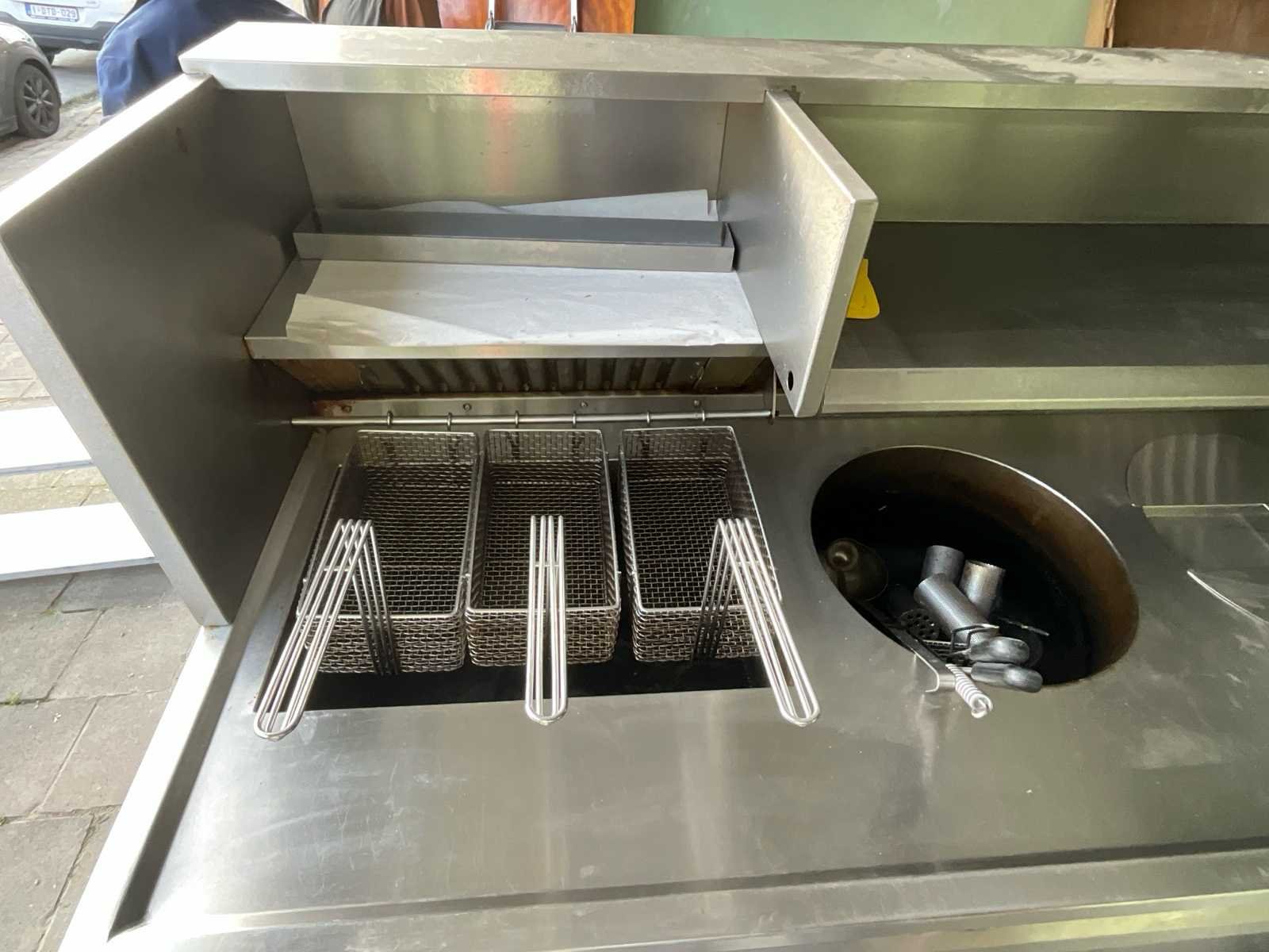 Sinds 5 maand losstaand voor verhuis, hiervoor steeds werkende staat! Inox rek inclusief No Merk: Hegro Model: HFD344 Bouwjaar: 2019 Type: Frituur Lengte: 100cm Breedte: 220cm Hoogte: 180cm Materiaal: Inox Gewicht: 800kg Aantal zones: 4 Vermogen (kW): 84 Gas: true