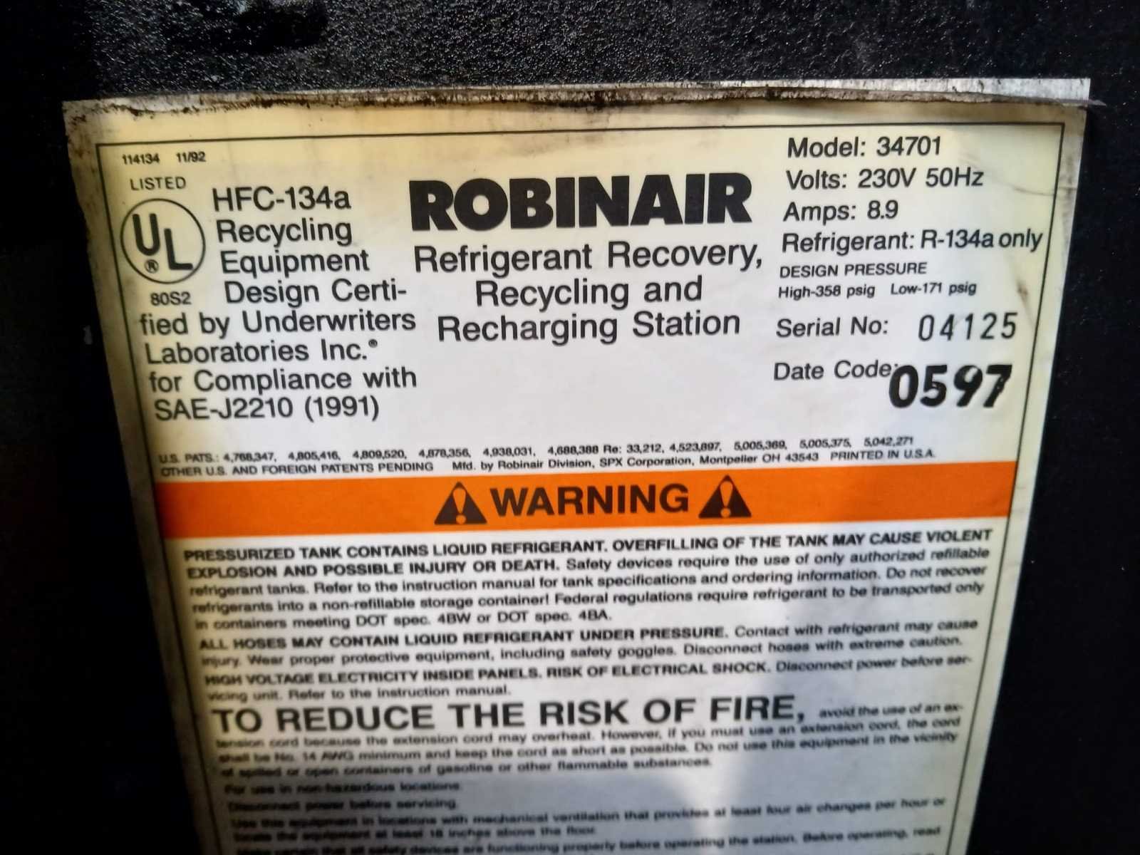 R134A only No Merk: Robinair Type: 34701 Bouwjaar: 1992 Aansluiting: 240V