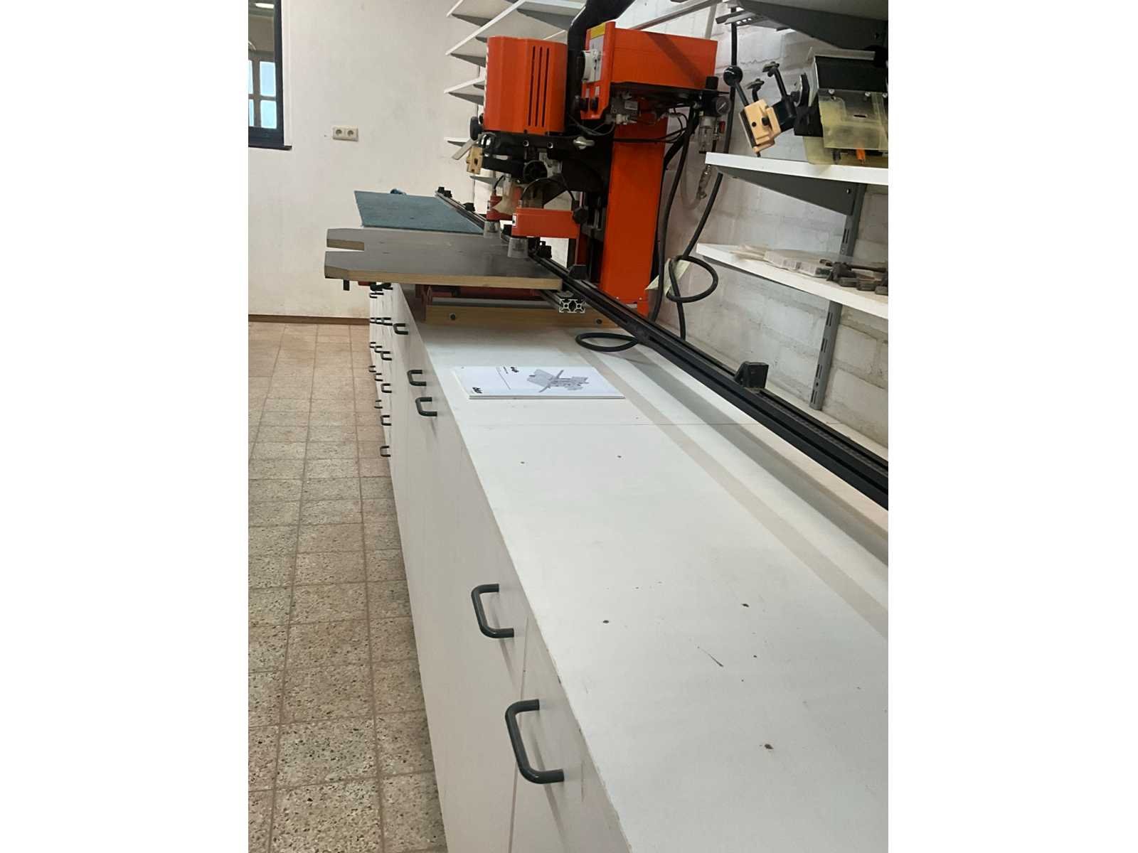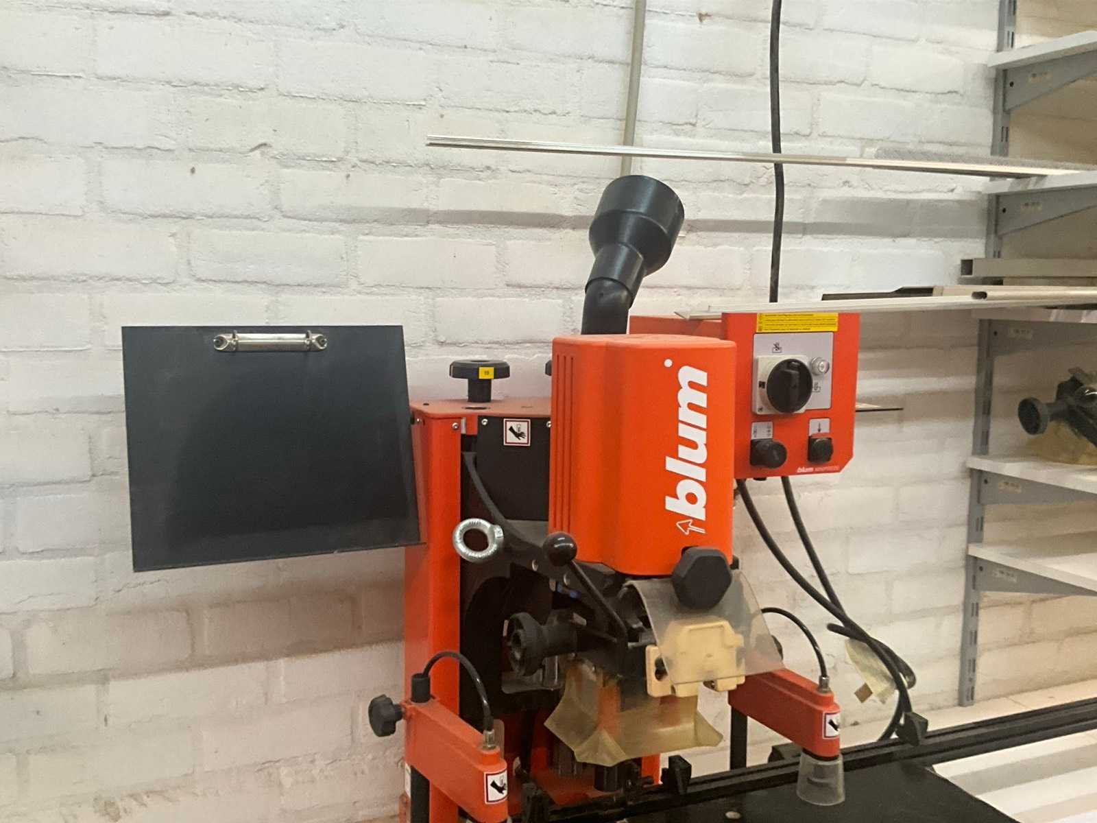 Boor- en beslagmachine met pneumatische aandrijving. Afmetingen zijn van de machine. Totale lengte van de verstelbare schuiflat = circa 500 cm. Compleet met enig toebehoren. Nee Merk: BLUM Type: Minipress Pro Afmeting l: 850mm Afmeting b: 800mm Afmeting h: 900mm