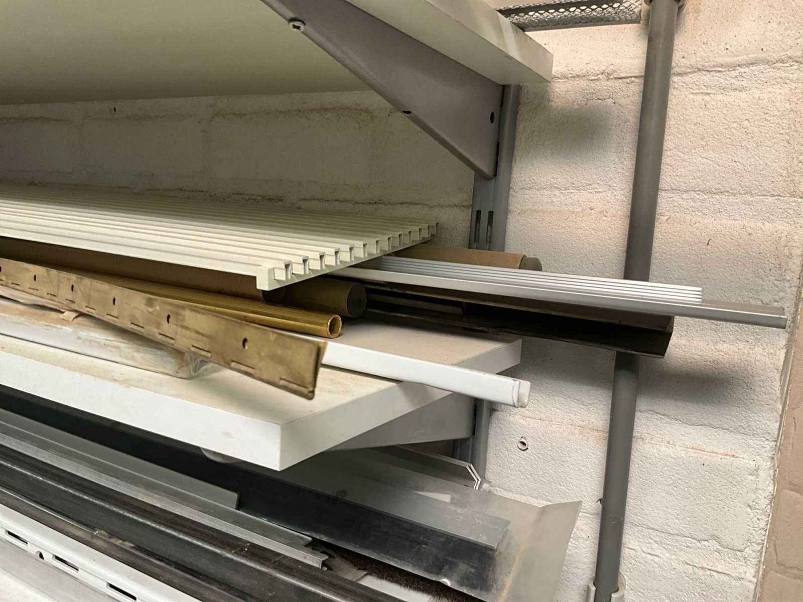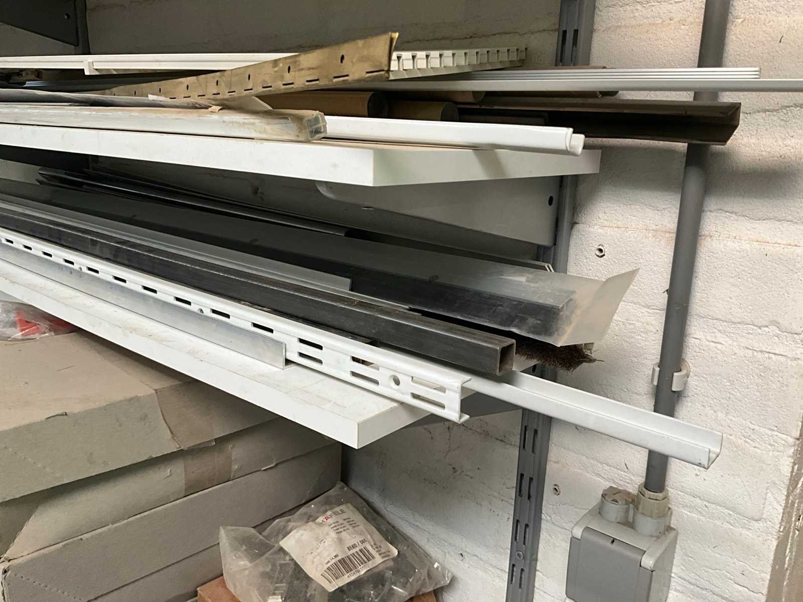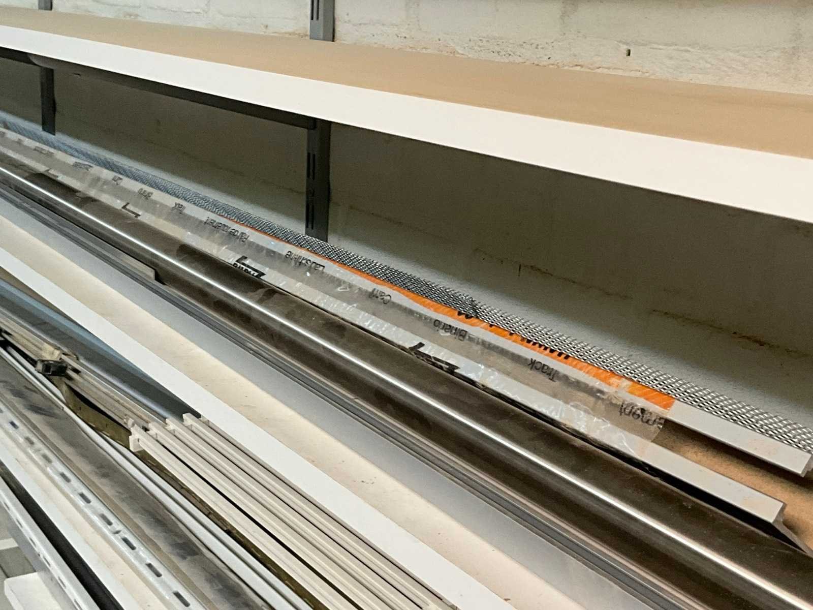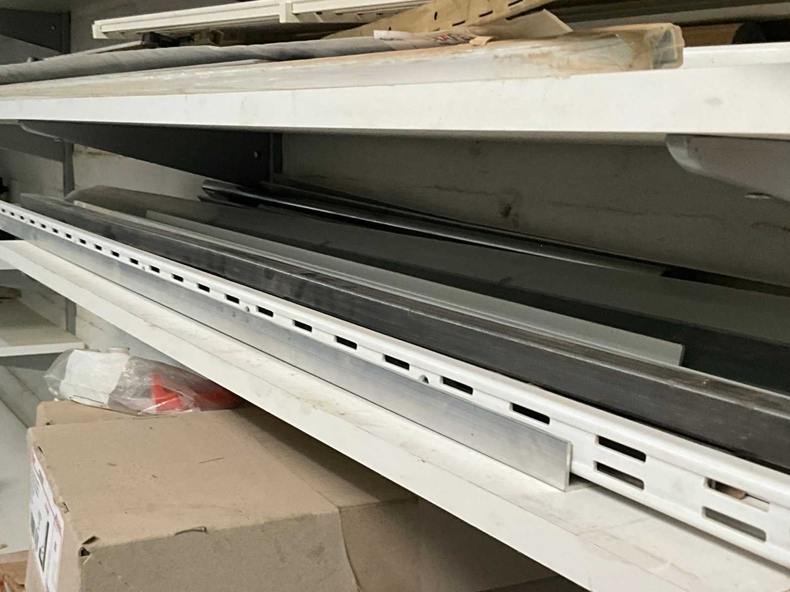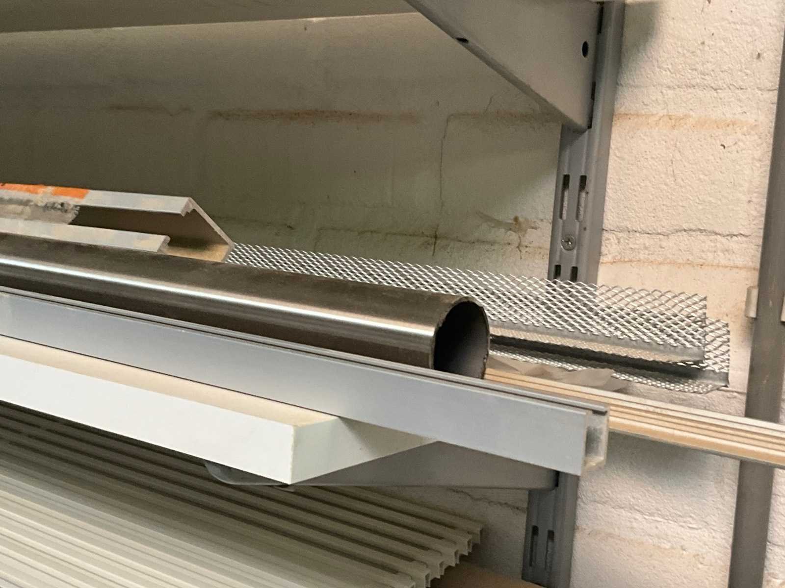 Diverse metalen en alu profielen in verschillende uitvoeringen en lengtes, compleet met enige diverse haken waaronder voorzien van muurwandhouders voor de haken. Nee