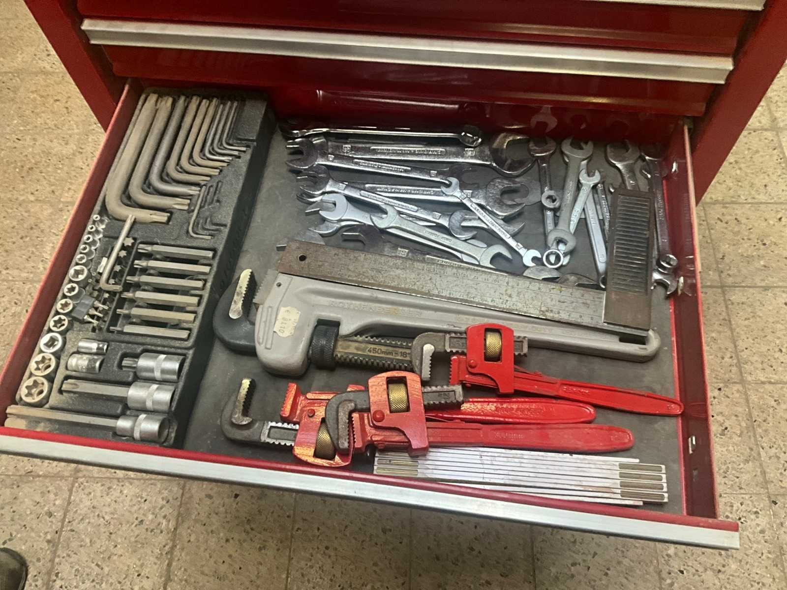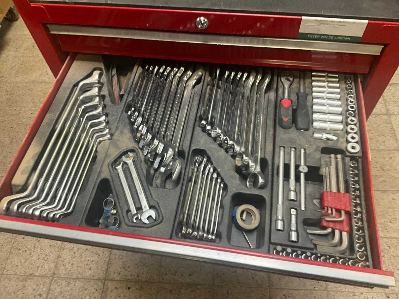Compleet met inhoud waaronder divers gereedschap waaronder kniptangen, schroevendraaiers, partij diverse ring-/steek- en dopsleutels, bits sets, torx, inbussleutels, vijlen, hamers, Engelse sleutels/gripsleutels, boren, enz. Voorzien van 7 schuiven. Nee Met inhoud: true Totale afmeting L: 800mm Totale afmeting Breedte: 460mm Totale afmeting Hoogte: 960mm