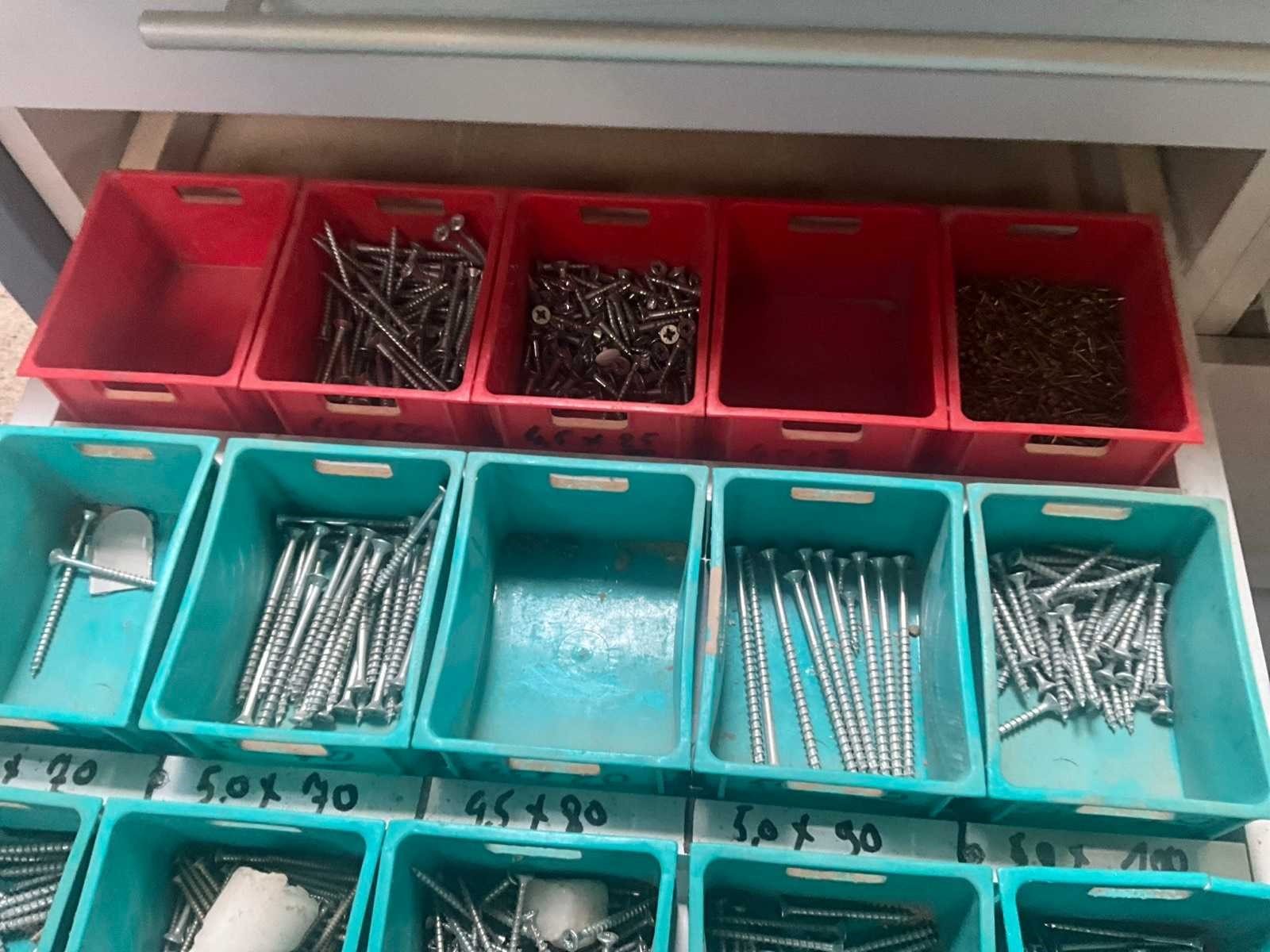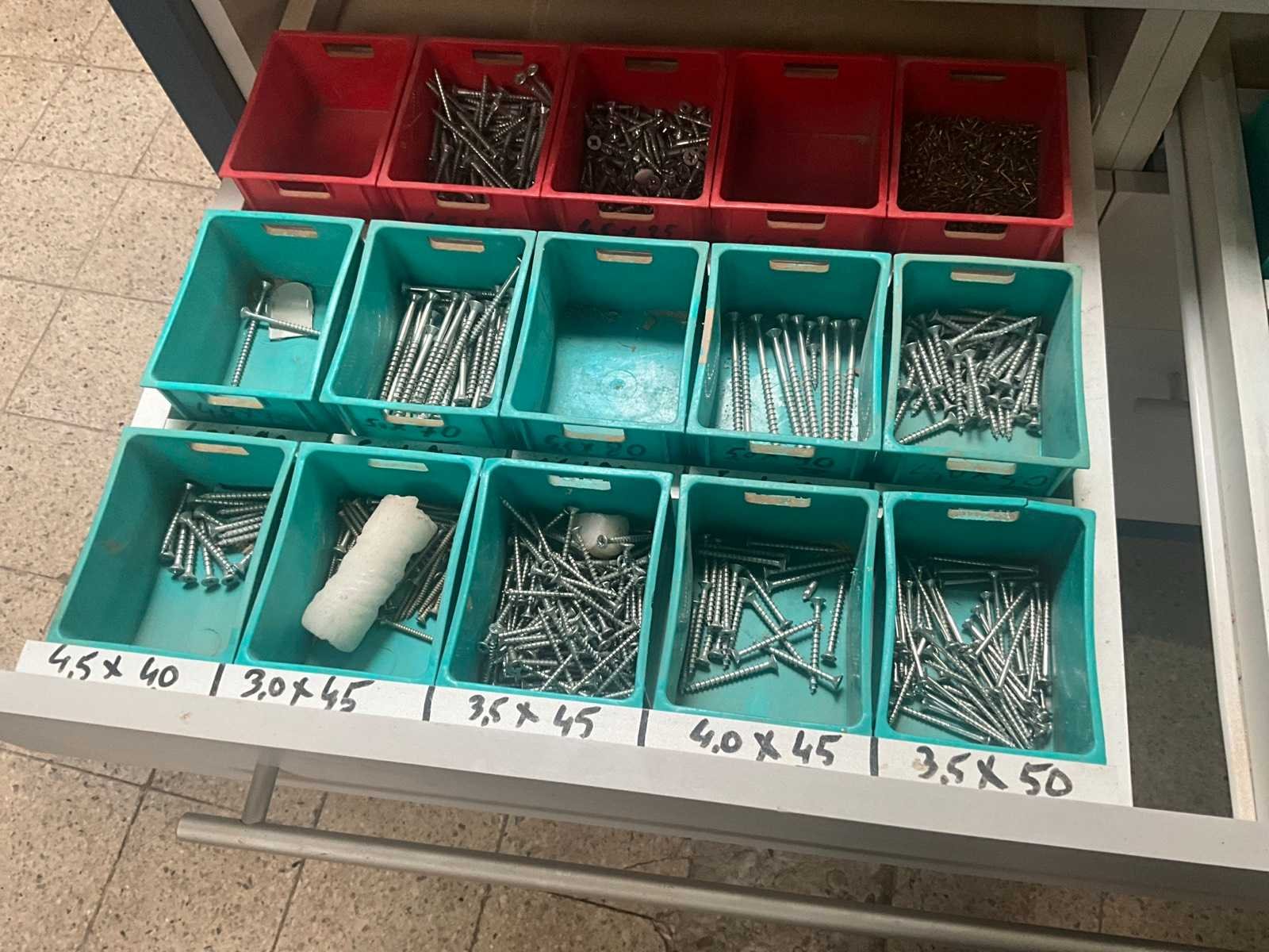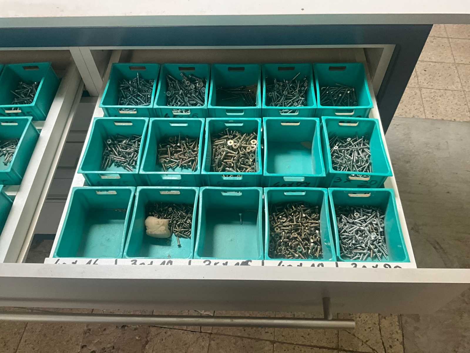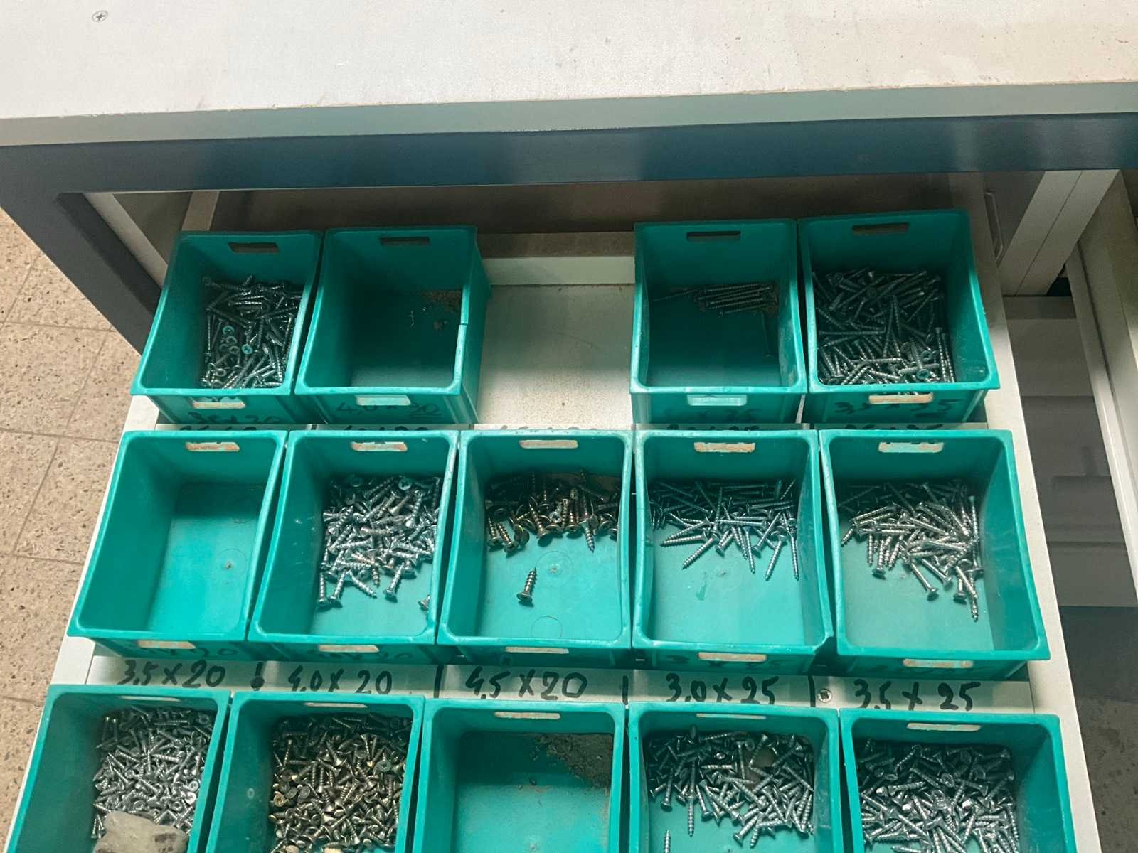 Zijnde partij divers bevestigingsmateriaal waaronder diverse vijzen, schroeven. Voorzien van 6 schuiven waaronder met pvc opbergbakjes. Nee Breedte: 620mm Lengte: 1550mm Hoogte: 1350mm