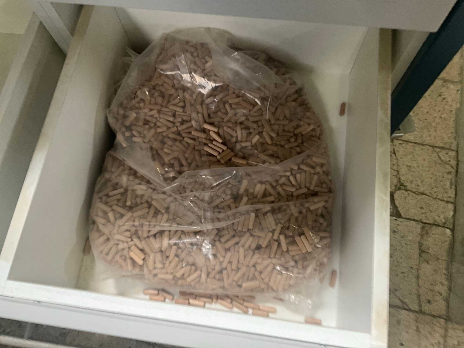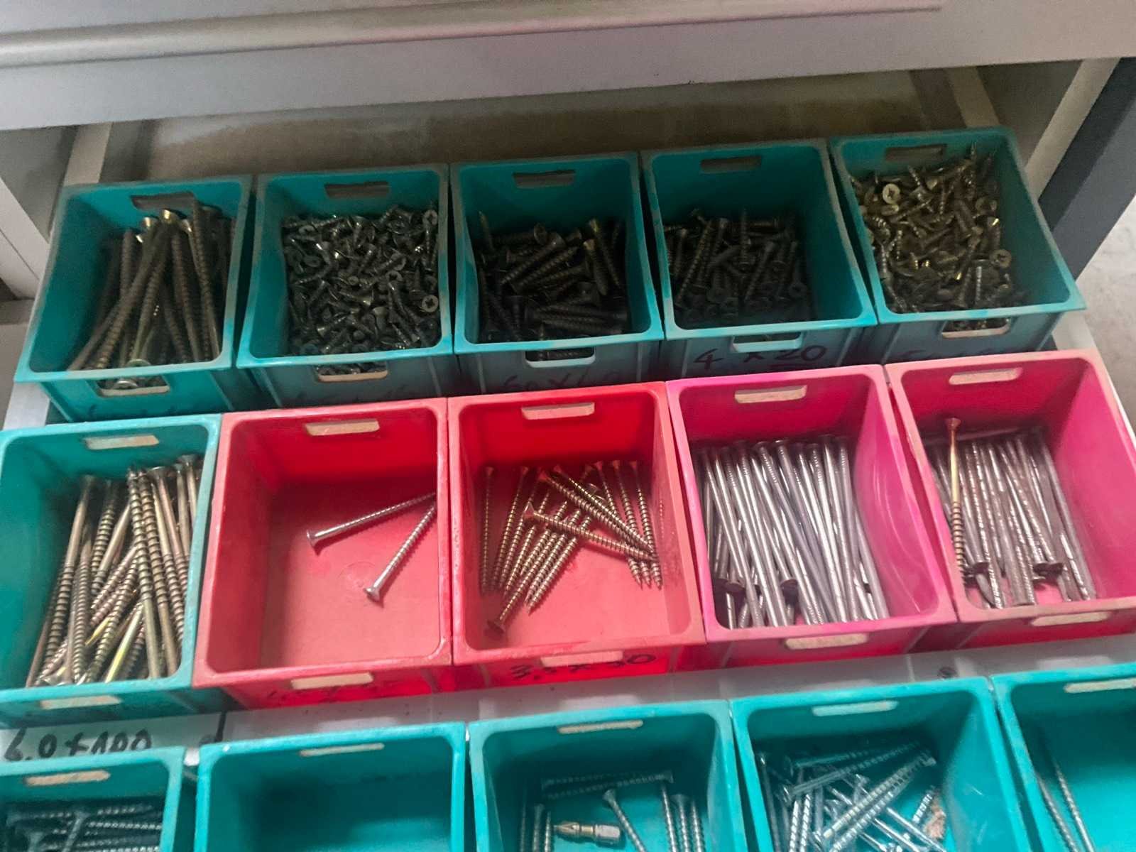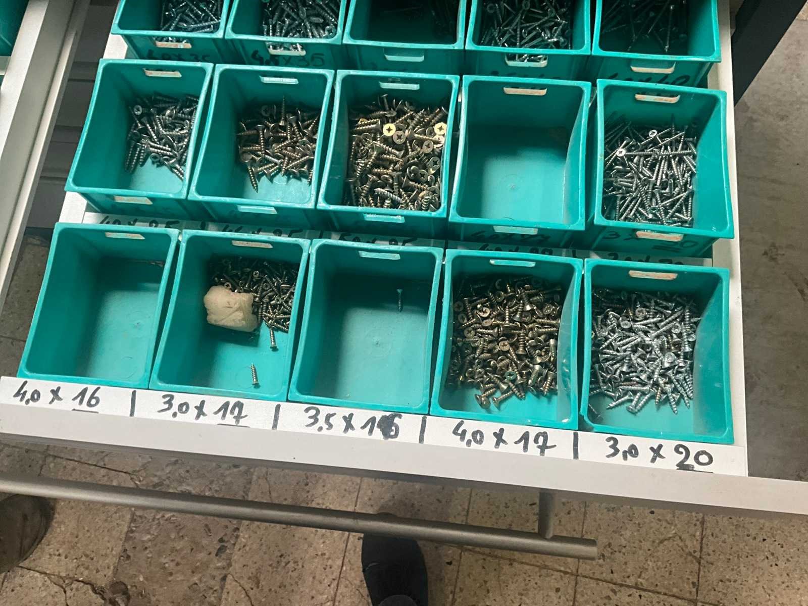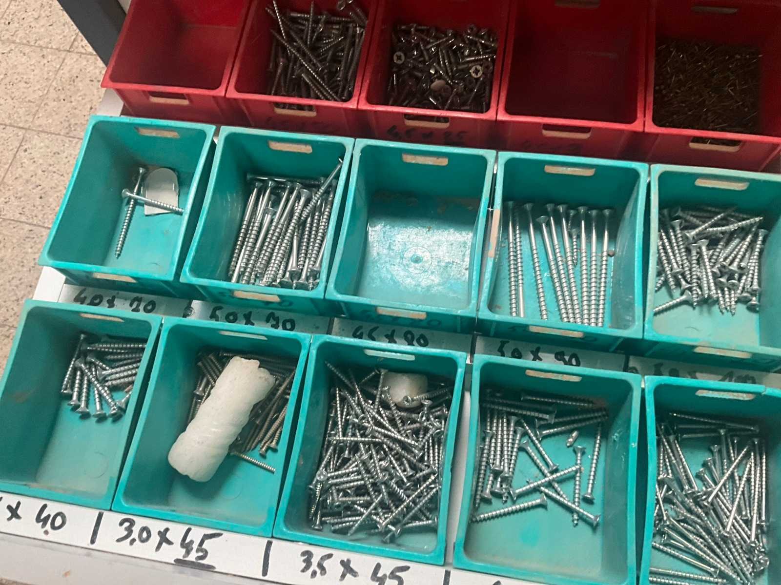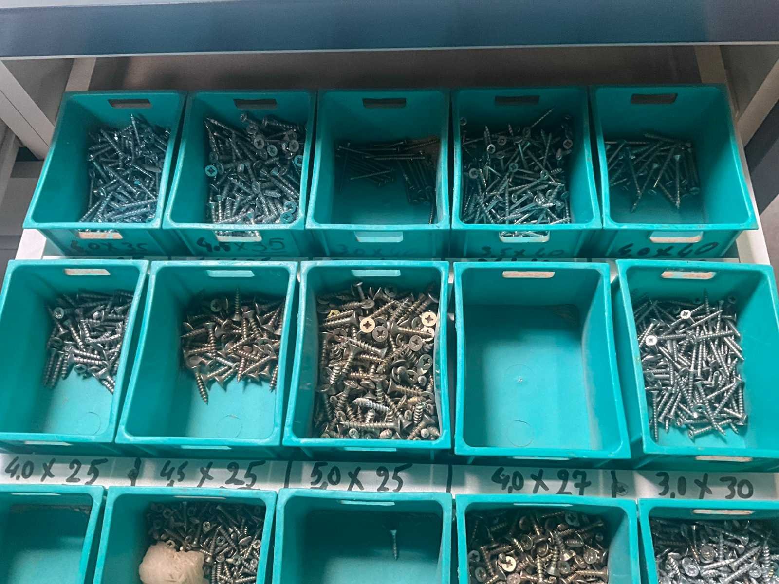 Zijnde partij divers bevestigingsmateriaal waaronder diverse vijzen, schroeven. Voorzien van 6 schuiven waaronder met pvc opbergbakjes. Nee Breedte: 620mm Lengte: 1550mm Hoogte: 1350mm