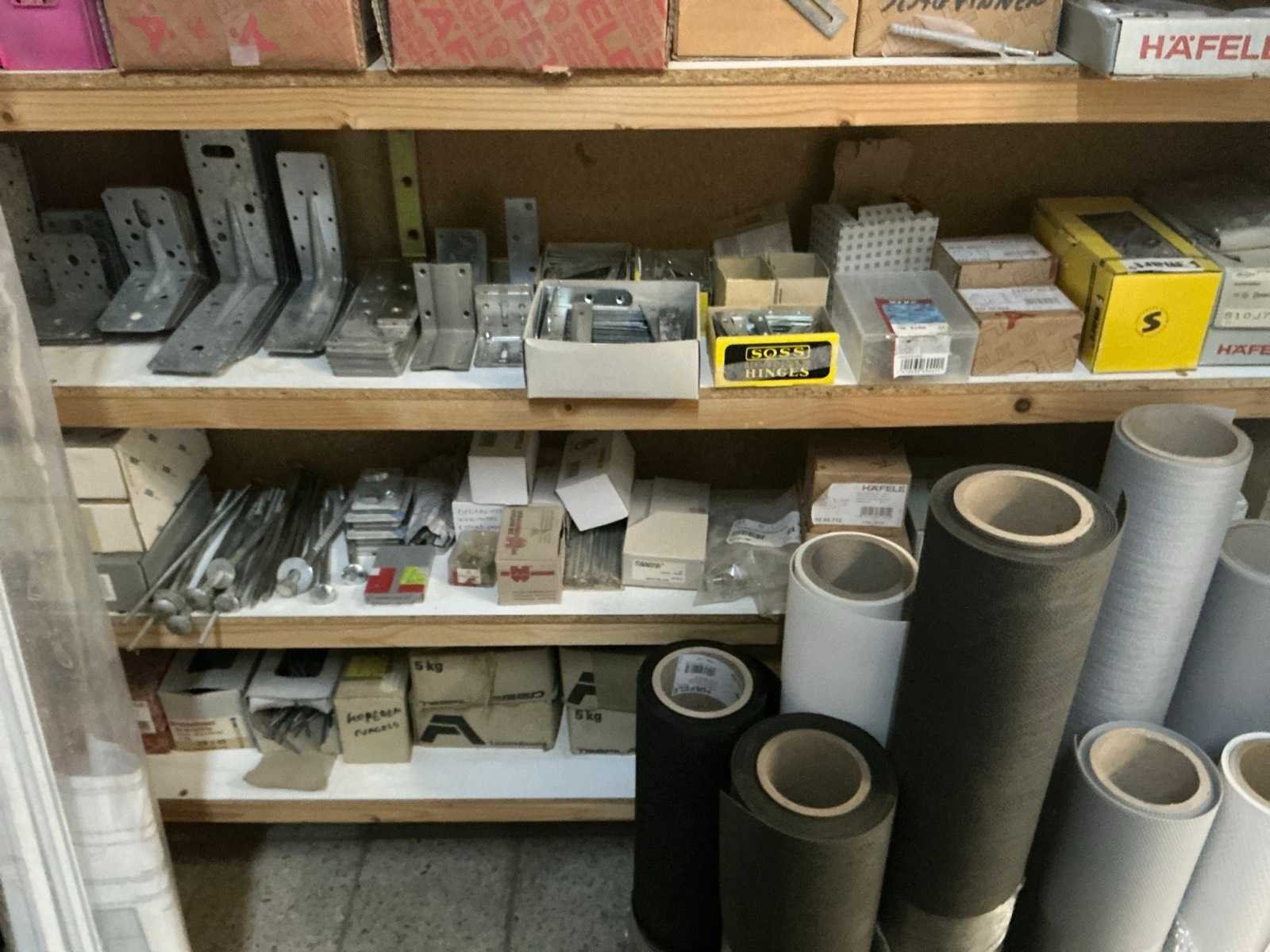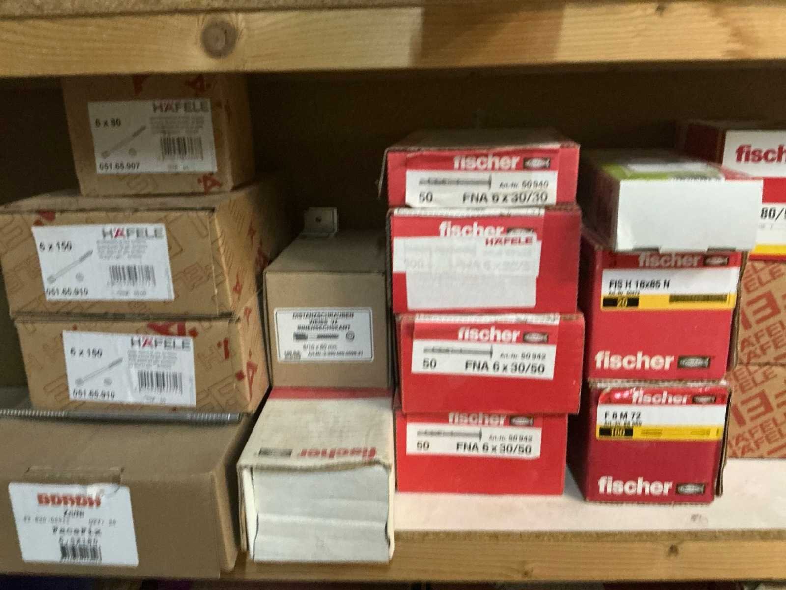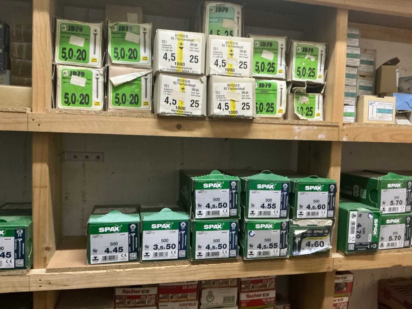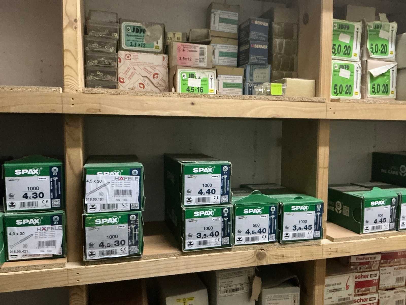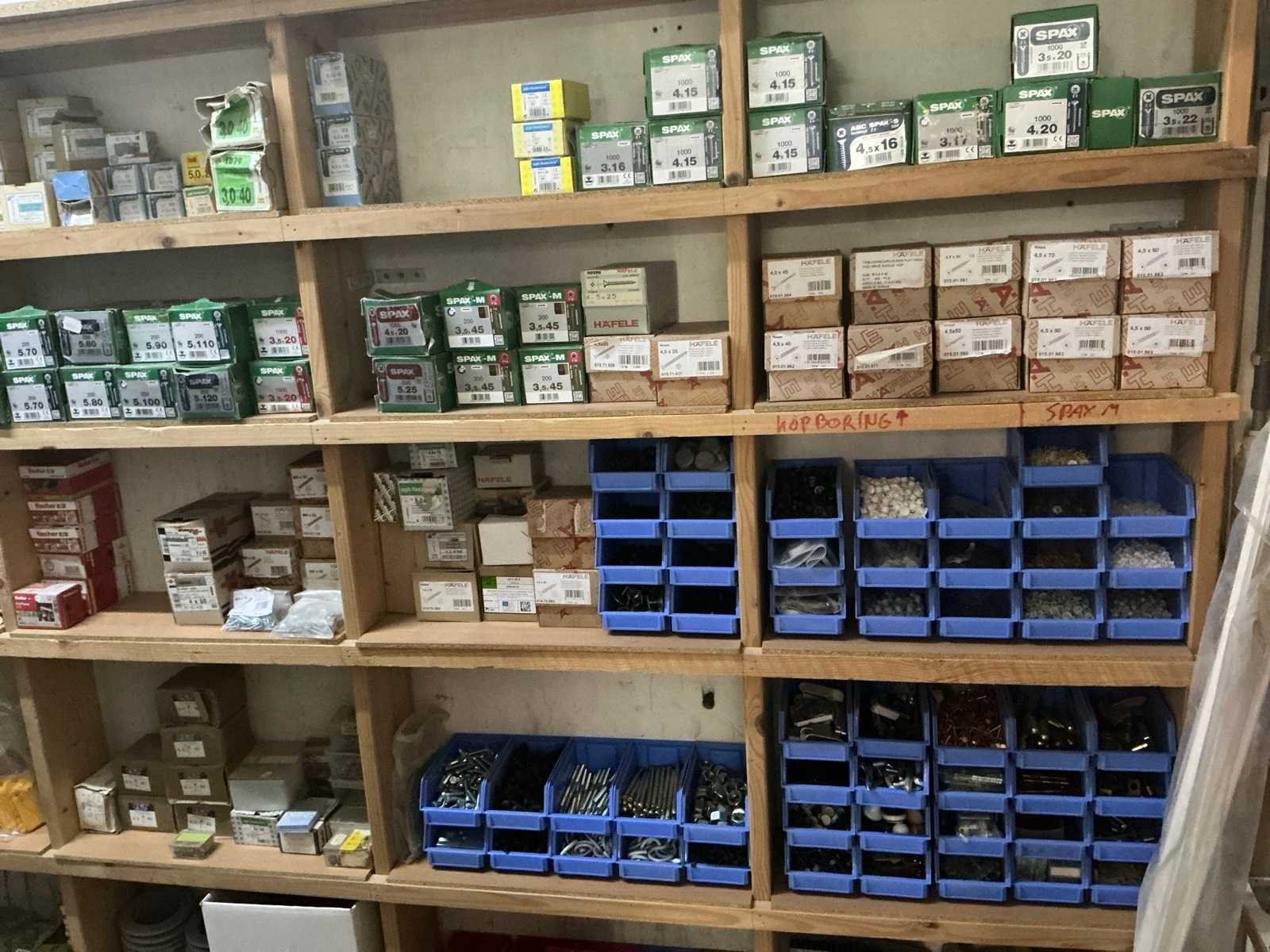 Waaronder Spax, Fischer, Häfele, PGB-fasteners en Mungo, Waaronder bouten, moeren, schroeven, rondellen, slagpluggen, plaketten en verbindingshoeken, scharnieren, handgrepen en ladegeleiders, Liggende in originele doosjes en pvc sorteerbakjes in ca 8 lm divers opbergrek voorzien van 5 niveaus, Zonder opbergrekken, Afgifte volgens aanwijzing. Nee Type: Partij