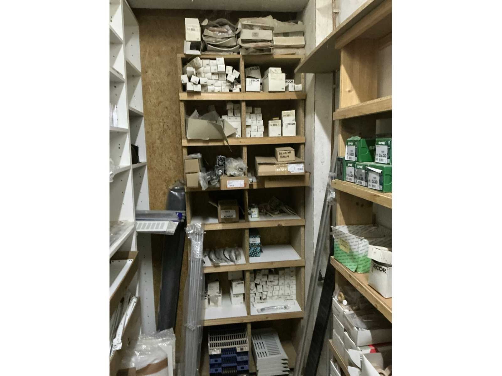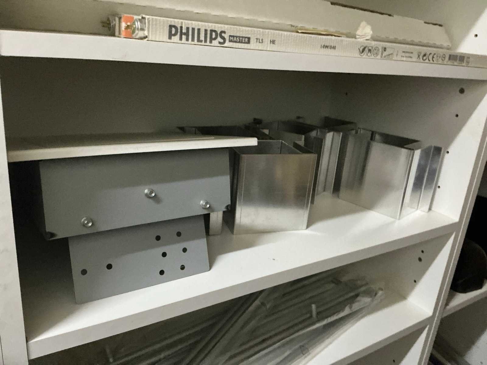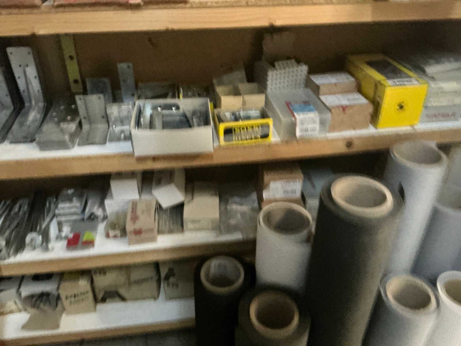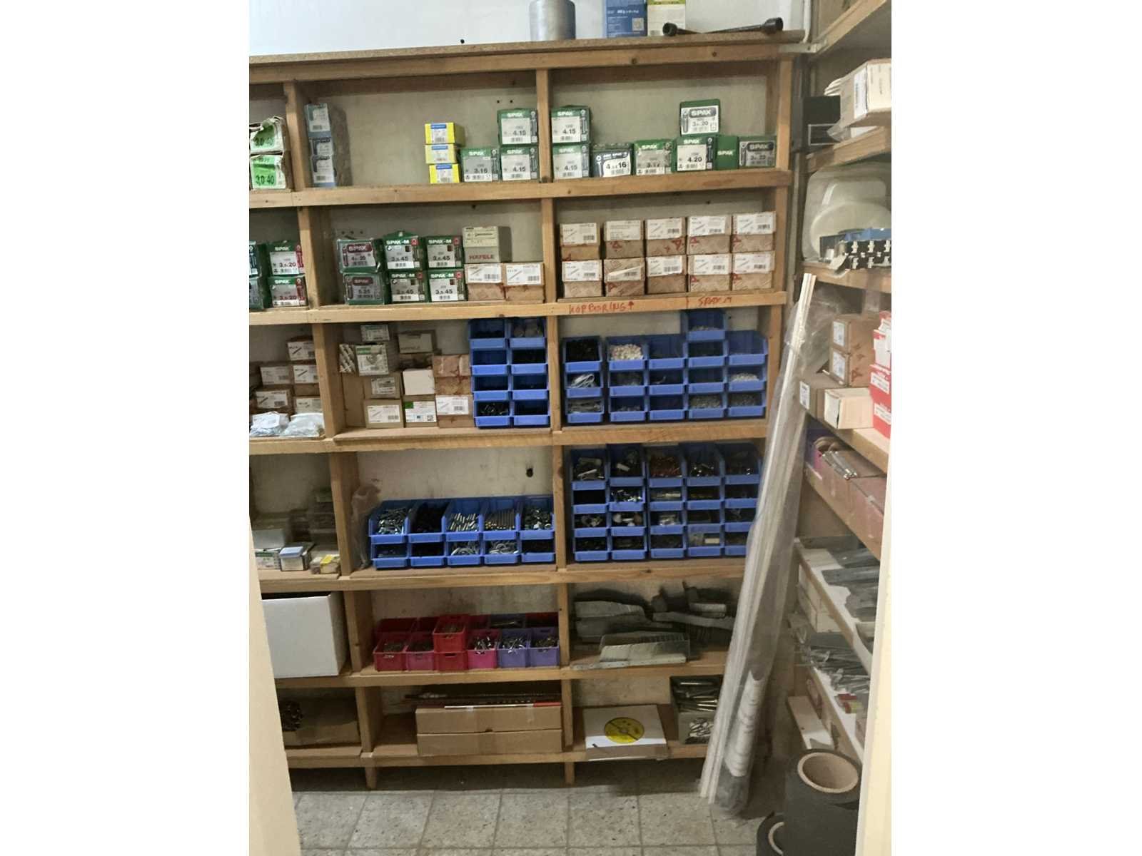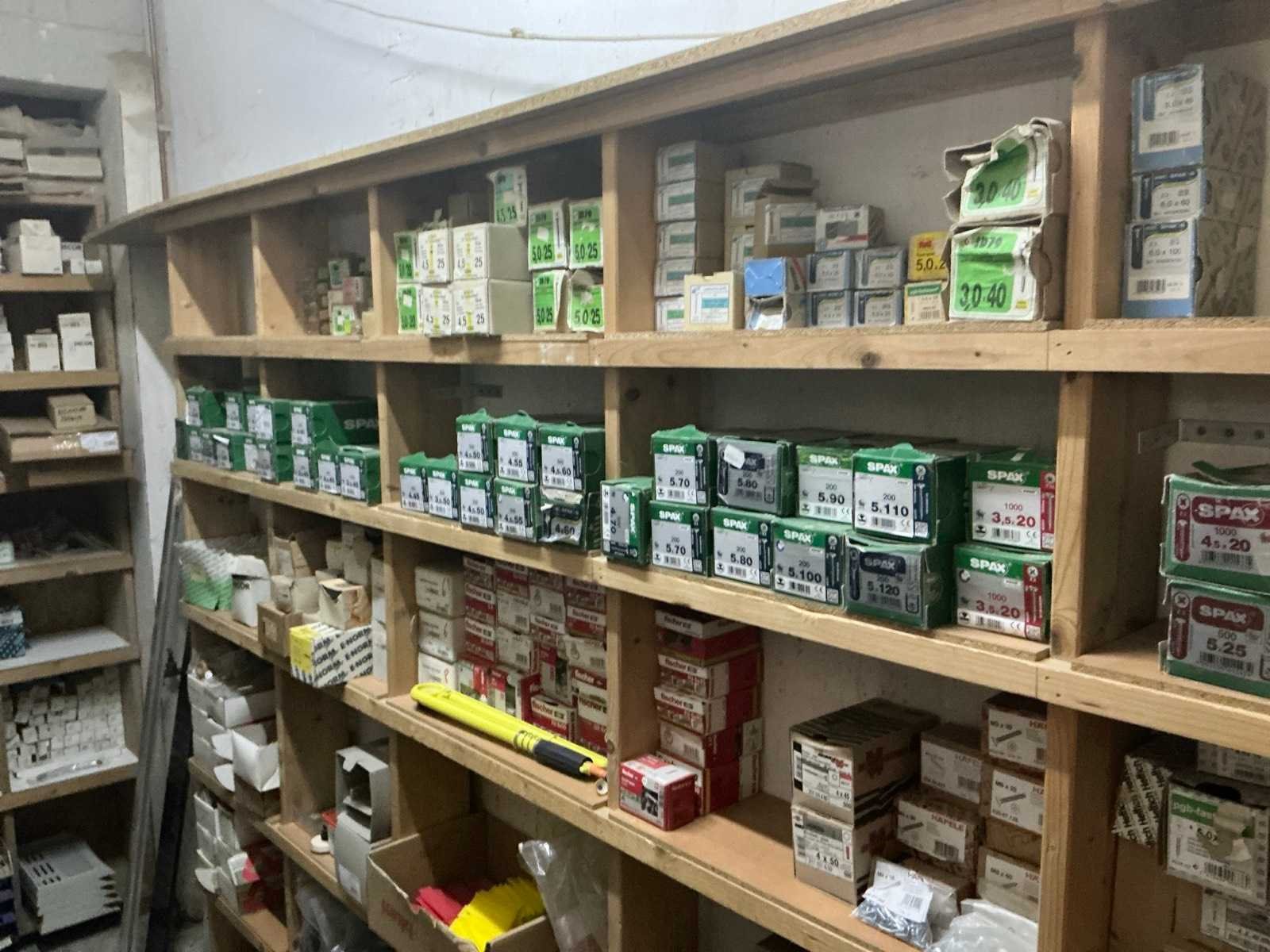 Waaronder Spax, Fischer, Häfele, PGB-fasteners en Mungo, Waaronder bouten, moeren, schroeven, rondellen, slagpluggen, plaketten en verbindingshoeken, scharnieren, handgrepen en ladegeleiders, Liggende in originele doosjes en pvc sorteerbakjes in ca 8 lm divers opbergrek voorzien van 5 niveaus, Zonder opbergrekken, Afgifte volgens aanwijzing. Nee Type: Partij