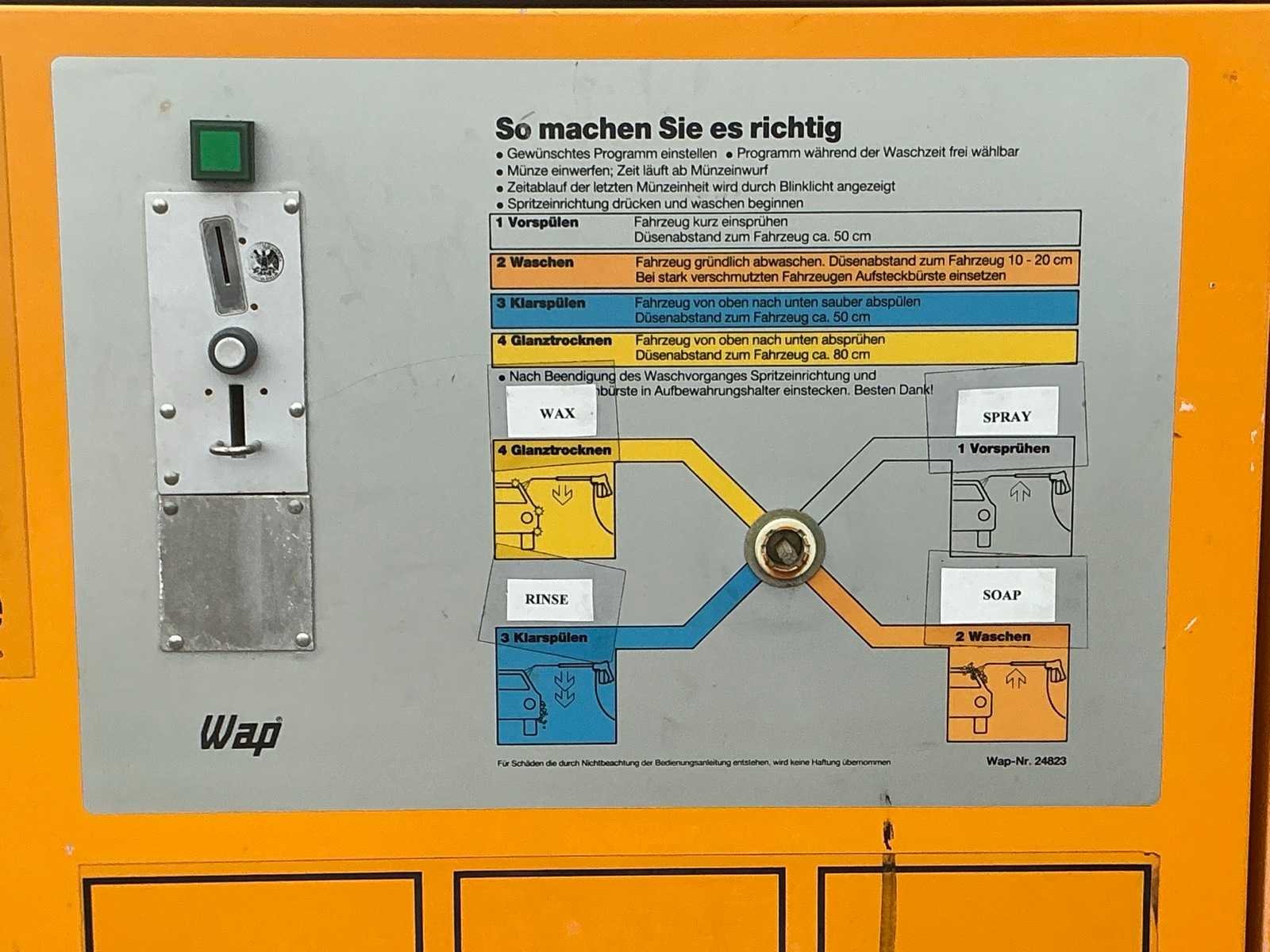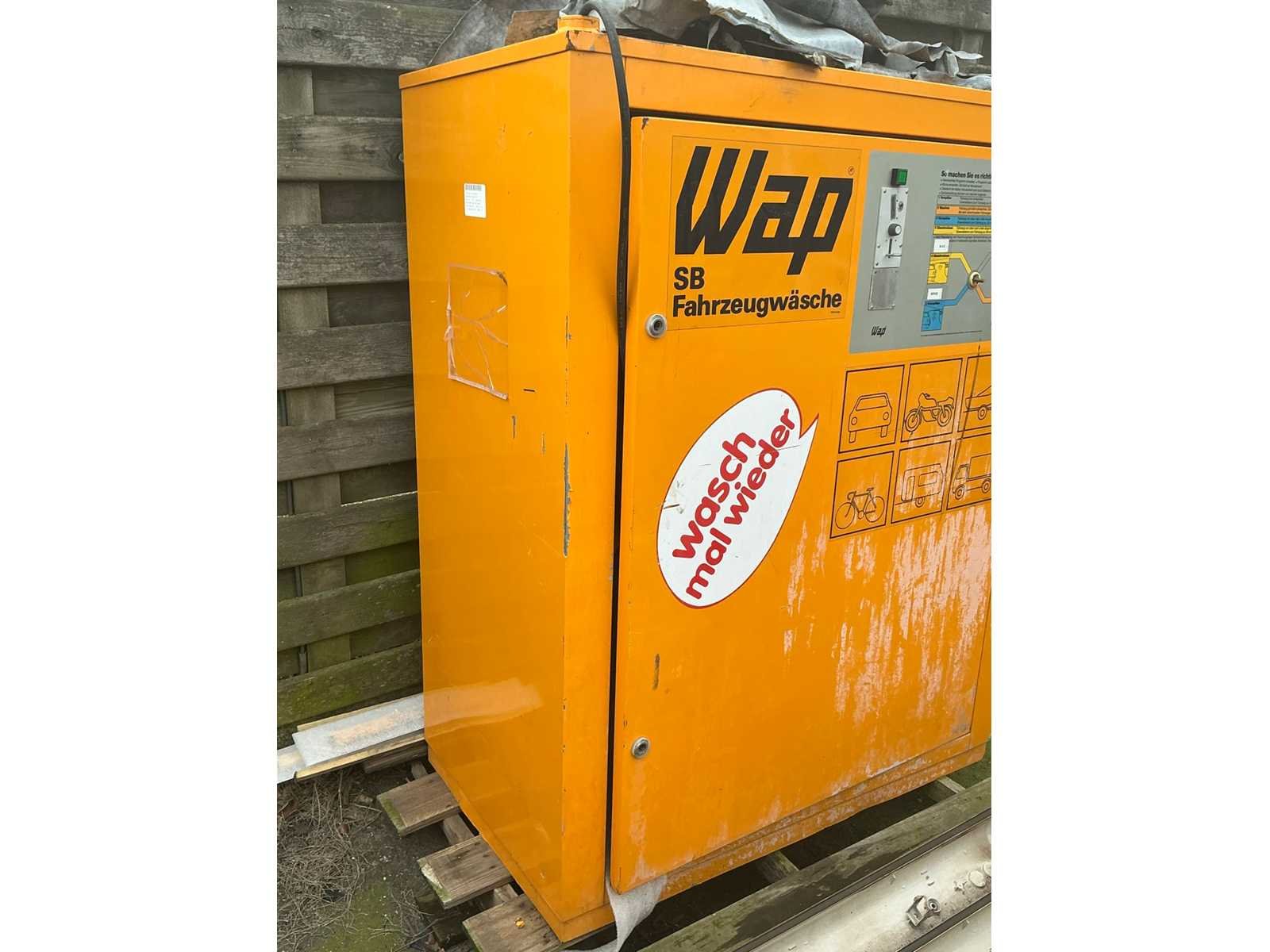 Voorzien van muntenbetaalsysteem en slang, zonder spuitlans, Reeds gedemonteerd No Merk: WAP Type: WapWash 300 SB Bouwjaar: 1991 Maximale werkdruk: 80bar Temperatuurbereik max.: 90°c Vaste installatie: true Aansluiting: 380V Totale afmeting L: 1150mm Totale afmeting Breedte: 660mm Totale afmeting Hoogte: 1450mm