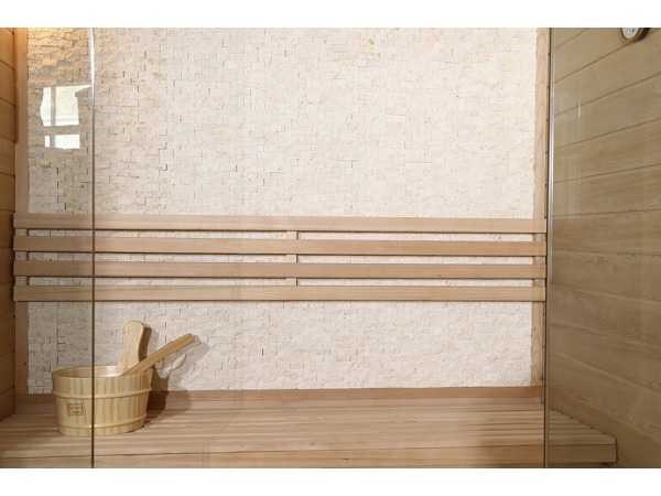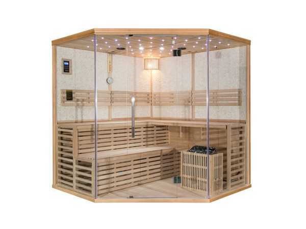 Ip54, met led sfeer verlichting, vol glas voorkant 8 mm veiligheidsglas, rvs heather en digitaal controller, thermometer en hygrometer, glazen timer, lava steen, geschikt voor 4-6 personen, ongebruikt No Model: lounge 04 Product type: 4-6 personen Lengte: 200cm Breedte: 200cm Hoogte: 210cm Materiaal: Canada hemlock