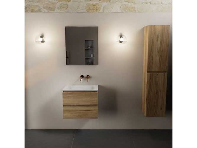 Badkamerkast met massief oppervlak (kunststeen) wasbakje 60 cm, zonder kraangat, 2 lades, bovenste laag kast van eikenhout (alleen kast en waskom inbegrepen) No Kleur: Honey Lengte: 60cm Breedte: 45cm Hoogte: 50cm Materiaal: Eikenhout