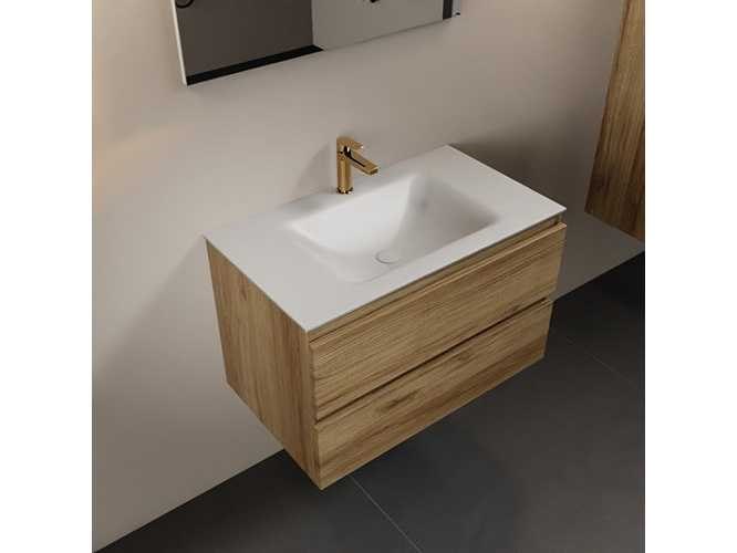 Badkamerkast met massief oppervlak (kunststeen) wasbakje 80 cm, met kraangat, 2 lades, bovenste laag kast van eikenhout (alleen kast en waskom inbegrepen) No Kleur: Honey Lengte: 80cm Breedte: 45cm Hoogte: 50cm Materiaal: Eikenhout