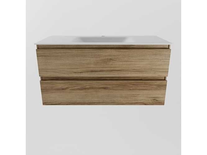 Badkamerkast met massief oppervlak (kunststeen) wasbakje 100 cm, met kraangat, 2 lades, bovenste laag kast van eikenhout (alleen kast en waskom inbegrepen) No Kleur: Honey Lengte: 100cm Breedte: 45cm Hoogte: 50cm Materiaal: Eikenhout
