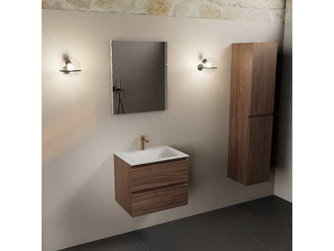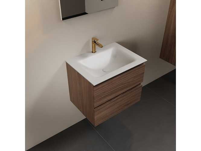 Badkamerkast met massief oppervlak (kunststeen) wasbakje 60 cm, met kraangat, 2 lades, bovenste laag kast van eikenhout (alleen kast en waskom inbegrepen) No Kleur: Mocha Lengte: 60cm Breedte: 45cm Hoogte: 50cm Materiaal: Eikenhout