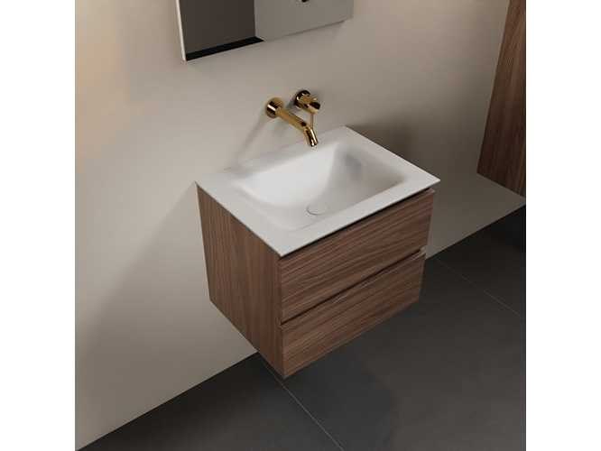 Badkamerkast met massief oppervlak (kunststeen) wasbakje 60 cm, zonder kraangat, 2 lades, bovenste laag kast van eikenhout (alleen kast en waskom inbegrepen) No Kleur: Mocha Lengte: 60cm Breedte: 45cm Hoogte: 50cm Materiaal: Eikenhout