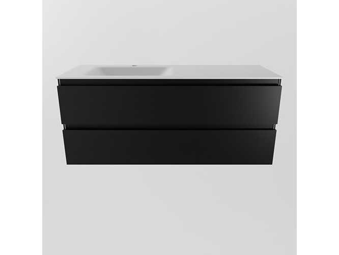 Badkamerkast met massief oppervlak (kunststeen) wasbakje 120 cm, met kraangat, 2 lades Positie wastafel: links (alleen kast en waskom inbegrepen) No Kleur: Zwart Lengte: 120cm Breedte: 45cm Hoogte: 50cm