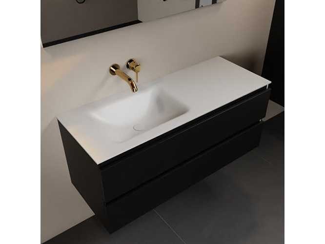 Badkamerkast met massief oppervlak (kunststeen) wasbakje 120 cm, zonder kraangat, 2 lades Positie wastafel: links (alleen kast en waskom inbegrepen) No Kleur: Zwart Lengte: 120cm Breedte: 45cm Hoogte: 50cm
