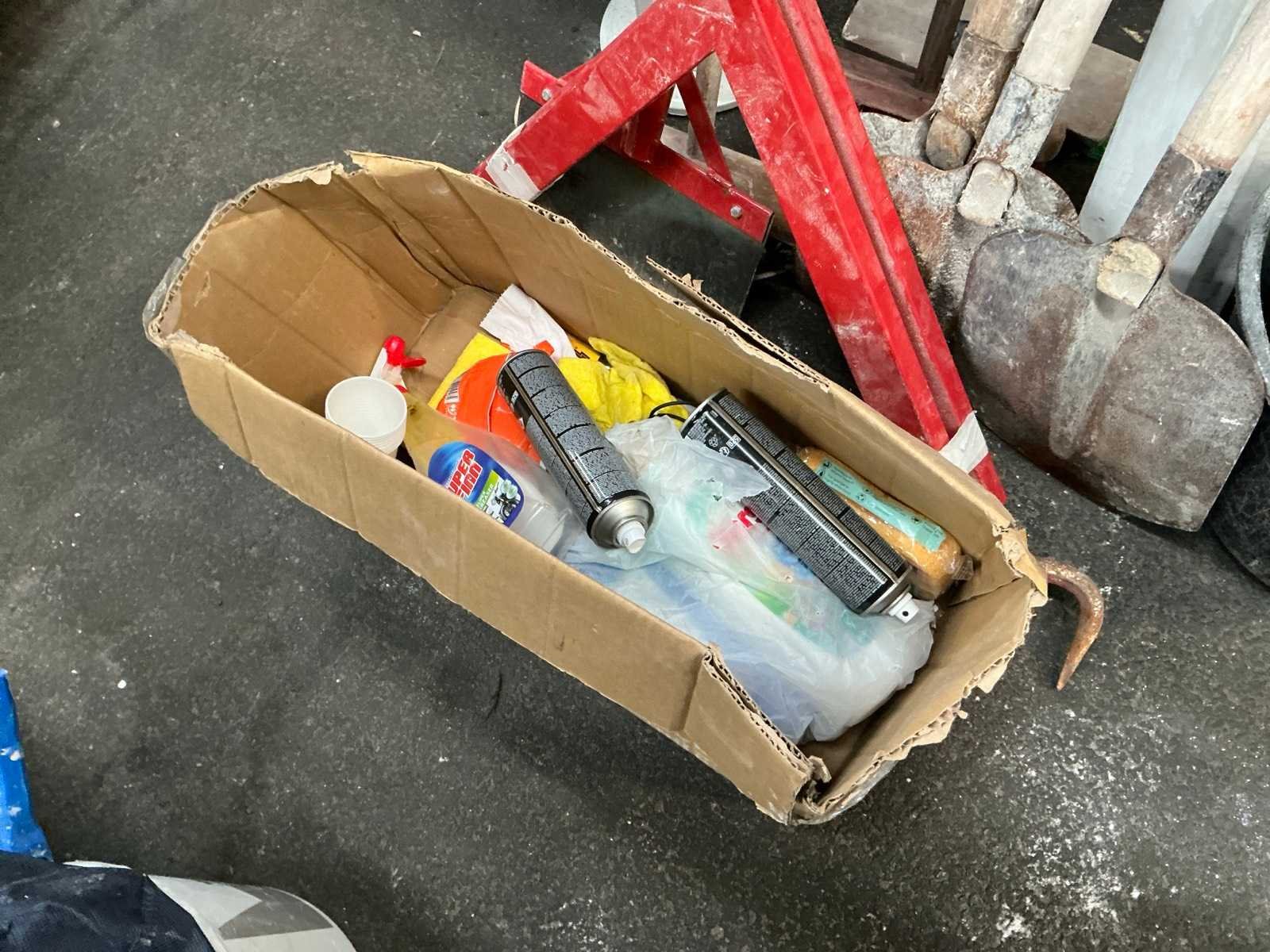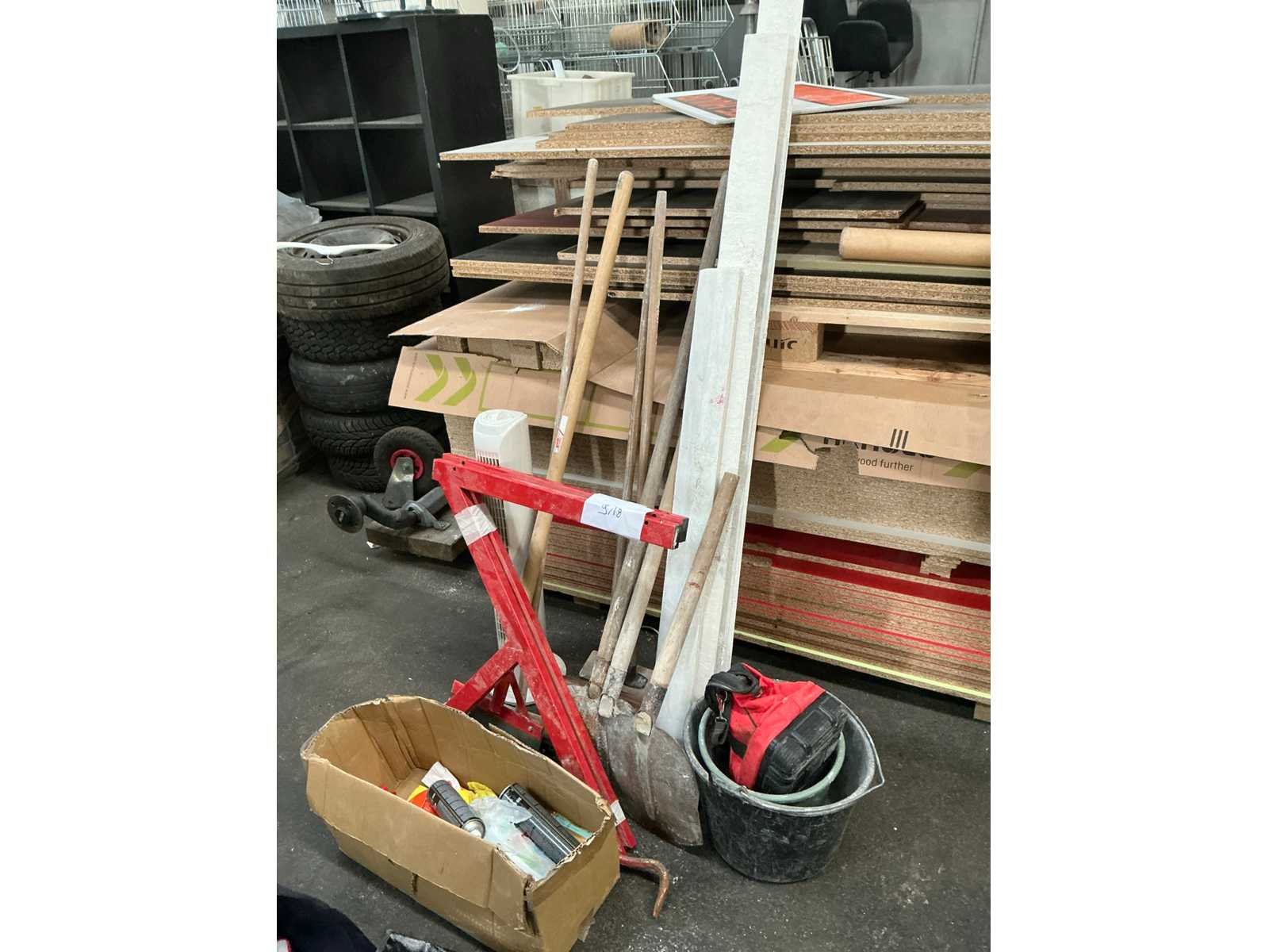 Bestaande uit onder andere: divers steelgereedschap, emmers, afwerkingslatten, koevoet, schragen. Nee