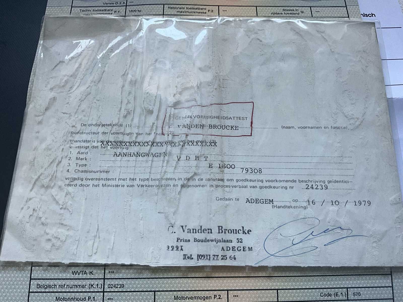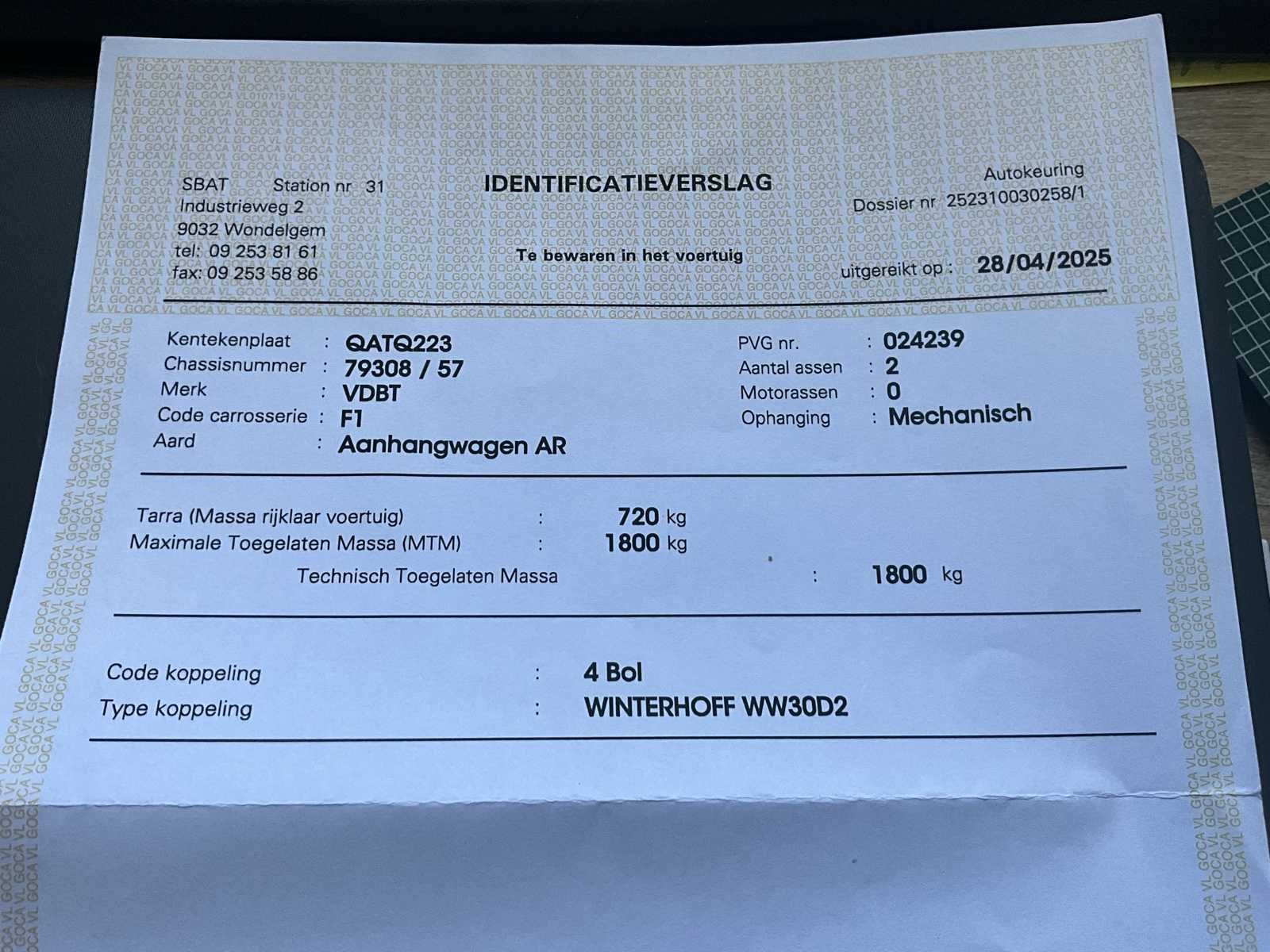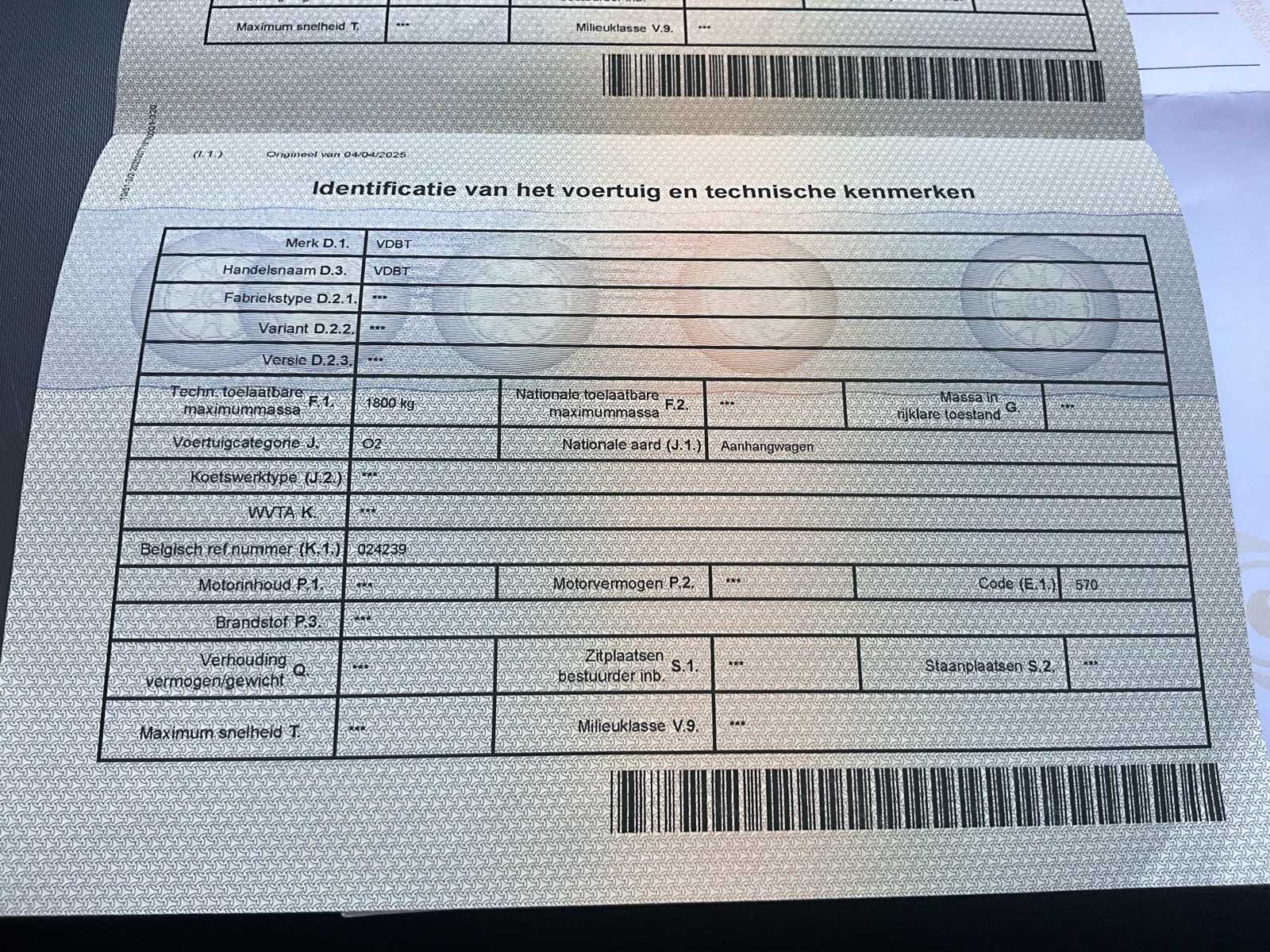 Het voertuig is een aanhangwagen (aanhangwagen AR). De merknaam van de aanhangwagen is VDBT. De carrosseriebouwer is Constructie-Carrosserie Ancar. De constructeur is gevestigd op Prins Boudewijnlaan 52, 9991 Adegem, België. Het type van de aanhangwagen is E1800 (E-1800). Het bouwjaar van de aanhangwagen is 1979. De datum van eerste inschrijving is 18/10/1979. De datum van eerste gebruik is 18/10/1979. De datum van laatste inschrijving is 04/04/2025. Het kenteken (nummerplaat) is QATQ223. Het documentnummer van het kentekenbewijs is 374509557. Het chassisnummer vermeld op documenten is 79308 / 57. Het VIN-nummer op het kentekenbewijs is 79308(02). Het PVG-nummer / Belgisch referentienummer is 024239. Het nummer PVA op het typeplaatje is 24239. Het voertuig heeft 2 assen. Het voertuig heeft geen motorassen. De ophanging van de aanhangwagen is mechanisch. De massa rijklaar (tarra) is 720 kg. De maximaal toegelaten massa (MTM) is 1800 kg. De technisch toegelaten massa is 1800 kg. De voertuigcategorie is O2 (aanhangwagen). De nationale aard van het voertuig is aanhangwagen. De code van de koppeling is 4 Bol. Het type koppeling is Winterhoff WW30D2. De identificatiekeuring werd uitgevoerd door SBAT Autokeuring, Industrieweg 2, 9032 Wondelgem. Het dossiernummer van de keuring is 252310030258/1. Het identificatieverslag werd geregistreerd op 28/04/2025. Het stationnummer van de keuringsinstantie is 31. De originele gelijkvormigheidsattest-verklaring werd opgesteld op 16/10/1979 in Adegem. Nee Merk: VDBT Model: E1800 Chassisnummer: 79308 / 57. Kleur: zwart-wit Gewicht: 720kg No self drive export!: true Nationaliteit documenten: Belg Bouwjaar: 1979