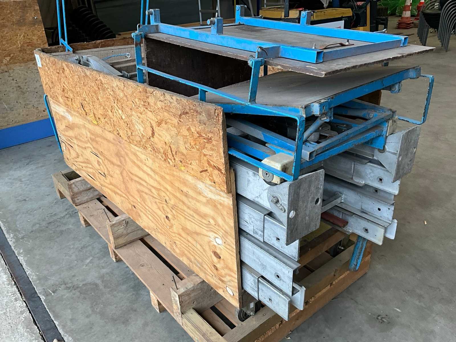 Bestaande uit 6x staander 200cm, 1x verlengstuk 1m, knik- en eindstuk, Liggende in houten verrijdbare opbergkist, totale afmetingen circa 255 x 105 x 140cm Nee Merk: Toplift Bouwjaar: 1986 Serienummer: 13697 Totale afmeting Breedte: 600mm Totale afmeting Hoogte: 13000mm