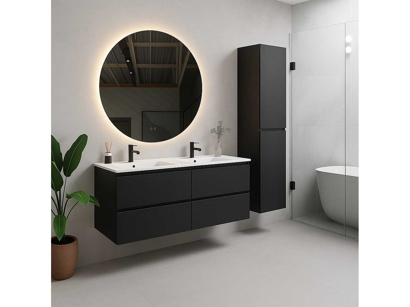 120 cm Design Badkamermeubel - ROMA 120-06 - Melamine - Kleur: Zwart Eik- Afm. B120xH50xD46CM - LED rond Spiegel 100x100cm (Verschillende kleurtemperaturen 3000K Warm-wit, 4000K Neutraal-wit, 6500K Koud-wit) + Anti Condens + Alle 3 de kleuren zijn dimbaar, zo kunt u het licht eenvoudig dimmen of feller maken tot het gewenste effect - Mineraalmarmer wastafel- de onderbouwkast van het badkamermeubel bevat 4 laden en is uitgevoerd met een soft close systeem - kraan, krepin, sifon en kolomkast niet inbegrepen No Merk: Lavinno Model: Roma 120-06 Hoogte: 50cm Lengte: 120cm Breedte: 46cm Materiaal: Melamine Kleur: Zwart Eik Wastafel: Mineraalmarmer Spiegel met verlichting: 100x100 cm Softclose: true