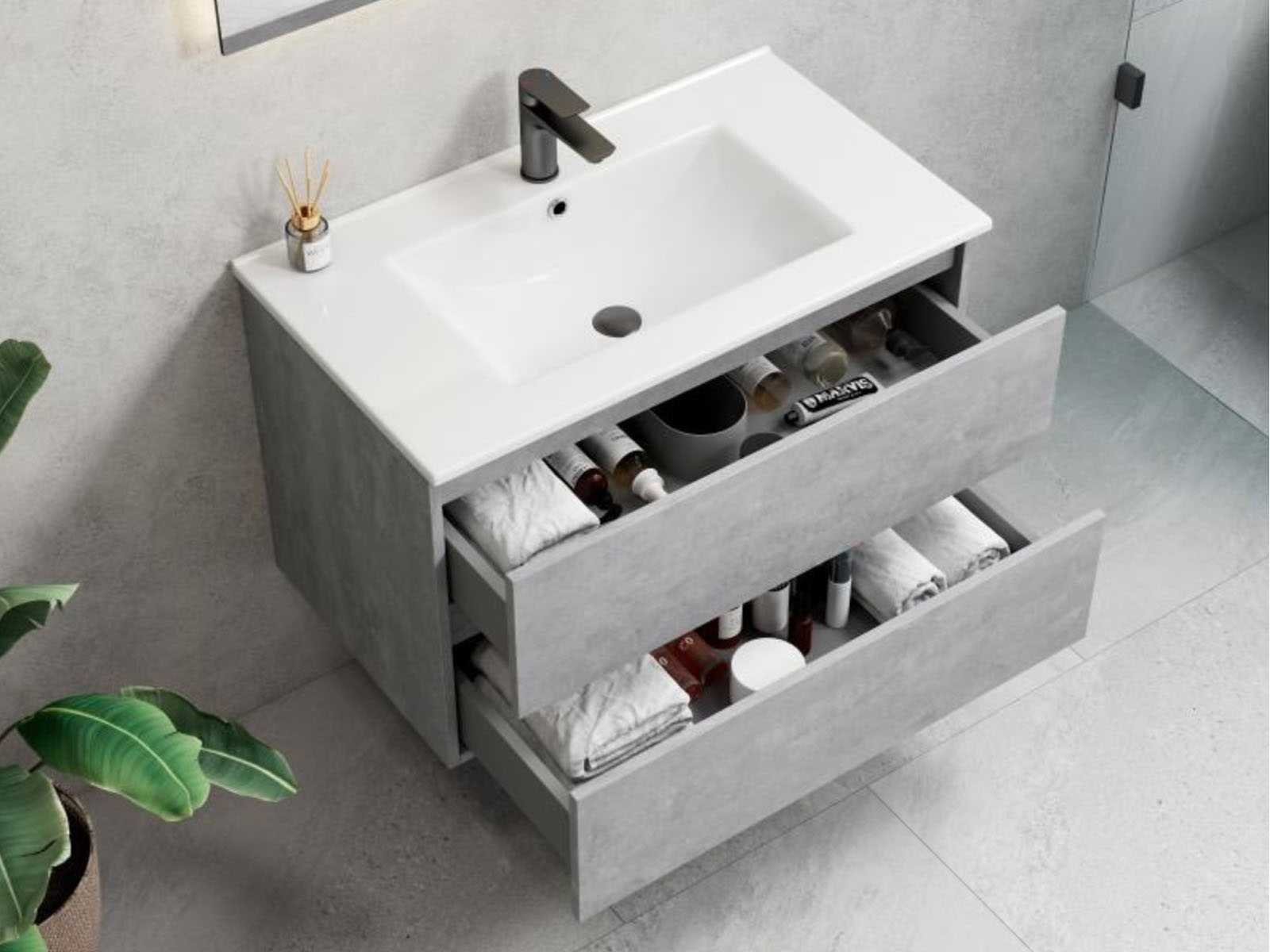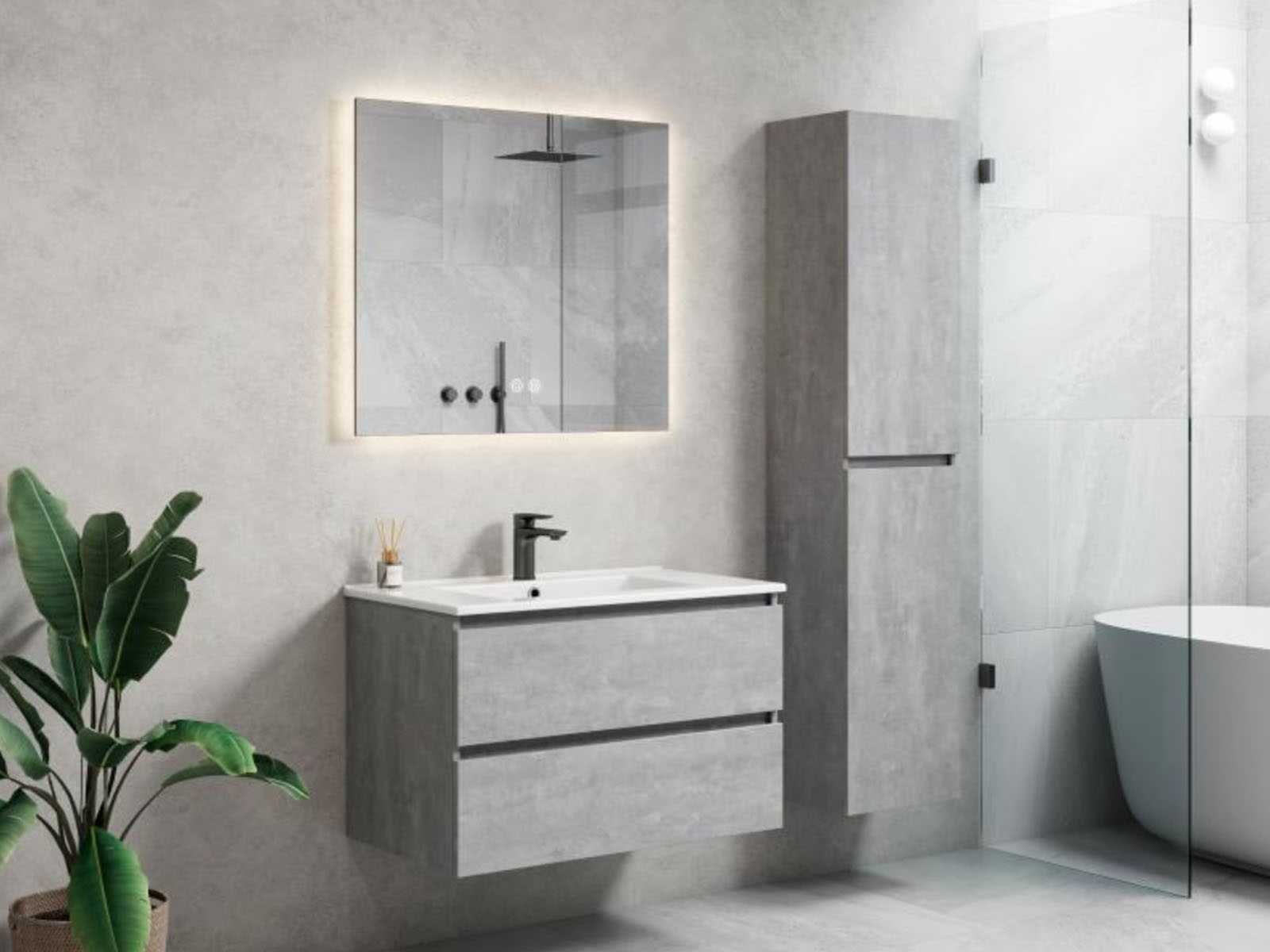2 Lades met softclose systeem - Kraan, krepin sifon en kolomkast niet inbegrepen No Merk: Lavinno Model: Roma 80-05 Hoogte: 50cm Lengte: 80cm Breedte: 46cm Materiaal: Melamine Kleur: Beton Grijs Wastafel: Mineraalmarmer Spiegel met verlichting: 80x70cm Softclose: true