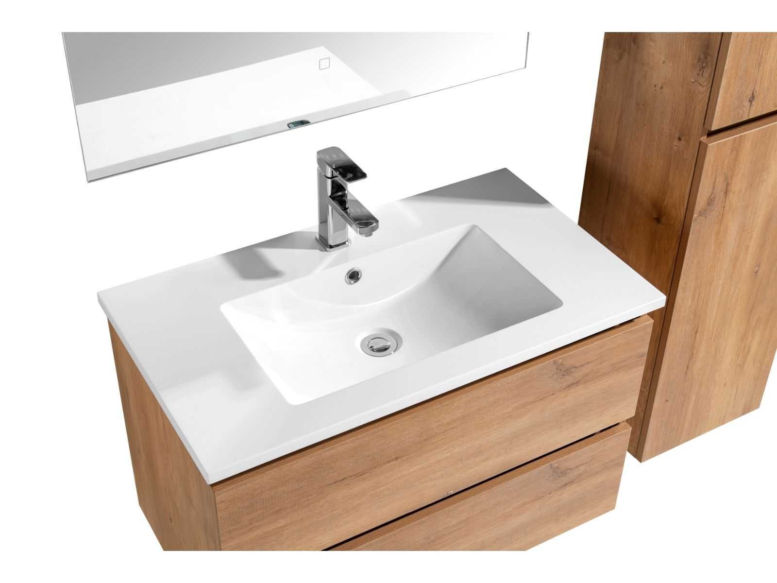 2 Lades met softclose systeem - Kraan, krepin sifon en kolomkast niet inbegrepen No Merk: Lavinno Model: Roma 80-01 Hoogte: 50cm Lengte: 80cm Breedte: 46cm Materiaal: Melamine Kleur: Naturel Eik Wastafel: Mineraalmarmer Spiegel met verlichting: 80x70cm Softclose: true