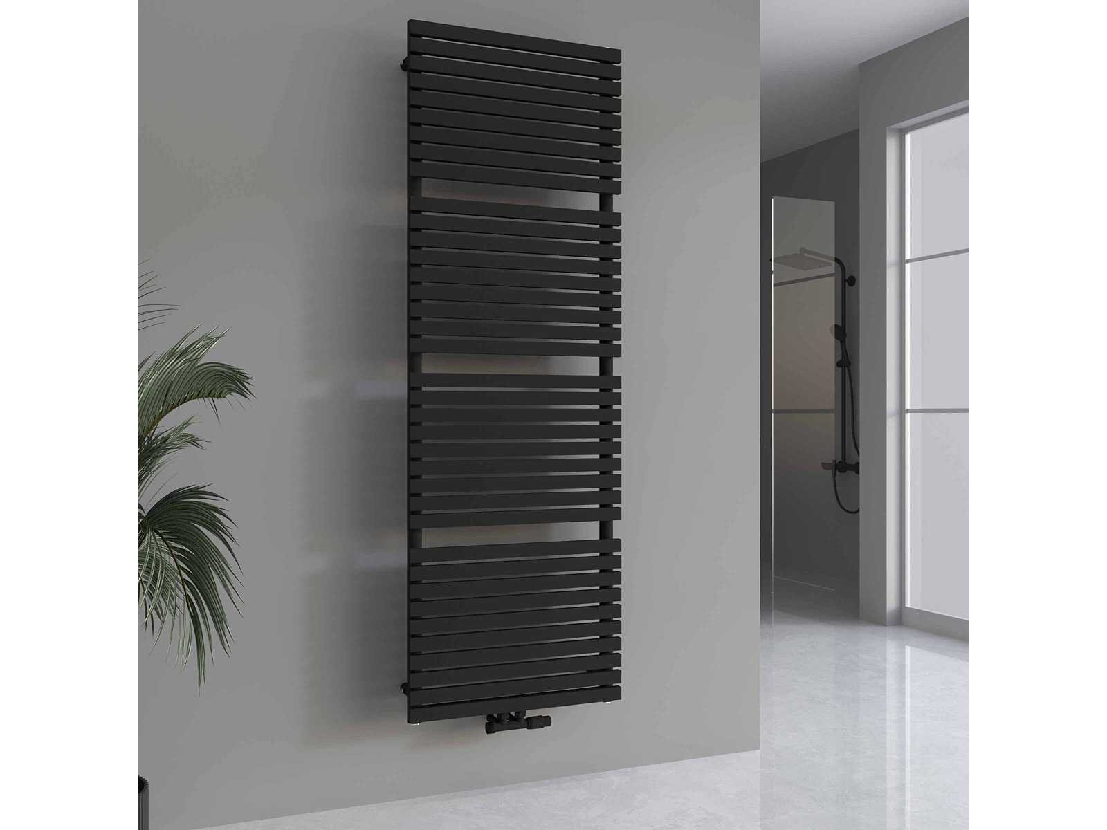Lavinno Verezzo design handdoekradiator met middenaansluiting - Afm. H1800 x B600 mm - Kleur mat zwart - 1887 Watt - Incl. muurbevestiging - Design kraanset niet inbegrepen No Merk: Lavinno Model: Verezzo Zwart Kleur: Mat Zwart Breedte: 60cm Hoogte: 180cm