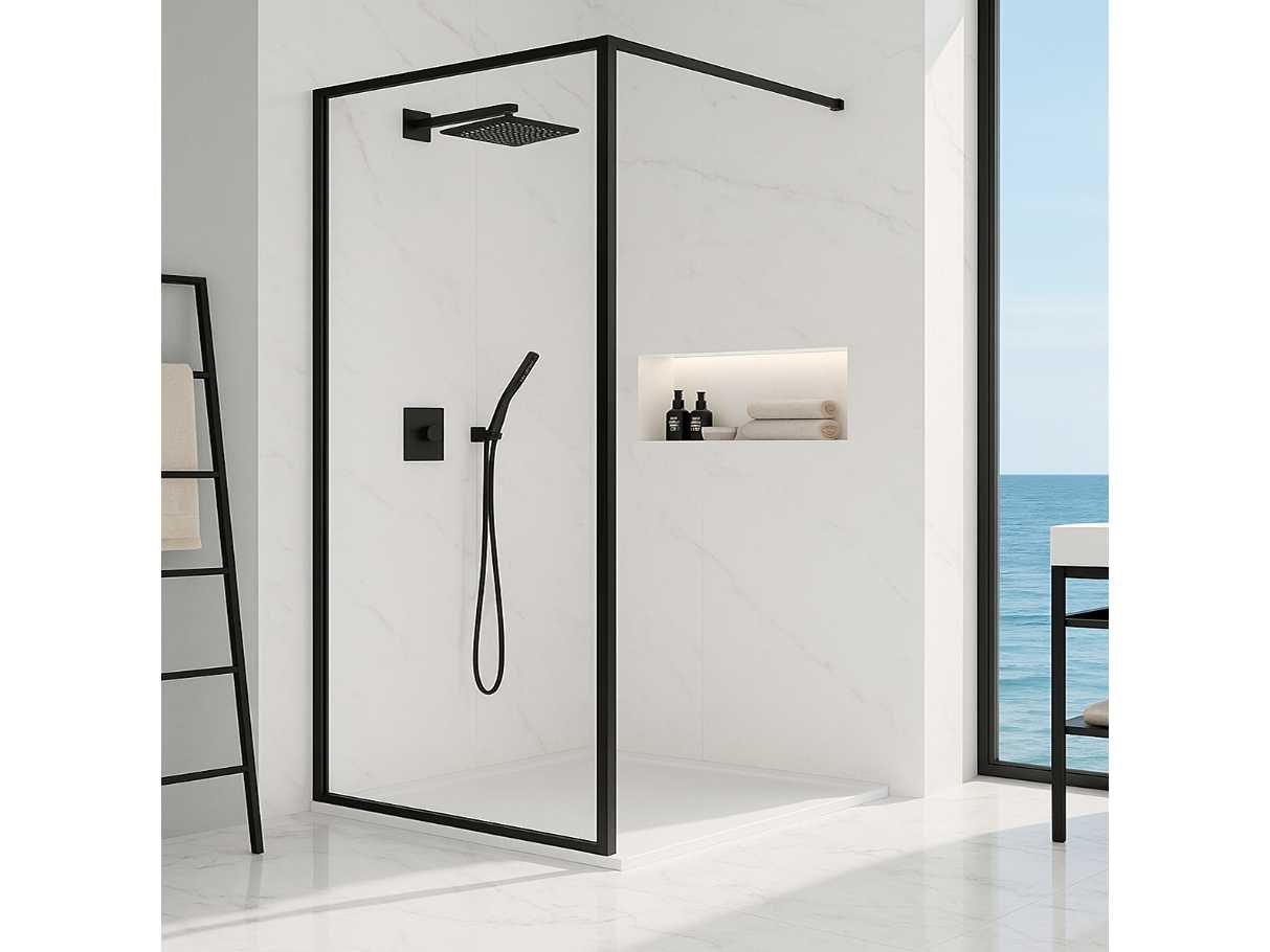 Antikalkbehandeling - NANO-EASY CLEANING GLAS; B 860 x H 2000 mm - Mat zwart kader profiel breedte 25 mm - Mat zwart muur profiel breedte 30 mm - Veiligheidsglas Glasdikte 8 mm - 100 cm mat zwart stabilisatiestang inclusief - 90BCF No Merk: Lavinno Model: 90 BCF Hoogte: 200cm Breedte: 90cm