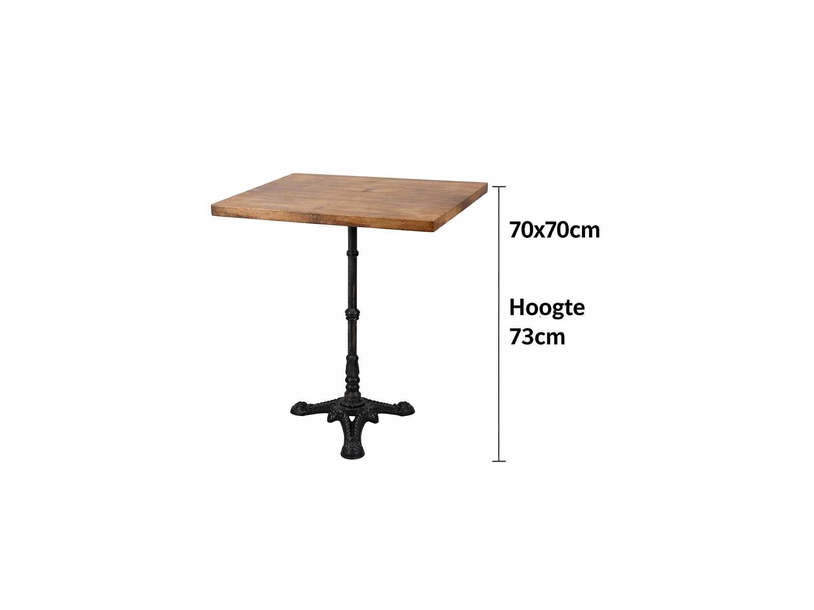 Voorzien van houten bovenblad en metalen voet. Afmeting bovenblad: 70x70cm Hoogte: 73cm 4 stuks No Totale afmeting L: 70cm Totale afmeting Breedte: 70cm Totale afmeting Hoogte: 73cm