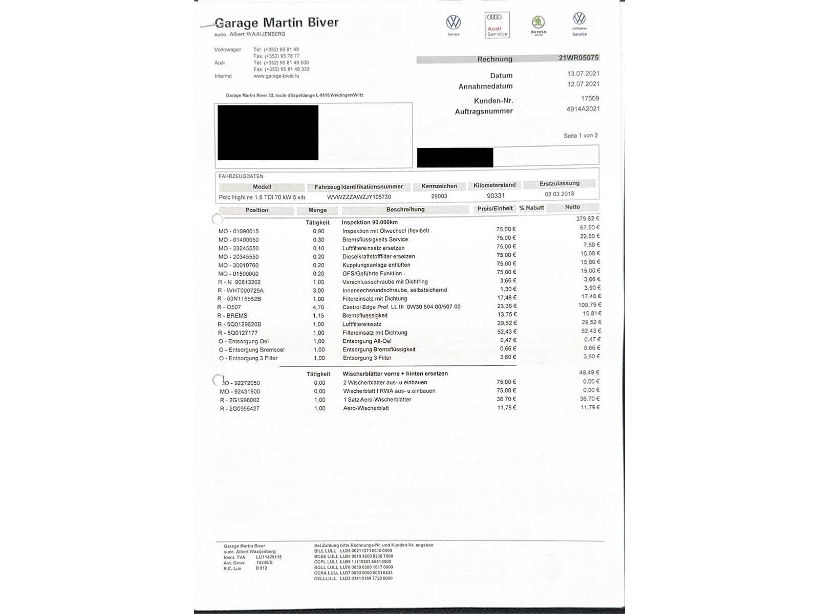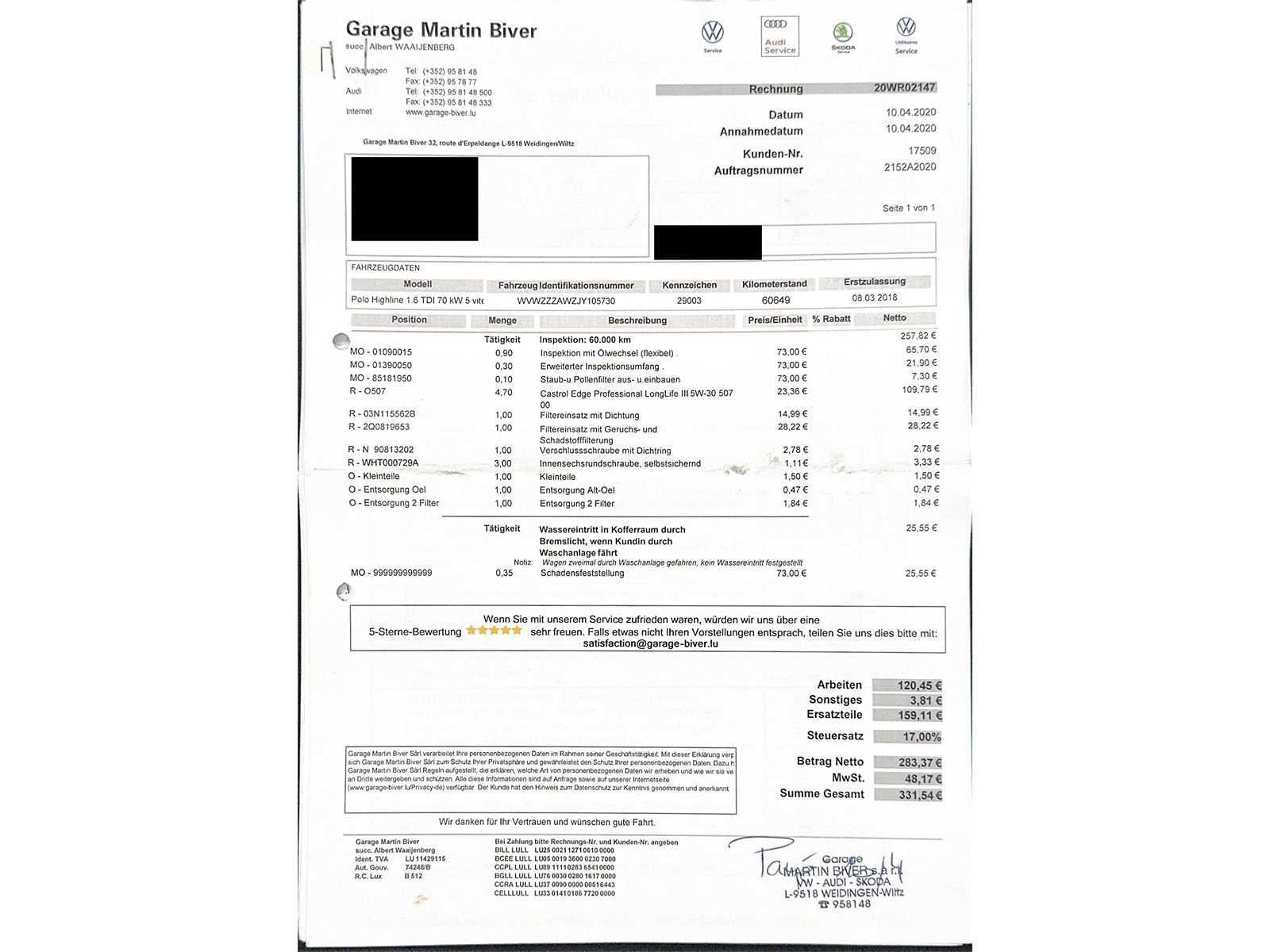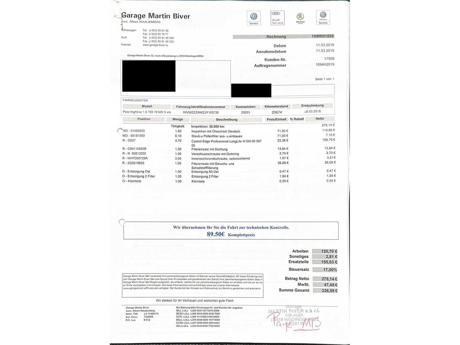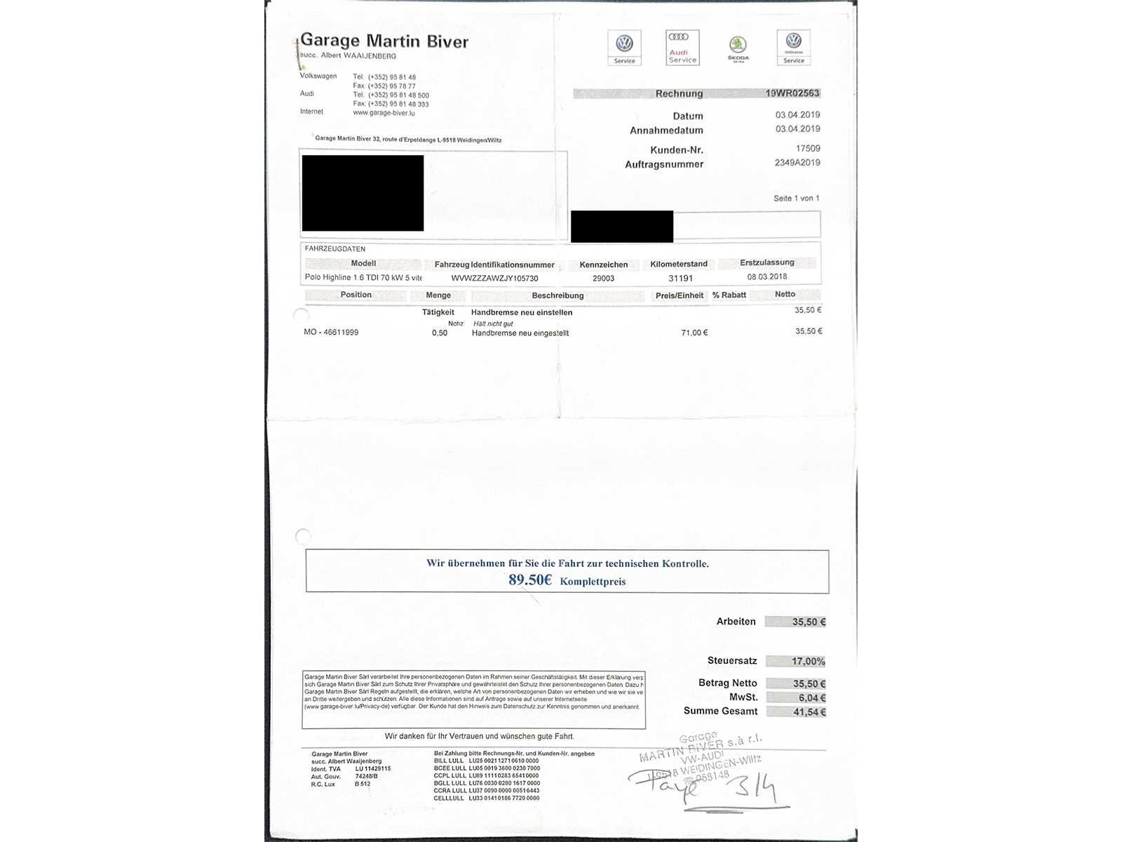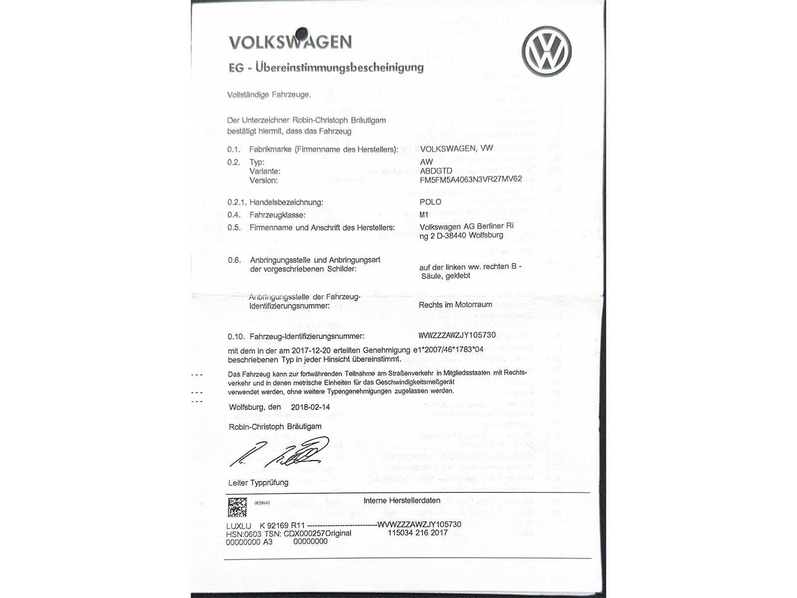 Tweedehands voertuig aangeboden op veiling door Carduc Auctions, een veilinghuis gevestigd in Luxemburg. Net als elk tweedehands voertuig kan het normale tekenen van slijtage vertonen, gerelateerd aan zijn leeftijd, kilometerstand en eerdere gebruik, zowel esthetisch als mechanisch. De informatie in deze mededeling wordt te goeder trouw gecommuniceerd, op basis van de beschikbare informatie. Carduc Auctions voert geen grondige technische inspectie van voertuigen uit. De informatie wordt uitsluitend verstrekt voor informatieve doeleinden, zodat bieders een zo volledig mogelijke beoordeling kunnen uitvoeren. De voertuigen bevinden zich in Luxemburg en kunnen op afspraak worden geraadpleegd, persoonlijk of via videoconferentie, volgens de voorwaarden die voor de verkoop zijn aangegeven. Gedetailleerde informatie over de voertuigen, huidige verkopen en praktische details is beschikbaar op de officiële website: https://carduc-auctions.lu. Voor vragen voordat een verkoop wordt afgerond: sales@carduc-auctions.lu. Tel: +352 621 595 373. Non Merk: Volkswagen Model: Polo Bouwjaar: 03-2018 Afgelezen kilometerstand: 163306km Cilinderinhoud: 1599cc Vermogen (kW): 70kW Brandstof: Diesel Chassisnummer: WVWZZZAWZJY105730 Vermogen (pk): 95hp Energielabel: 5 Kleur: Blauw Transmissie: Handboek Aantal cilinders: 4 Nationaliteit documenten: Luxemburg Onderhoudshistorie: Ja Gelijkvormigheidsattest aanwezig: waar Start en rijdt: Ja startinformatie : Ja Airconditioning: true Navigatie: true LED-koplampen: true Inschrijvingsbewijs - deel 1 : Ja Inschrijvingsbewijs - deel 2: Ja