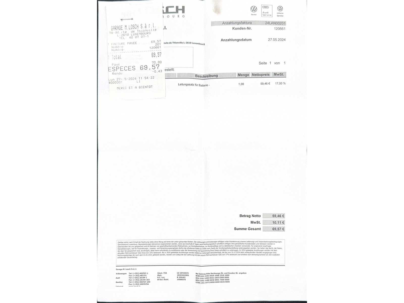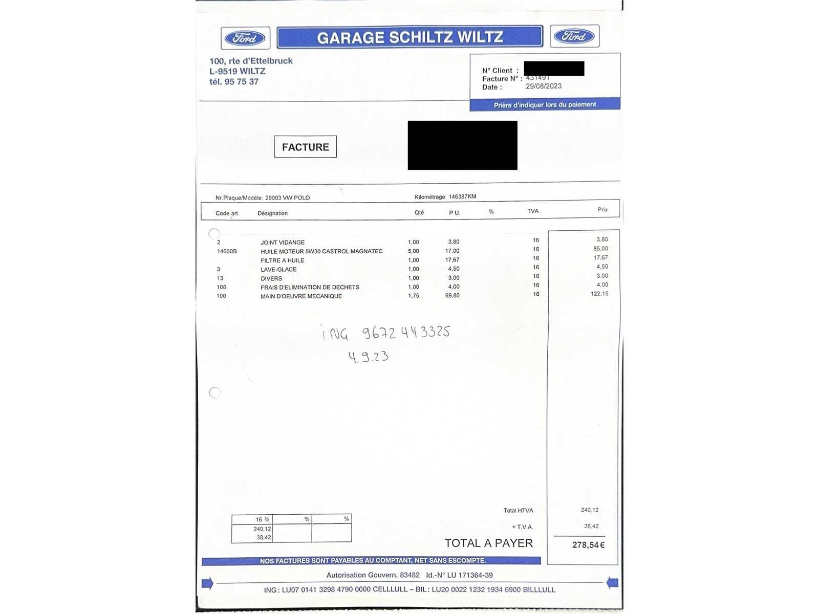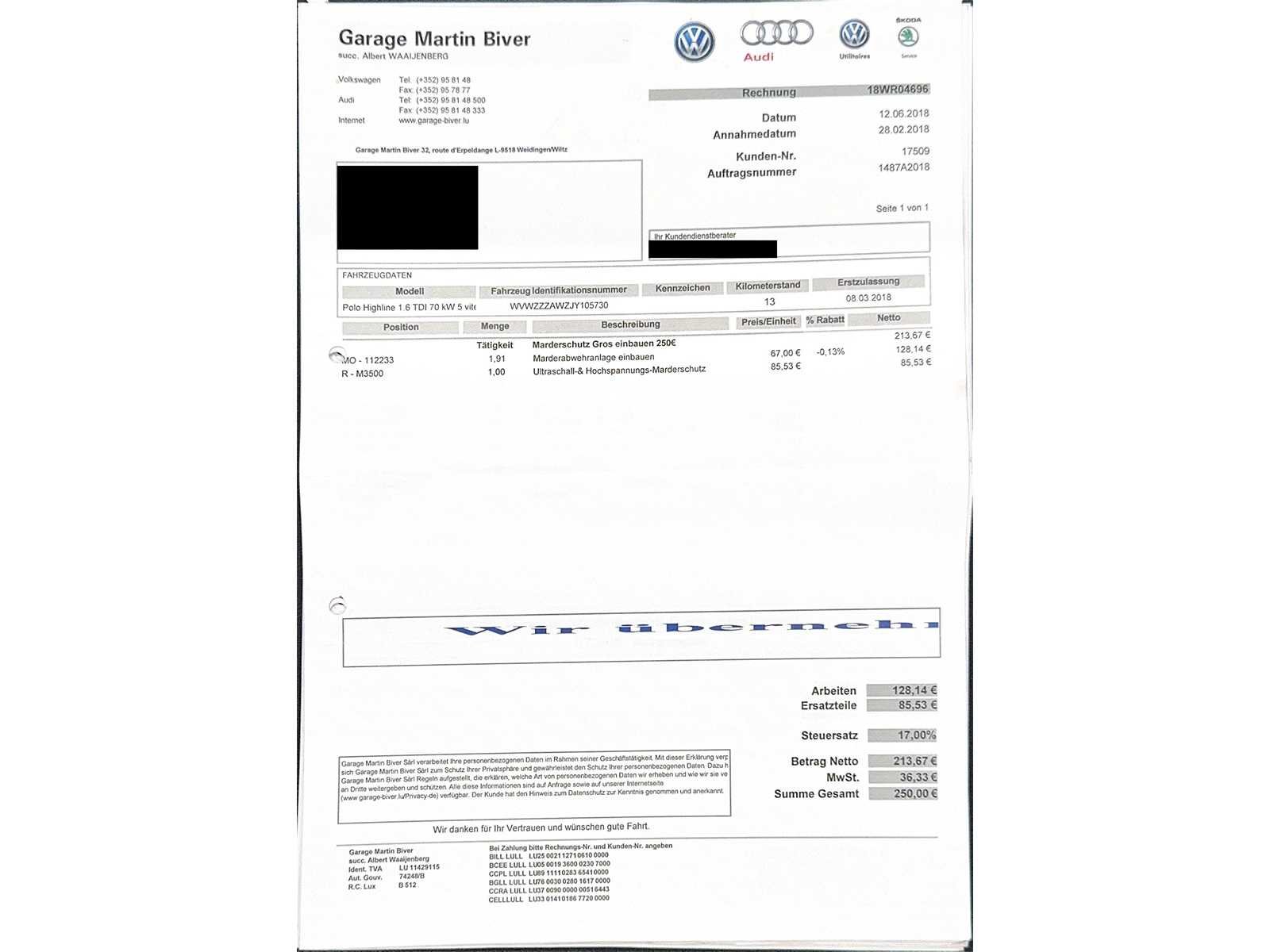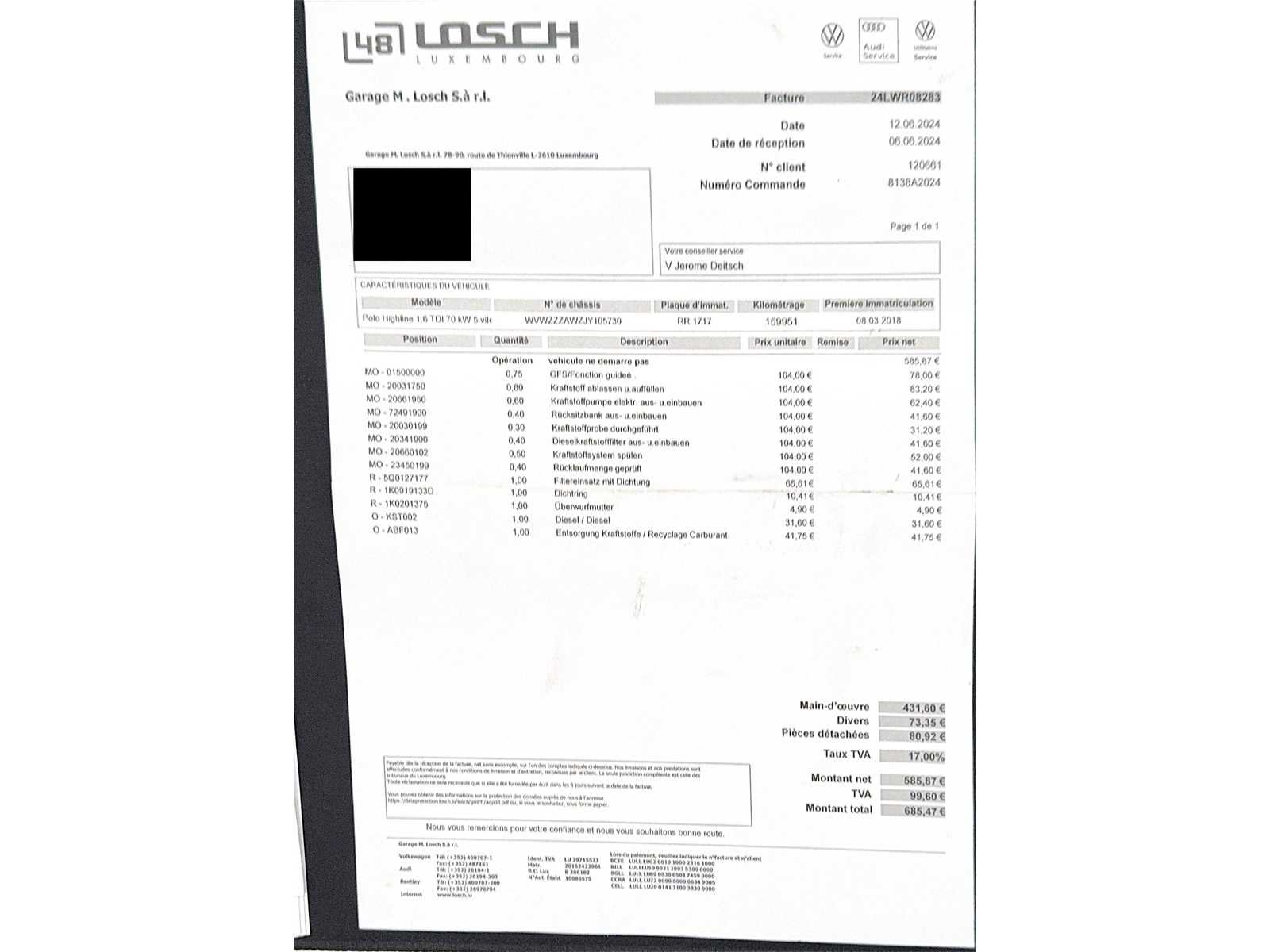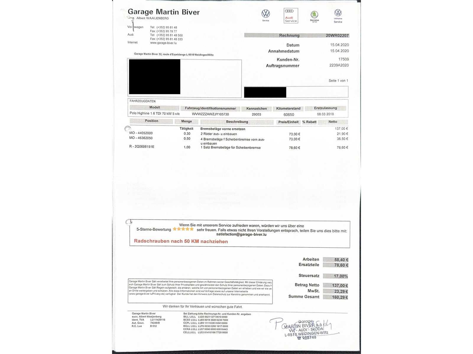 Tweedehands voertuig aangeboden op veiling door Carduc Auctions, een veilinghuis gevestigd in Luxemburg. Net als elk tweedehands voertuig kan het normale tekenen van slijtage vertonen, gerelateerd aan zijn leeftijd, kilometerstand en eerdere gebruik, zowel esthetisch als mechanisch. De informatie in deze mededeling wordt te goeder trouw gecommuniceerd, op basis van de beschikbare informatie. Carduc Auctions voert geen grondige technische inspectie van voertuigen uit. De informatie wordt uitsluitend verstrekt voor informatieve doeleinden, zodat bieders een zo volledig mogelijke beoordeling kunnen uitvoeren. De voertuigen bevinden zich in Luxemburg en kunnen op afspraak worden geraadpleegd, persoonlijk of via videoconferentie, volgens de voorwaarden die voor de verkoop zijn aangegeven. Gedetailleerde informatie over de voertuigen, huidige verkopen en praktische details is beschikbaar op de officiële website: https://carduc-auctions.lu. Voor vragen voordat een verkoop wordt afgerond: sales@carduc-auctions.lu. Tel: +352 621 595 373. Non Merk: Volkswagen Model: Polo Bouwjaar: 03-2018 Afgelezen kilometerstand: 163306km Cilinderinhoud: 1599cc Vermogen (kW): 70kW Brandstof: Diesel Chassisnummer: WVWZZZAWZJY105730 Vermogen (pk): 95hp Energielabel: 5 Kleur: Blauw Transmissie: Handboek Aantal cilinders: 4 Nationaliteit documenten: Luxemburg Onderhoudshistorie: Ja Gelijkvormigheidsattest aanwezig: waar Start en rijdt: Ja startinformatie : Ja Airconditioning: true Navigatie: true LED-koplampen: true Inschrijvingsbewijs - deel 1 : Ja Inschrijvingsbewijs - deel 2: Ja