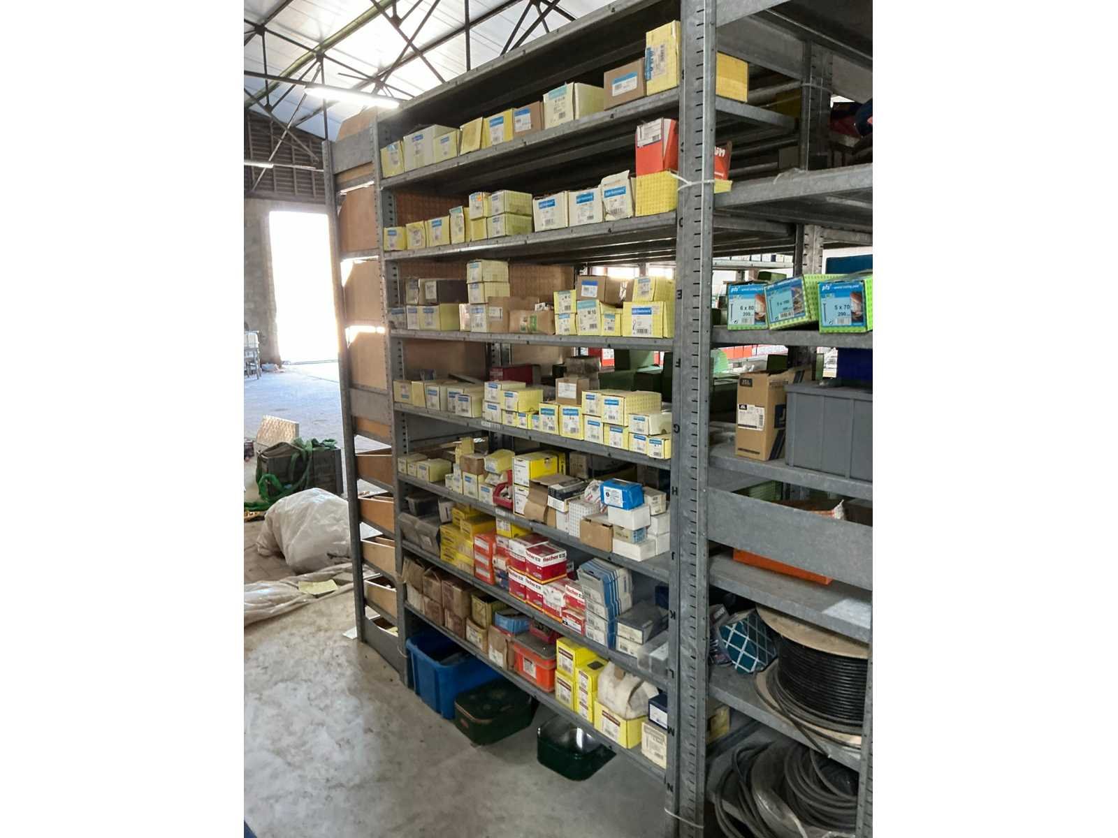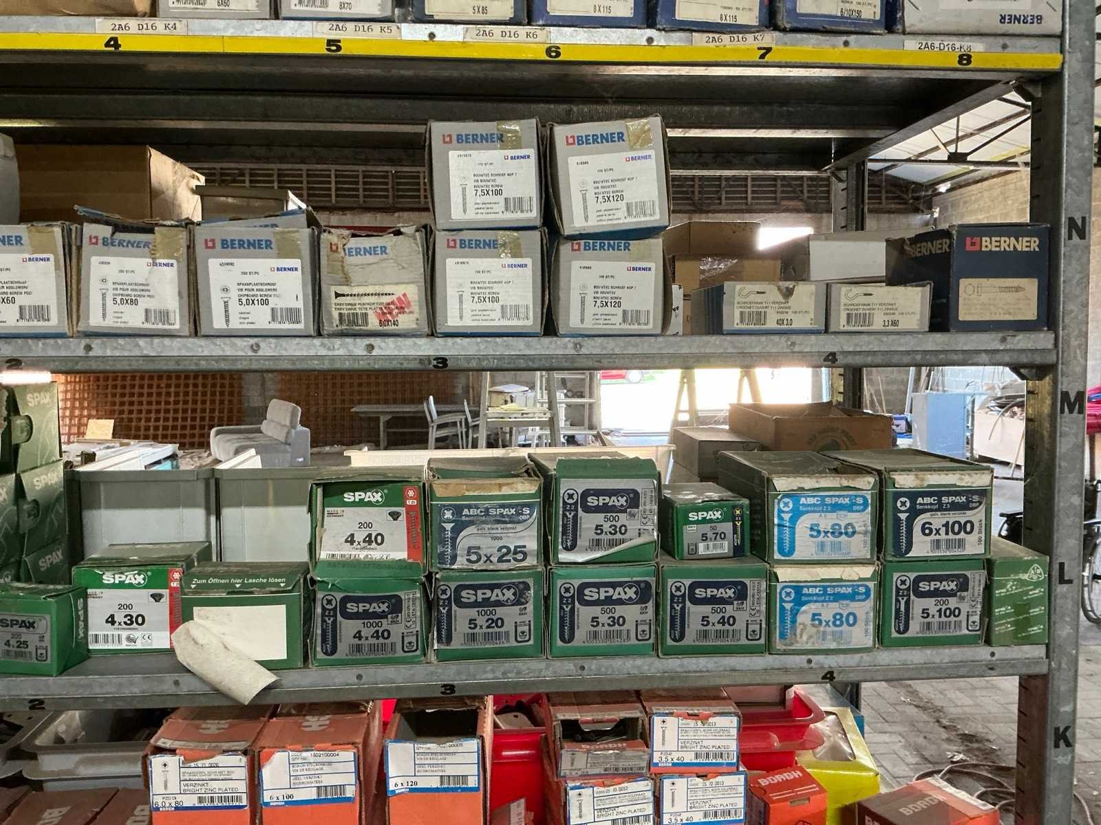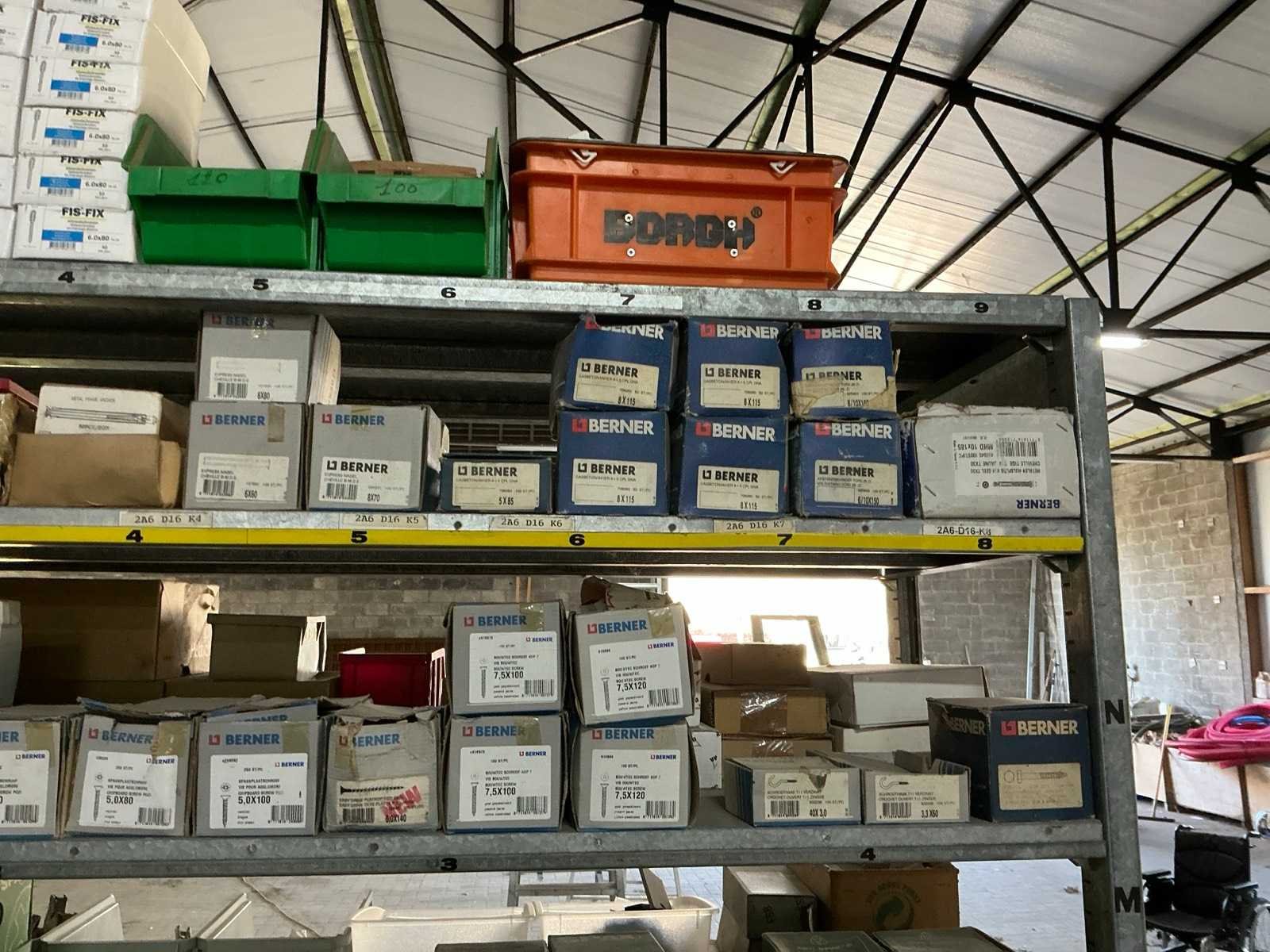 Waaronder SPAX, Borgh, Berner, PGB, Fischer, PFS, Spit,…, waaronder schroeven, pluggen, slagpluggen, nagels, waaronder houtschroeven, stelschroeven, plaatschroeven, partij balkdragers U-vorm FG, divers deurbeslag, diverse koekjes Lamello, muurbevestigingen, bouten, moeren en rondellen, compleet met enig installatiemateriaal waaronder inbouwdozen, elektriciteitskabels, stekkerdozen, afdekplaatjes,…, compleet met 7lpm magazijnstelling Nee