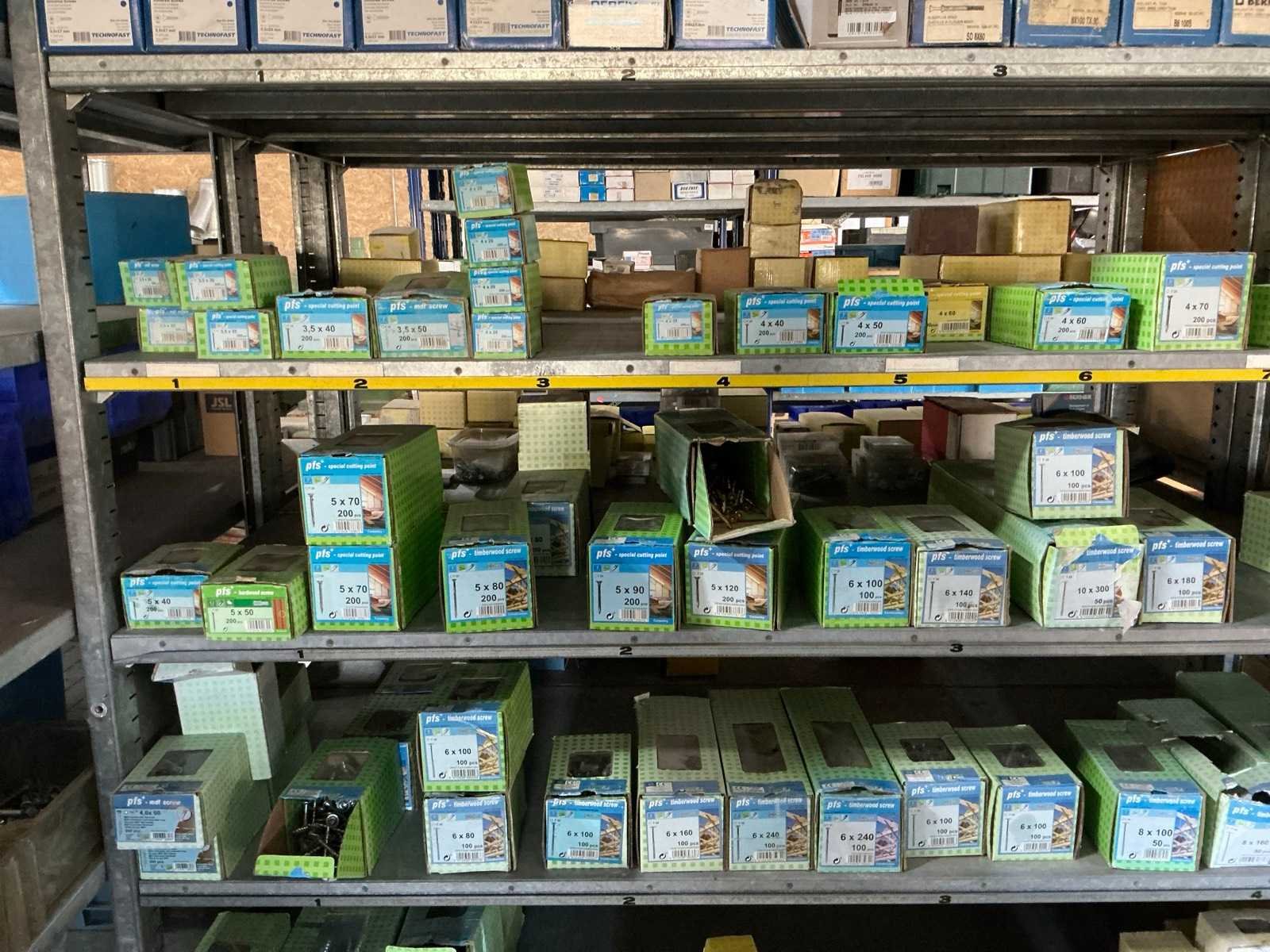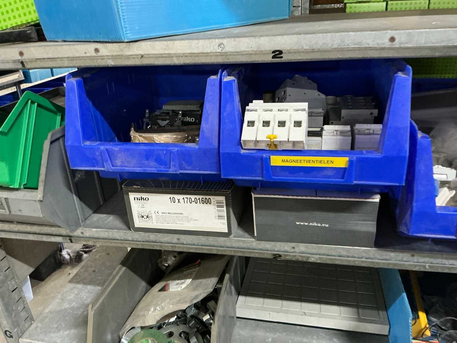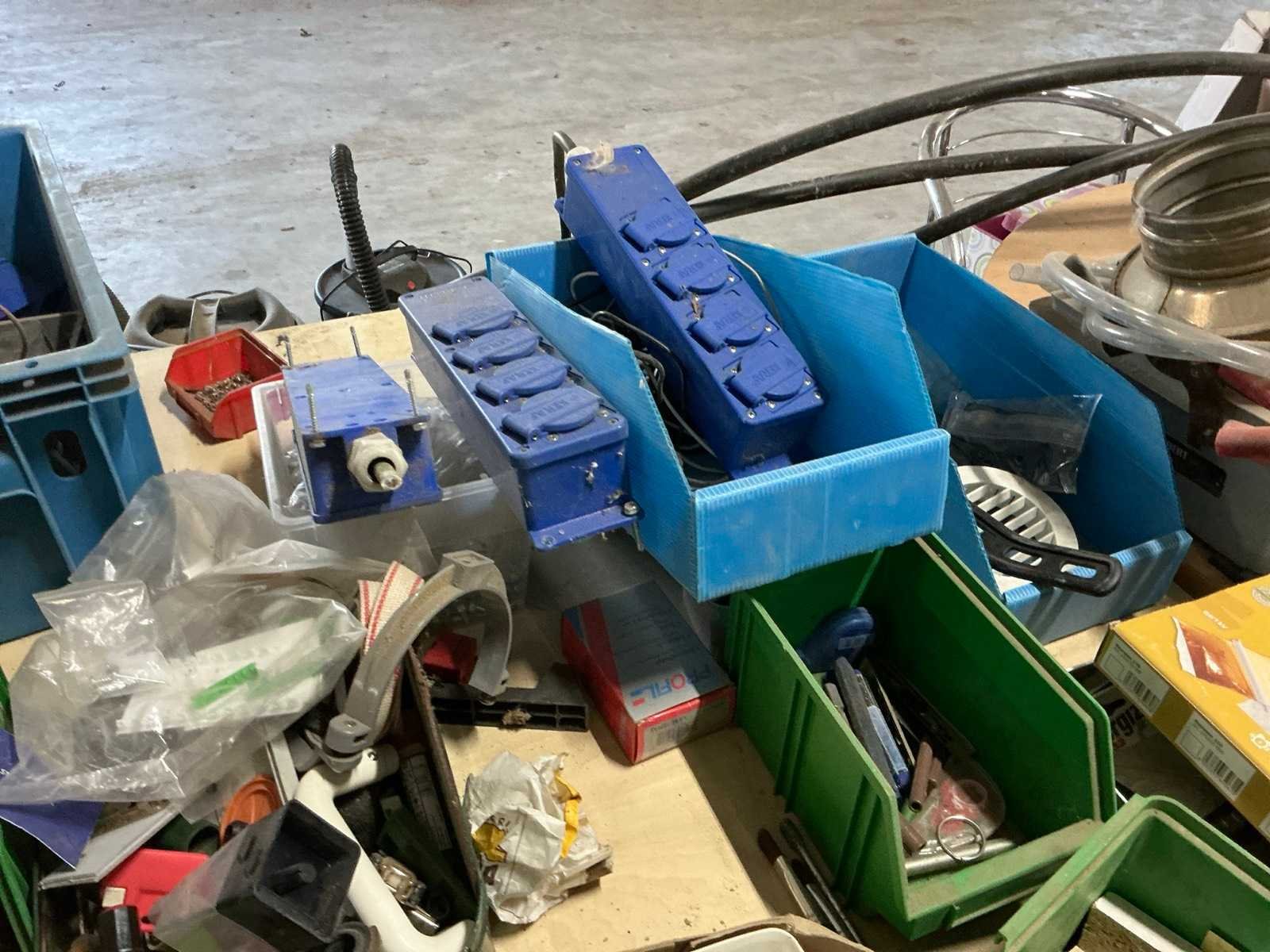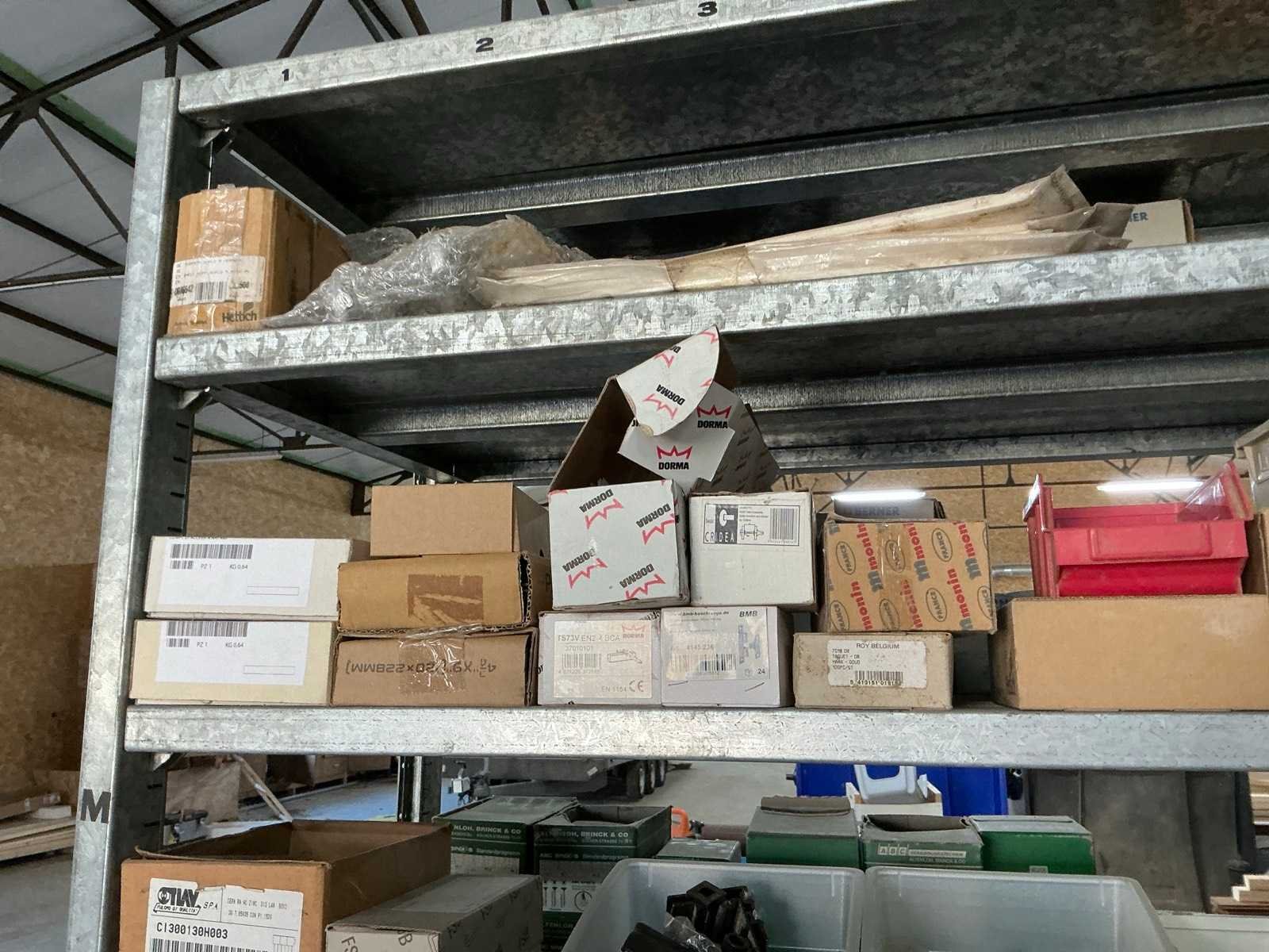 Waaronder SPAX, Borgh, Berner, PGB, Fischer, PFS, Spit,…, waaronder schroeven, pluggen, slagpluggen, nagels, waaronder houtschroeven, stelschroeven, plaatschroeven, partij balkdragers U-vorm FG, divers deurbeslag, diverse koekjes Lamello, muurbevestigingen, bouten, moeren en rondellen, compleet met enig installatiemateriaal waaronder inbouwdozen, elektriciteitskabels, stekkerdozen, afdekplaatjes,…, compleet met 7lpm magazijnstelling Nee
