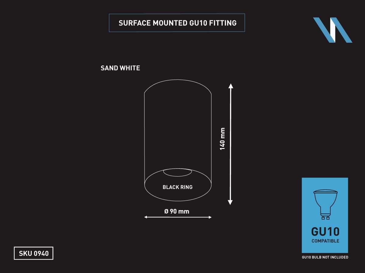 Afdichting IP20, product kleur zand wit zwart, afm. Ø 90 x 140mm,bevestiging inclusief, materiaal aluminium, fitting GU10, bulb niet inbegrepen, geschikt voor binnen, een bulb invoer, voltage 220-240V, SKU 0940 No Merk: LAMPINNO Product type: Binnen Fitting: GU10 Kleur: zwart en wit Lengte: 14.0cm Breedte: 9.0cm Materiaal: Aluminium