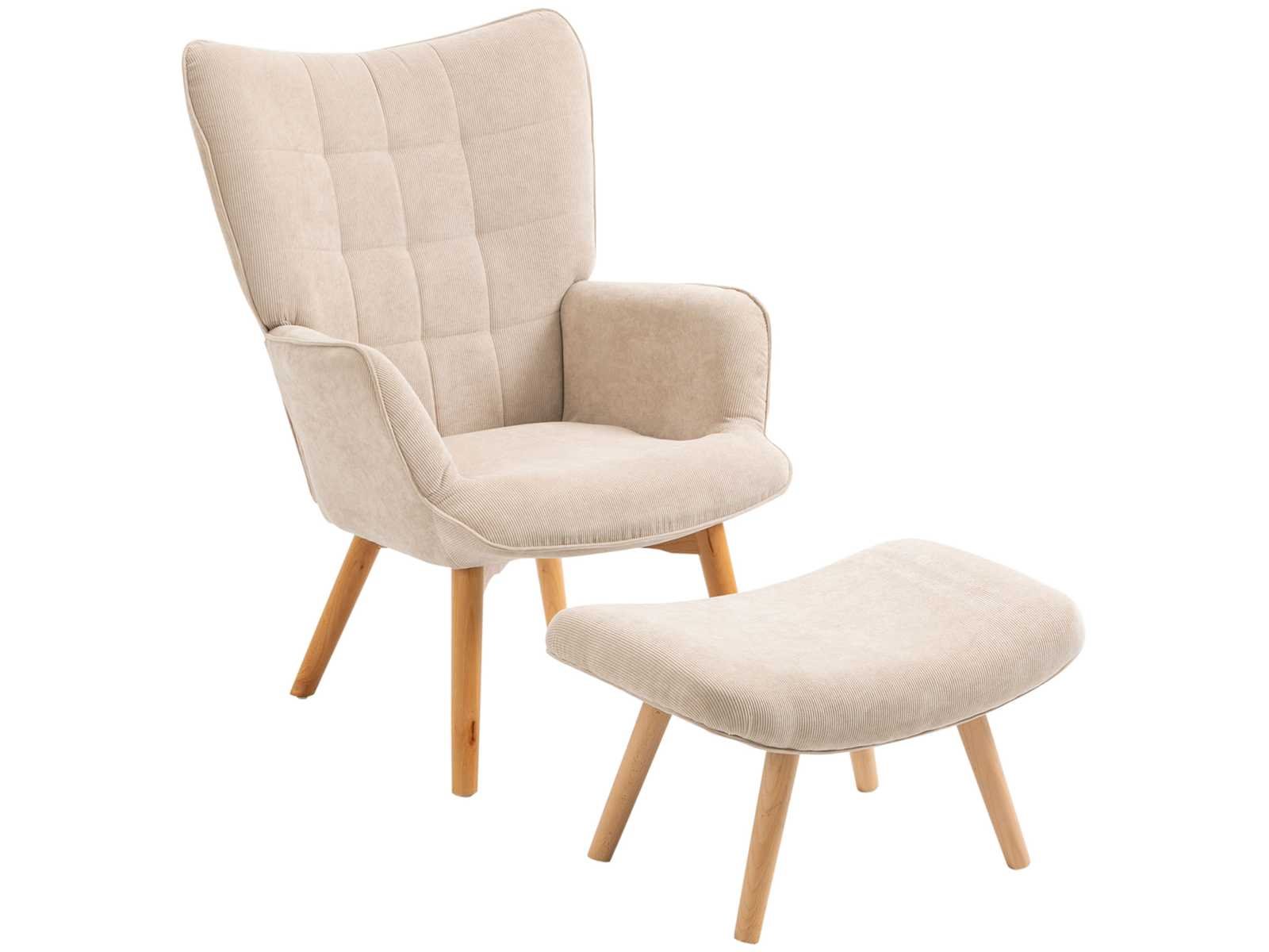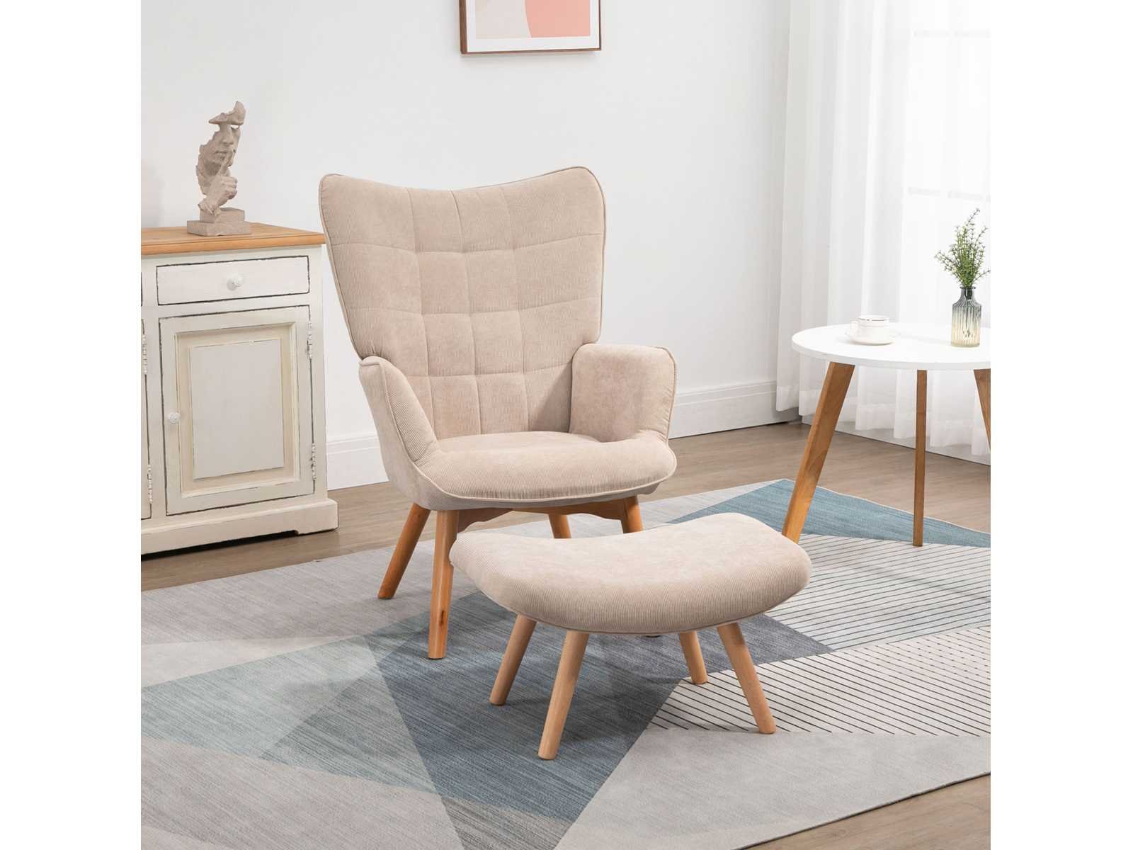 Fauteuil met voetensteun, hoge rugleuning, houten poten en stof die op een corduroy-look lijkt
