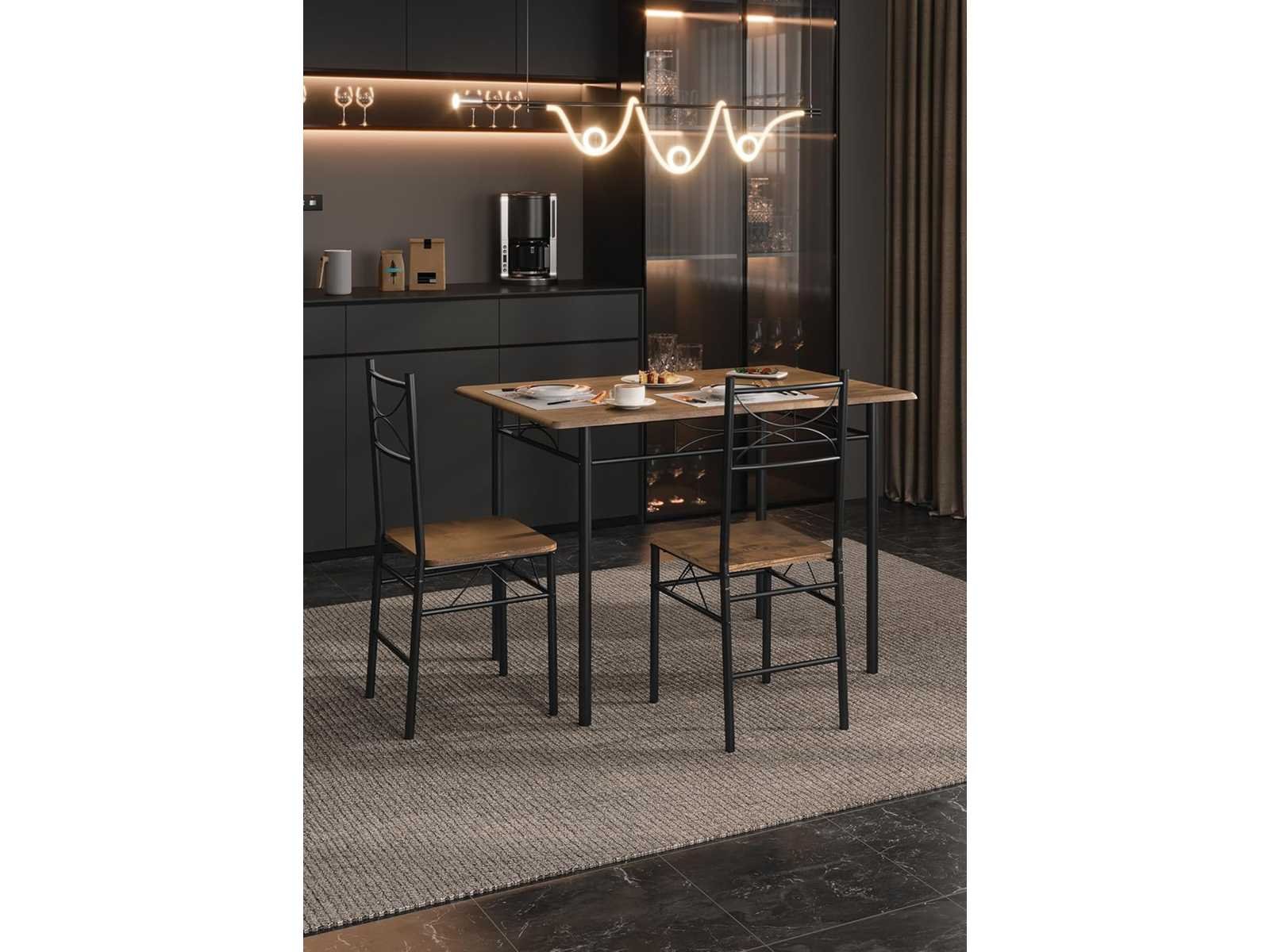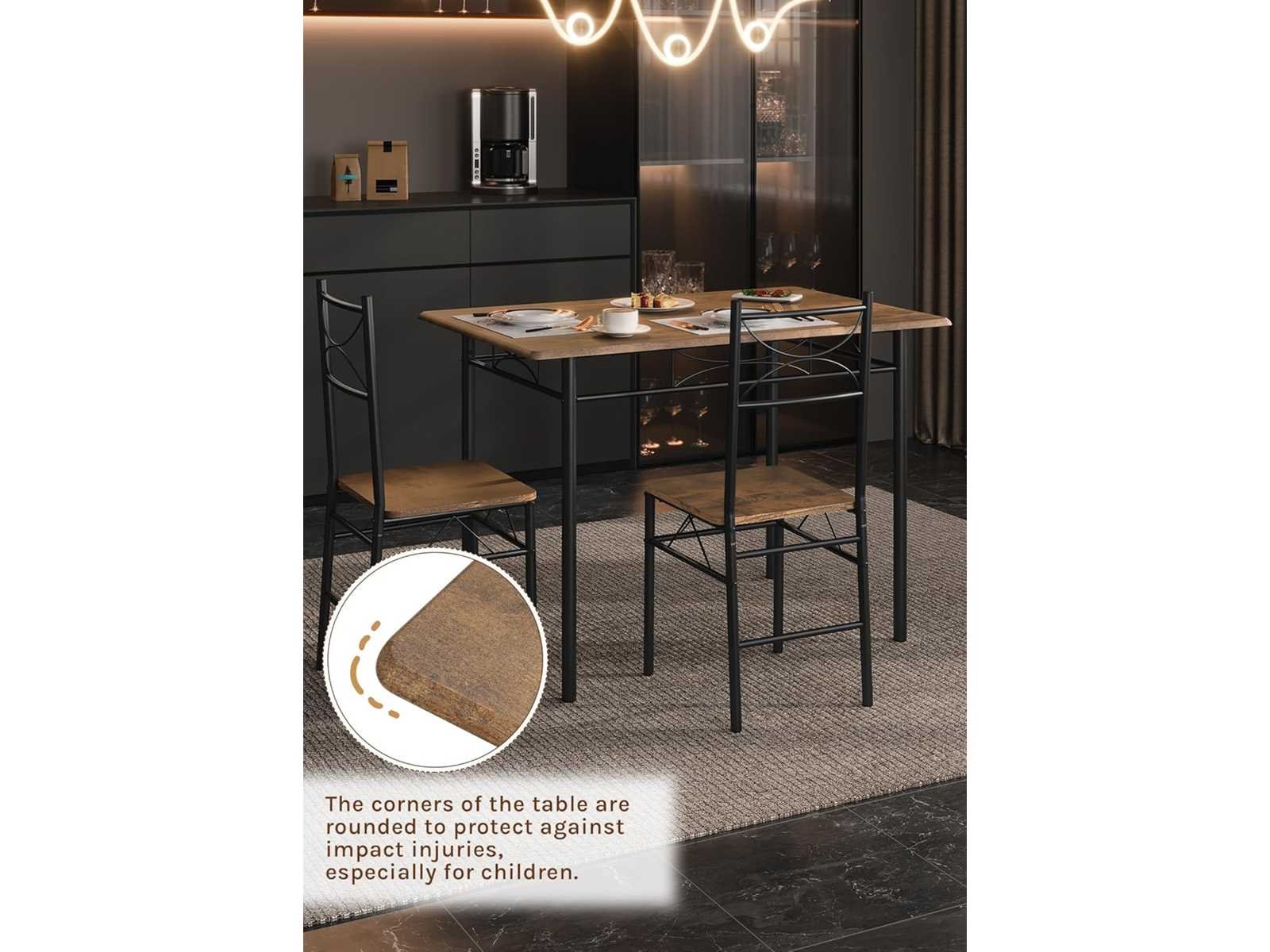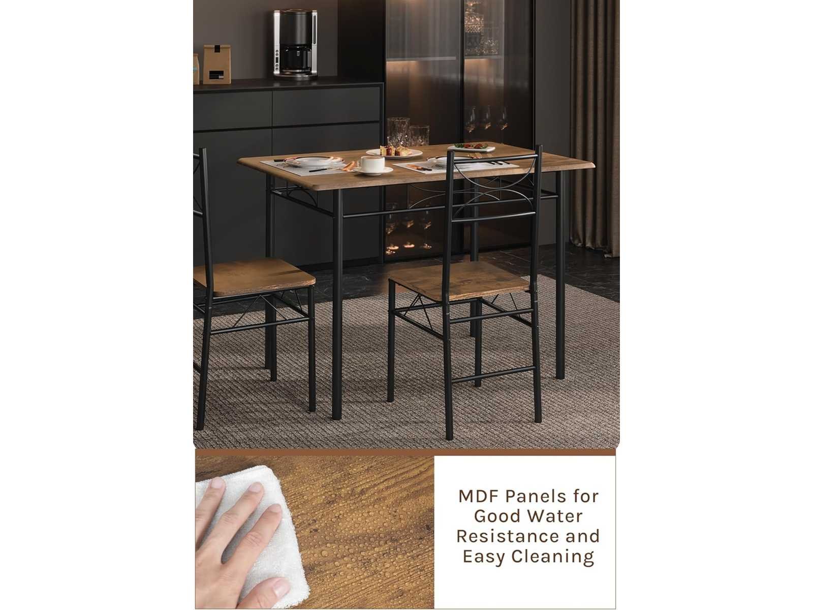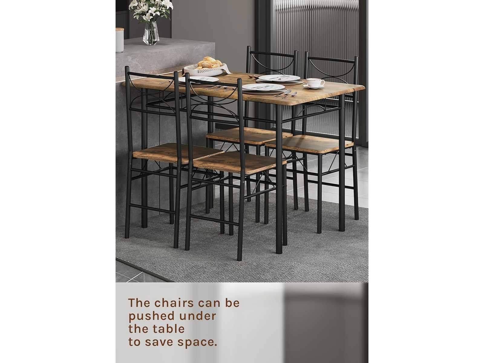 ESTHETISCH & MODERN: Deze WOLTU eettafel voor 4 personen heeft een minimalistisch, modern ontwerp dat naadloos opgaat in een eetkamer, balkon of bar. Het zilver/zwart metalen frame, poedercoat, is stabiel en stijlvol. Stabiel en stevig: Het tafelblad en de stoelstoel zijn gemaakt van hoogwaardige MDF en worden ondersteund door 4 stevige metalen buizen, wat veiligheid en duurzaamheid garandeert. Het tafelblad draagt tot 50 kg en elke stoel tot 136 kg. VEELZIJDIGHEID EN RUIMTEBESPARING: Verkrijgbaar in wit en rustiek bruin, heeft deze tafel- en stoelset een eenvoudige, vintage stijl die aan veel doeleinden voldoet. De stoelen schuiven onder de tafel om de ruimte te optimaliseren. COMFORTABELE ZITPLAATSEN: De brede zitting en hoge rugleuning bieden uitstekende ondersteuning voor de wervelkolom en zorgen voor optimaal comfort, zelfs na een lange periode van inactiviteit. Deze set is veel meer dan alleen een tafel en stoelen; Het belichaamt een hoogwaardige kunst van leven, synoniem met comfort en welzijn. EENVOUDIG SCHOON TE MAKEN EN TE ASSEMBLEREN: Het met PVC gecoate MDF-plaatje en metalen constructie zijn eenvoudig schoon te maken met een zachte doek. Er wordt een gedetailleerde handleiding verstrekt om het eenvoudig te maken om dit eettafelset in elkaar te zetten. Non