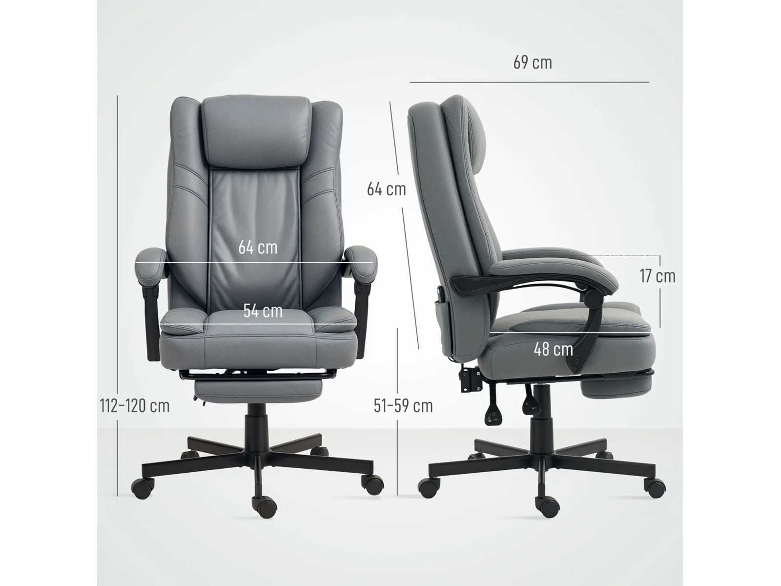 Technische specificaties: ? Kleur: Grijs ? Materiaal: Microvezelstof, schuim, meerlaagse plaat, metaal ? Totale afmetingen: 64L x 69B x 112-120H cm ? Landschapsafmetingen: 64 V x 140 V x 97 M cm ? Zitafmetingen: 54 B x 48 D cm ? Zithoogte: 51-59 cm ? Achterafmetingen: 53 L x 64 L cm ? Dikte van zit- en rugleuning: 15 cm ? Hoogte van de armleuningen bij de zitplaats: 17 cm ? Lengte van het stroomsnoer: 1,4 m ? Laadvermogen: 120 kg ? Ingang: 220-240 V, 50/60 Hz ? Uitgang: 12 V, 24 W Non