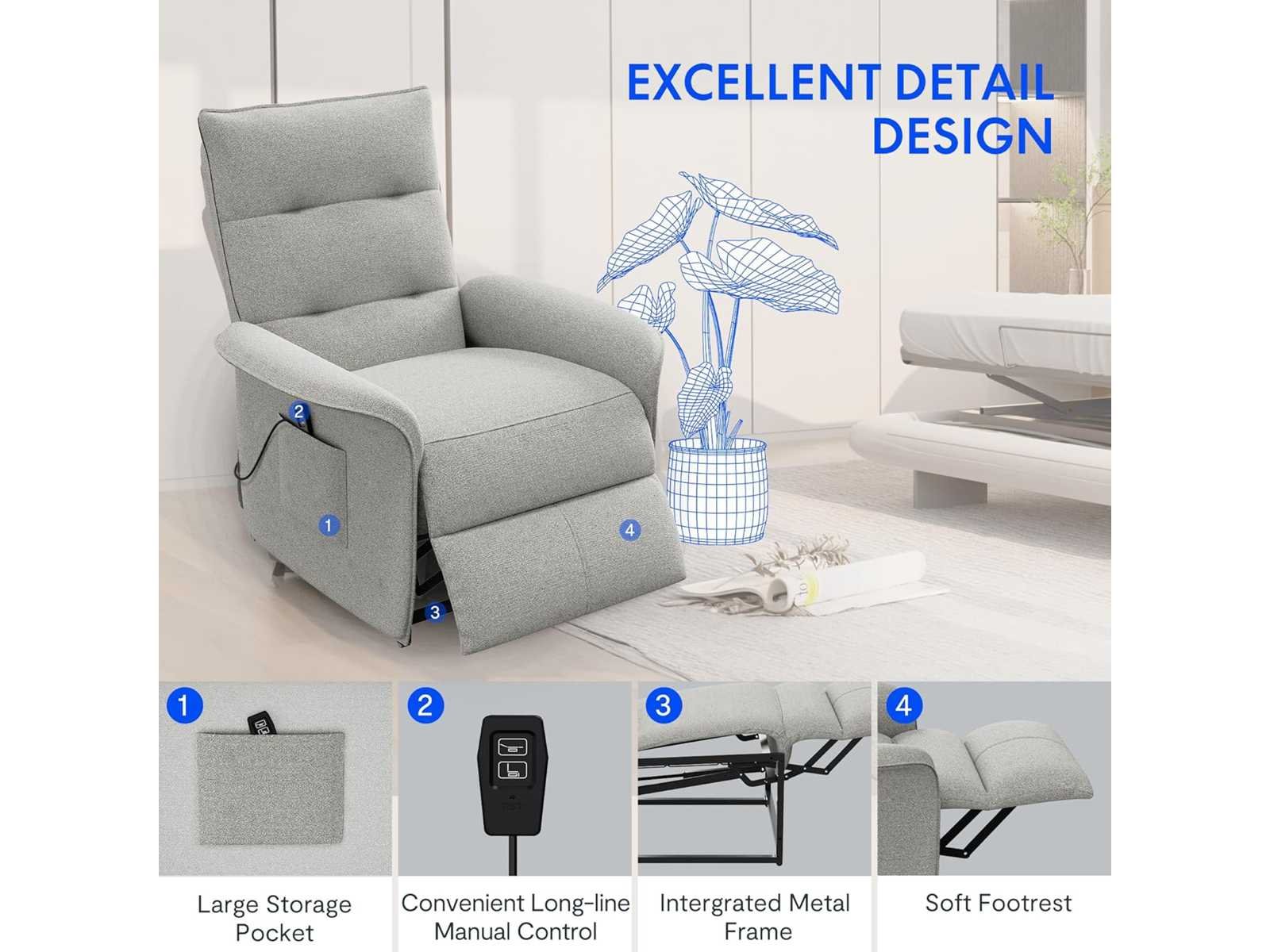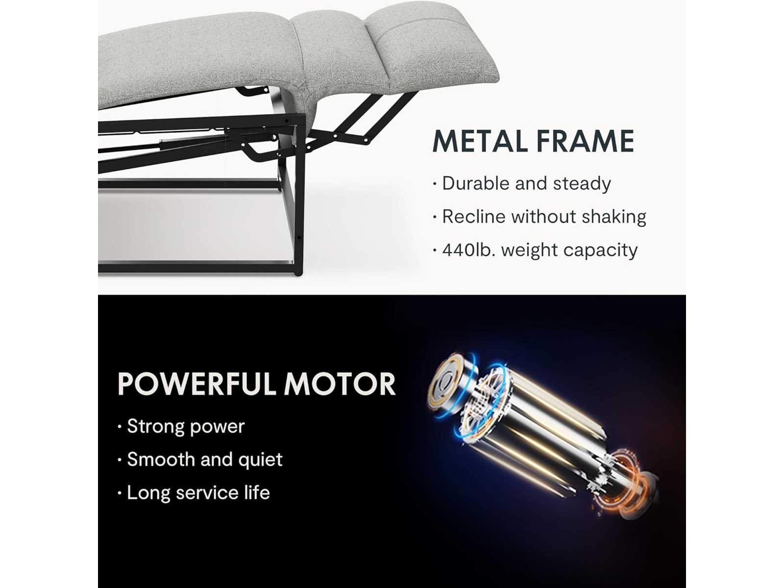 Merknaam FLEXISPOT Kleur Lichtgrijs Productafmetingen: 82 cm (D) x 77 cm (W) x 104 cm (H) Maat x1 Elektrisch Rugstijl Massieve Rug BEENRESET Onze elektrische bank gebruikt simultane resettechnologie, met één-aanraking bediening voor op- en neerbewegingen. De hellingshoek is breed, van 105° tot 155°. Zitten, liggen of liggen, alles is mogelijk met één druk op de knop. Geniet ten volle van je bank. Ergonomisch ontwerp: de rugleuning, zadel en voetsteun zijn verdeeld in drie zones die perfect passen bij de vorm van het lichaam. Of je nu zit of ligt, je geniet van uitstekende ondersteuning. Het helpt je vermoeidheid te verminderen en thuis te ontspannen. Robuust en duurzaam: Met een laadframe van 140 kg is het sterk en drukbestendig. De weerstand is meerdere keren getest onder gesimuleerde dagelijkse gebruiksomstandigheden om een optimale levensduur te garanderen. Uitgerust met een stille motor biedt het een prettige ervaring. Hoogwaardige materialen: De bank is bekleed met een zachte imitatie katoenen linnen stof die zacht, slijtvast, ademend en aangenaam aanvoelt. De schuimrubberen vulling met hoge dichtheid biedt omhullend comfort en optimale ondersteuning, waardoor elke keer een langdurige pasvorm bij elk gebruik wordt gegarandeerd. Geschikt voor veel situaties: het moderne ontwerp maakt onze bank ideaal voor verschillende omgevingen, zowel thuis als op kantoor. Wanneer hij opgevouwen is, neemt hij slechts 0,5 vierkante meter in beslag, waardoor je ruimte bespaart. Non