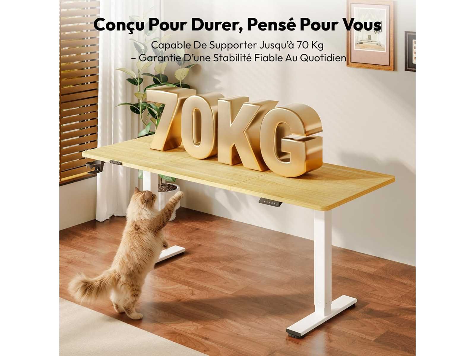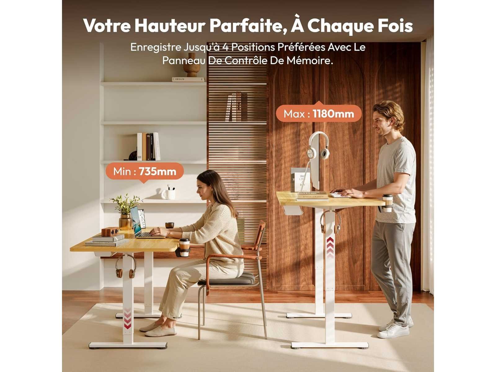 STRAK EN FUNCTIONEEL ONTWERP: Dit bureau heeft een strak en eigentijds ontwerp dat een vleugje elegantie aan je werkplek geeft. Naast het brede dienblad is het uitgerust met twee haken en een handige opbergdoos om koptelefoons, tassen en kleine spullen te organiseren, waardoor het ruimtegebruik wordt geoptimaliseerd en een professionele en nette omgeving wordt gehandhaafd. VERSTELBARE HOOGTE VOOR VEELZIJDIGHEID: Pas je werk- of rustpositie aan met een verstelbare hoogte van 73 cm tot 118 cm. Of je nu staand of zittend werkt, dit bureau past zich aan je behoeften aan en bevordert comfort en productiviteit gedurende de dag. NAADLOZE GEHEUGENCONTROLE: Het intuïtieve bedieningspaneel stelt je in staat meerdere gewenste hoogtes op te slaan en eenvoudig te wisselen tussen zitten en staan. De overgangen zijn soepel en moeiteloos. Dankzij de geïntegreerde kinderslotfunctie krijg je een veilige gebruiksfunctie, ideaal voor thuis- of zakelijke omgevingen. STIL WERKING: Met zijn ultrastille motor die op minder dan 50 dB werkt, zorgt dit bureau voor discrete op- en neergaan, zonder je concentratie te onderbreken. Ideaal voor thuiswerken, online vergaderingen of gedeelde kantoren, creëert het een rustige en professionele sfeer, bevorderlijk voor productiviteit en welzijn op dagelijkse basis. Non