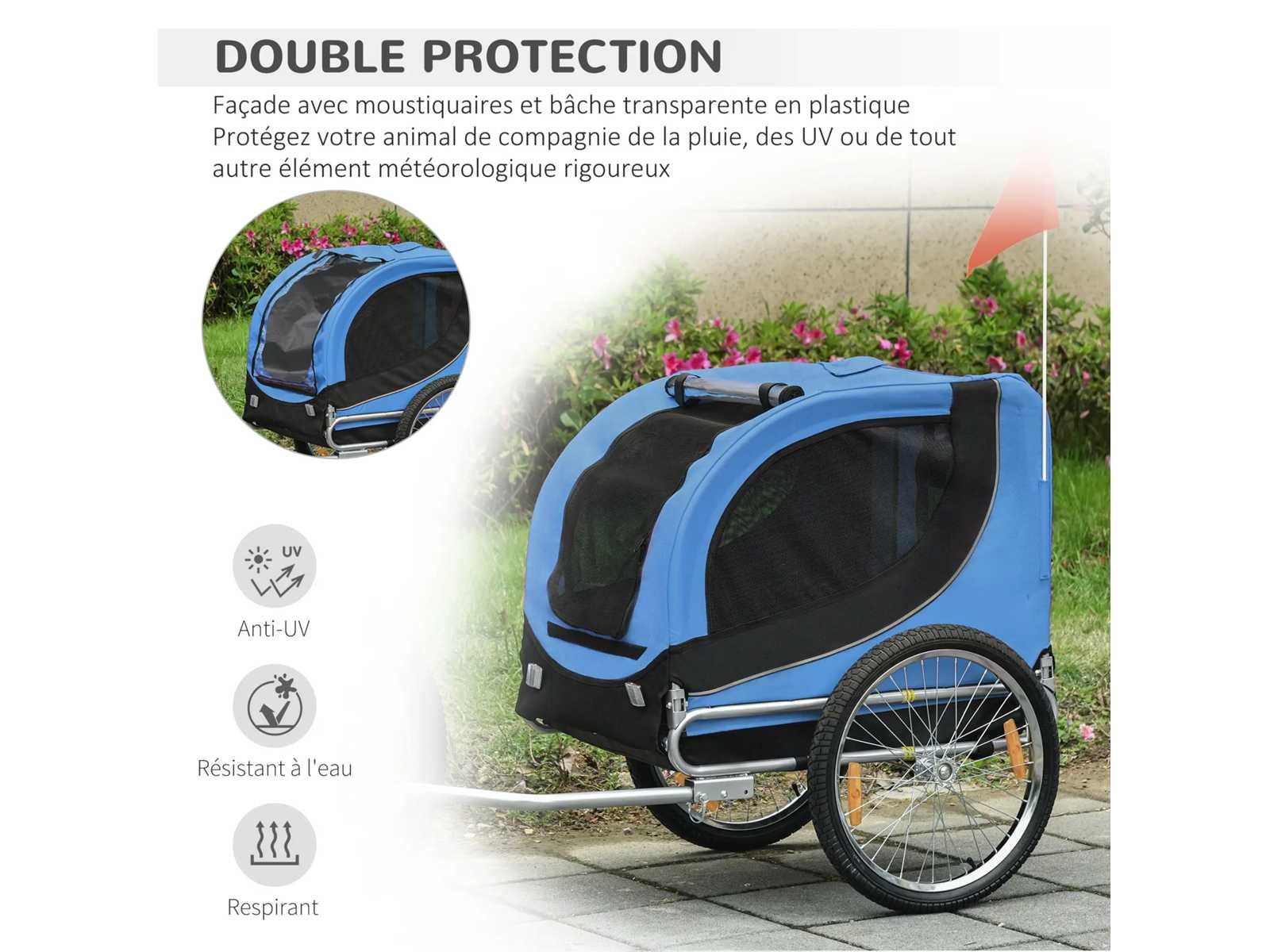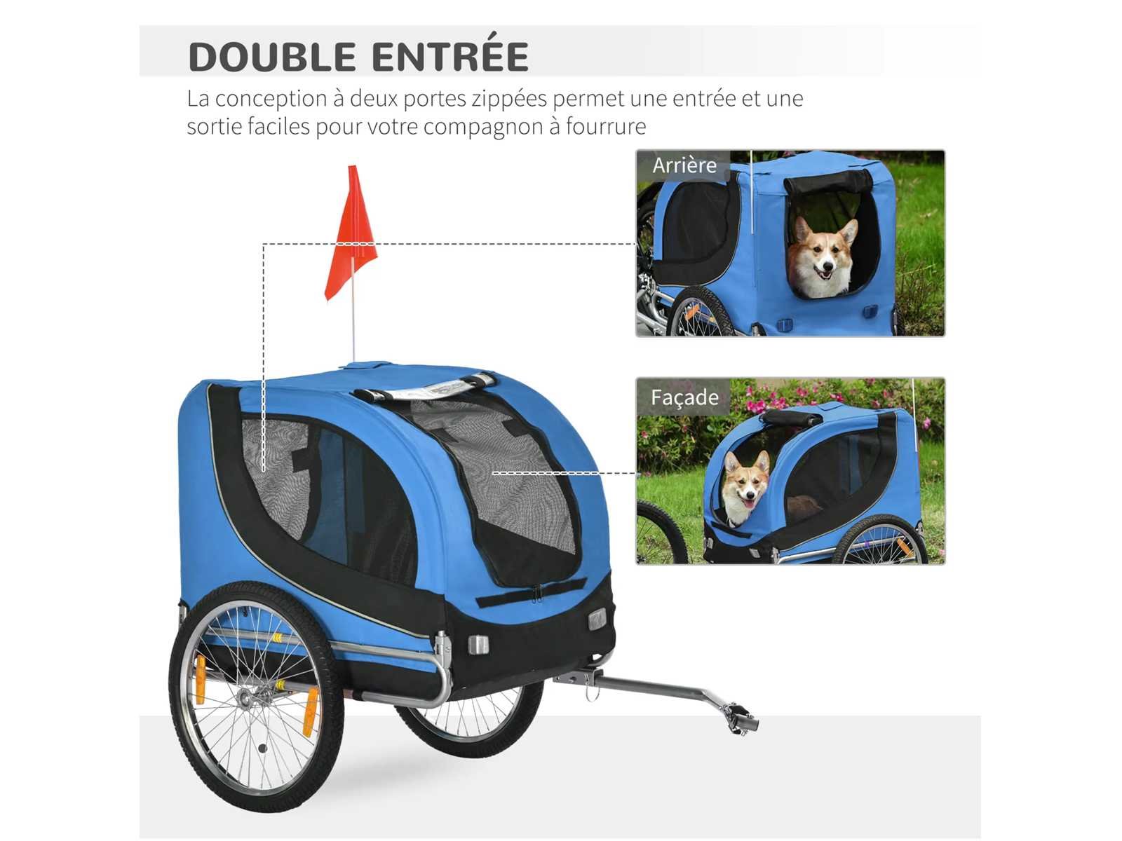 Hondenfietstrailer voor dieren met 8 zwarte blauwe vlag reflectoren