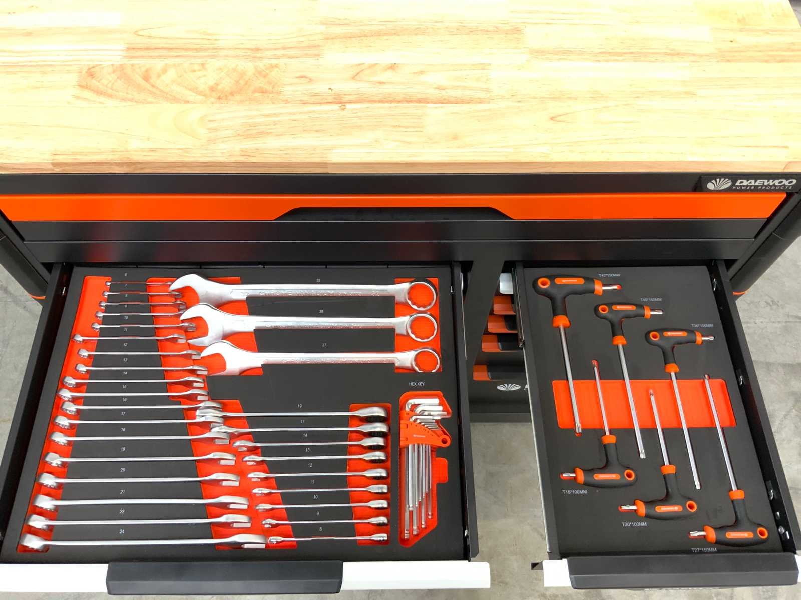 267 delig; 13 lades waarvan 11 lades gevuld; 12 tangen; 12 hamers; 8 Files ; 6 zeshoek sleutels; 6 T-Handle ; 21 schroevendraaiers; 40 steeksleutels; 10 imbus sleutels; 127 doppen en bitjes; 25 sleutels ; houten werkblad; verrijdbaar; remmen; 2 delen afsluitbaar; 5595 Nee Merk: Daewoo Model: DAMWS267 Type: 267 delig Lengte: 106cm Breedte: 57cm Hoogte: 110cm