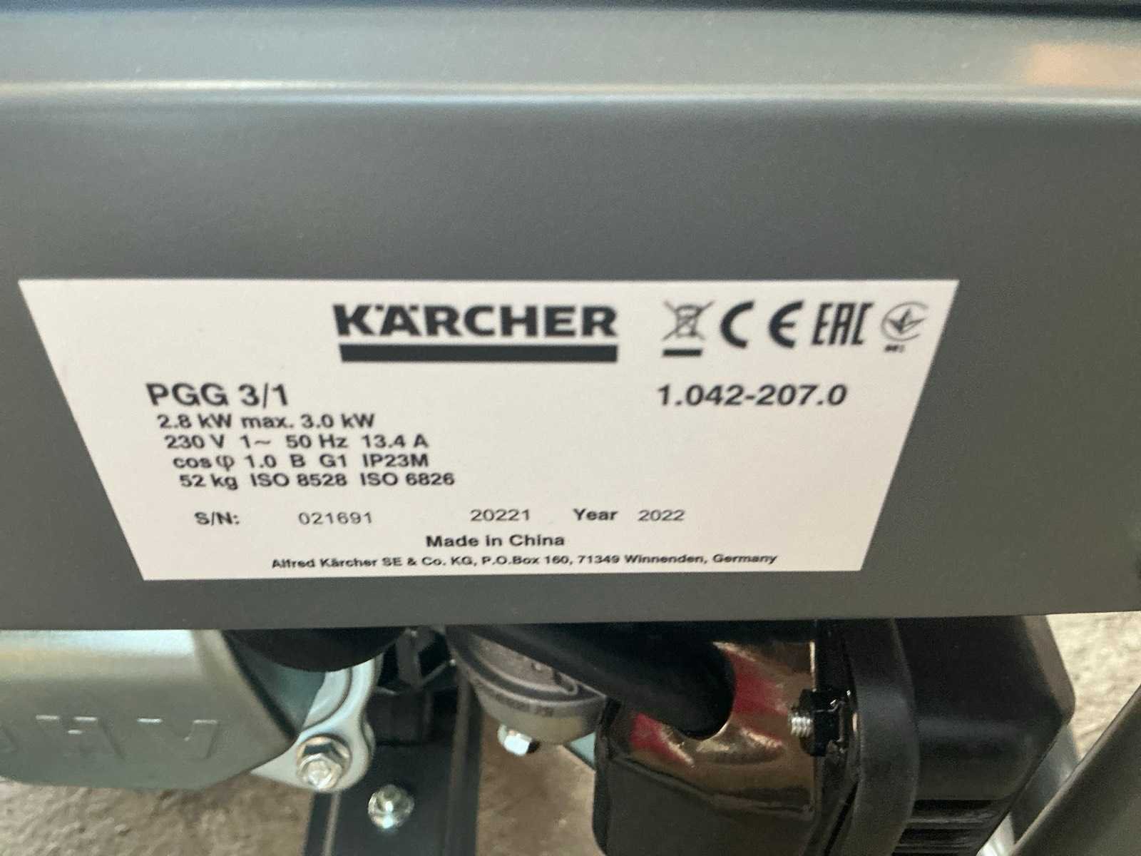 ONGEBRUIKT, voorzien van nog te monteren transportwielen, gebruikershandleiding, electro+ handgestart Nee Merk: Kärcher Type: PGG 3/1 Bouwjaar: 2022 Serienummer: 021697 Capaciteit.: 3kVA Benzine: true Type motor: Karcher Aantal cilinders: 1 Motorvermogen (kW): 2.8kW Luchtgekoeld: true Mobiel: true Machinegewicht: 52kg Totale afmeting L: 420mm Totale afmeting Breedte: 600mm Totale afmeting Hoogte: 450mm