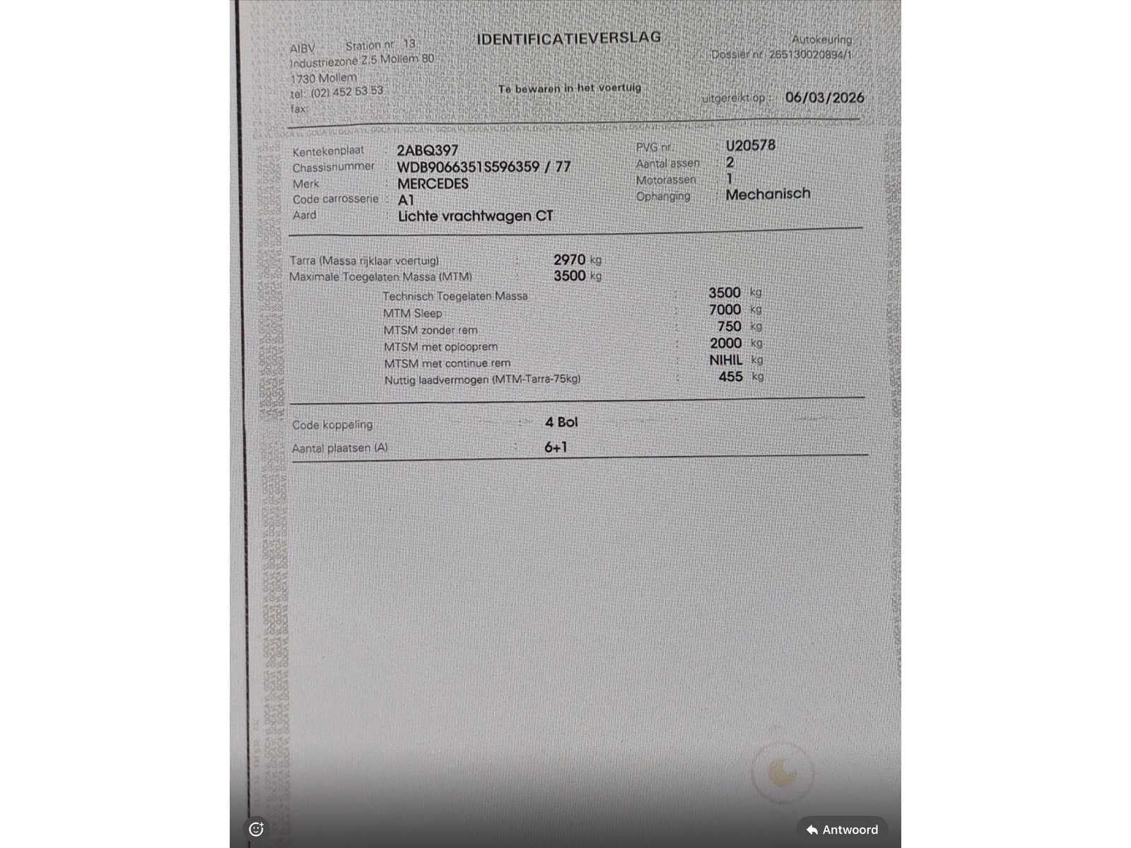 Nee Merk: Mercedes-Benz Type: Sprinter Bouwjaar: 2011 Chassisnummer: WDB9066351S596359 Afgelezen kilometerstand: 381452km Cilinderinhoud: 2143cc Vermogen (kW): 120kW Brandstof: diesel Datum eerste toelating: 04/08/2011 Aantal zitplaatsen: 7 Nationaliteit documenten: België Ledig gewicht: 2970kg Laadvermogen: 455kg Emissieklasse: Euro 5 Startinformatie: Start en rijdt Maximaal trekgewicht ongeremd: 750 Maximaal trekgewicht geremd: 2000